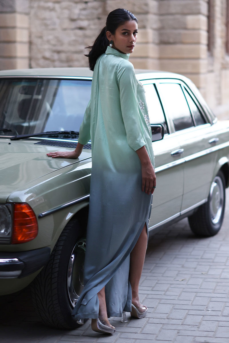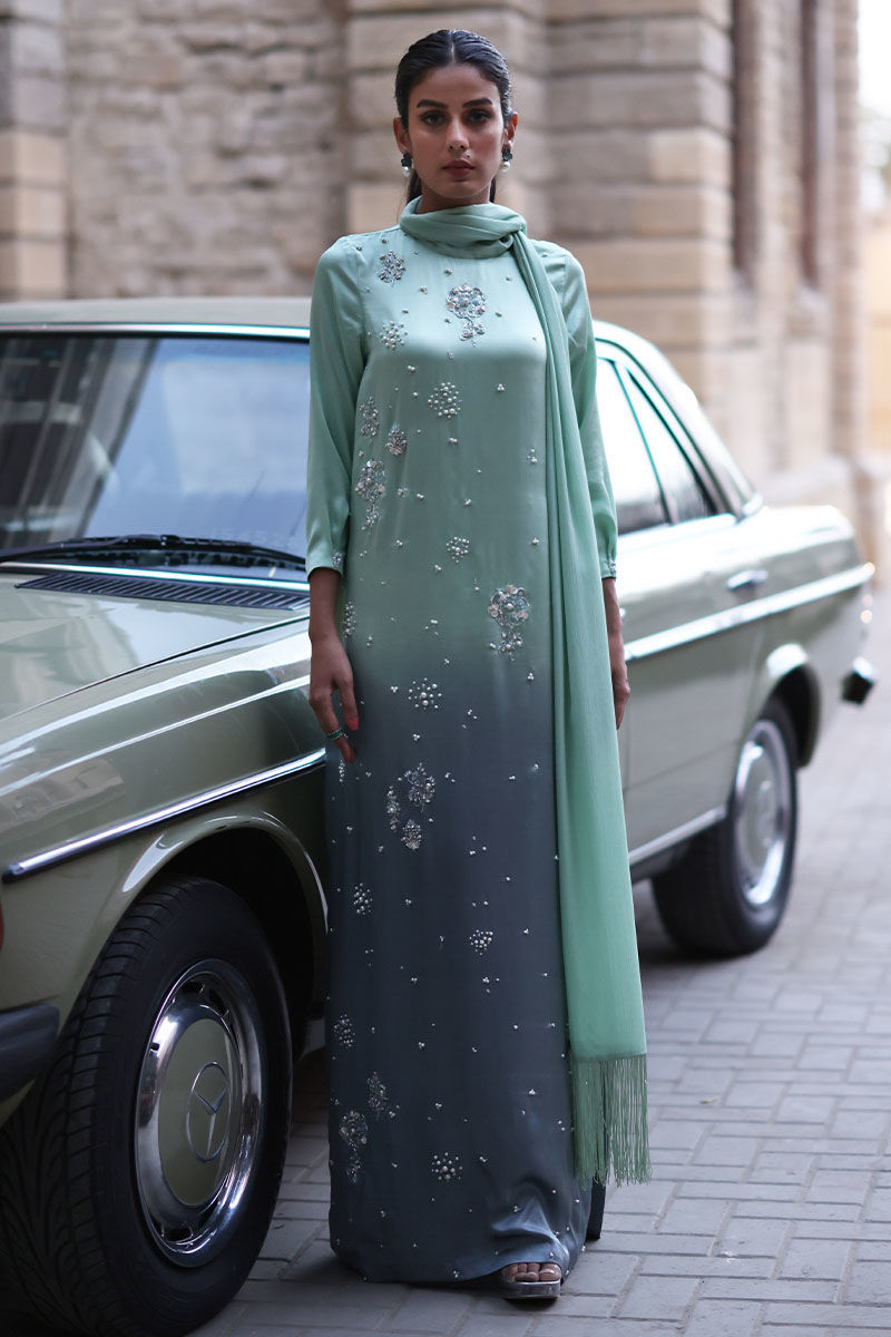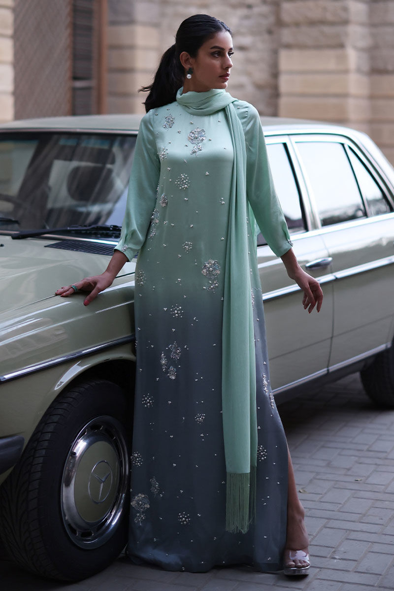 A refreshing shade of spring bud in an ombre touch of grey. comfortable and wearable for any size and shade. This pure charmeuse outfit is adorned with beads, pearls, stones, and zardozi handwork all over the front. Additionally attached stole with tassels makes this outfit more stylish.