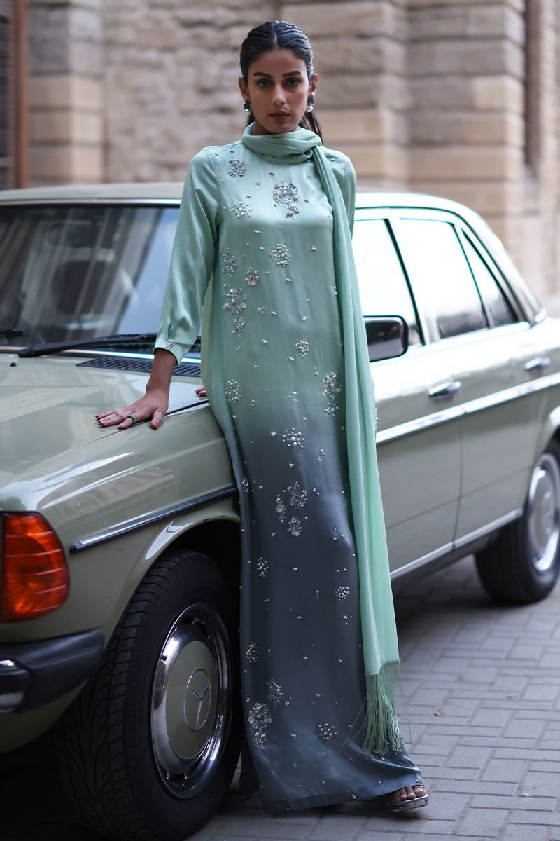 A refreshing shade of spring bud in an ombre touch of grey. comfortable and wearable for any size and shade. This pure charmeuse outfit is adorned with beads, pearls, stones, and zardozi handwork all over the front. Additionally attached stole with tassels makes this outfit more stylish.