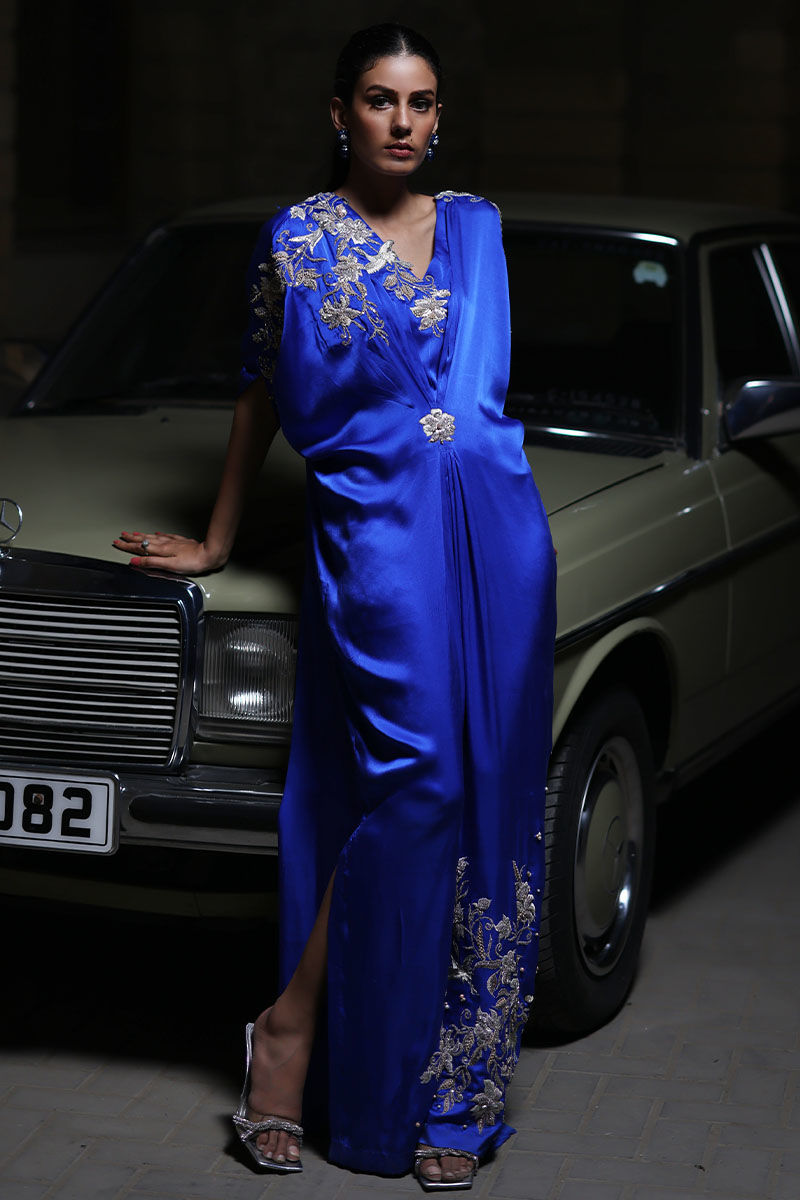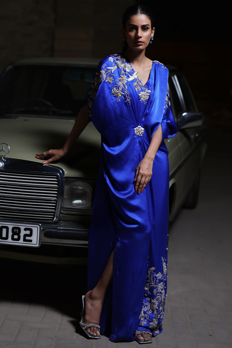 The kaftan, cut from pure charmeuse in this royal blue shade is adorned with embroidered resham, pearls, stones, cut dana, and sequence on shoulders, neckline, sleeves, and daman.