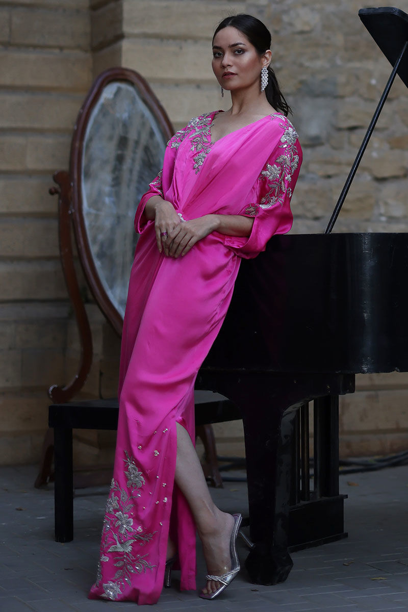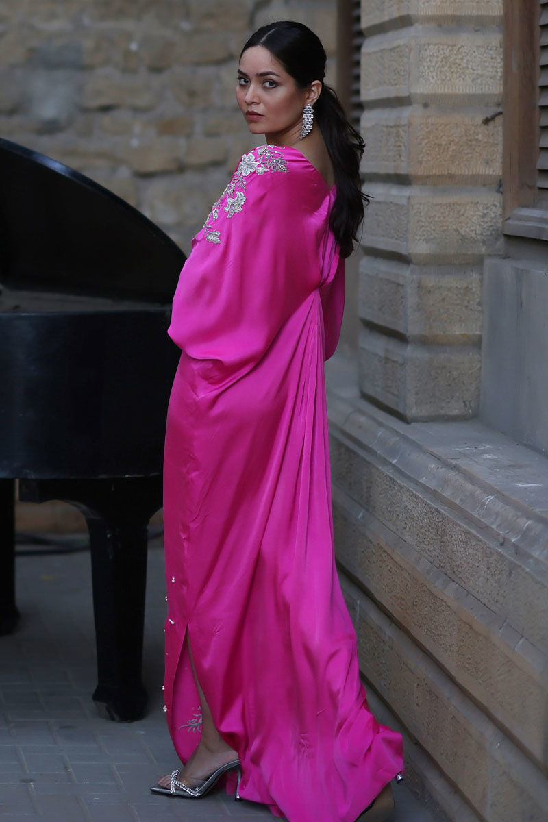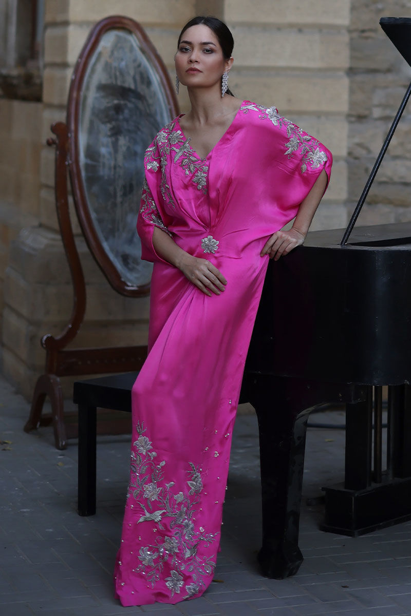 The kaftan, cut from pure charmeuse this candy pink color shade is adorned with embroidered resham, pearls, stones, cut dana, and sequence on shoulders, neckline, sleeves, and daman.