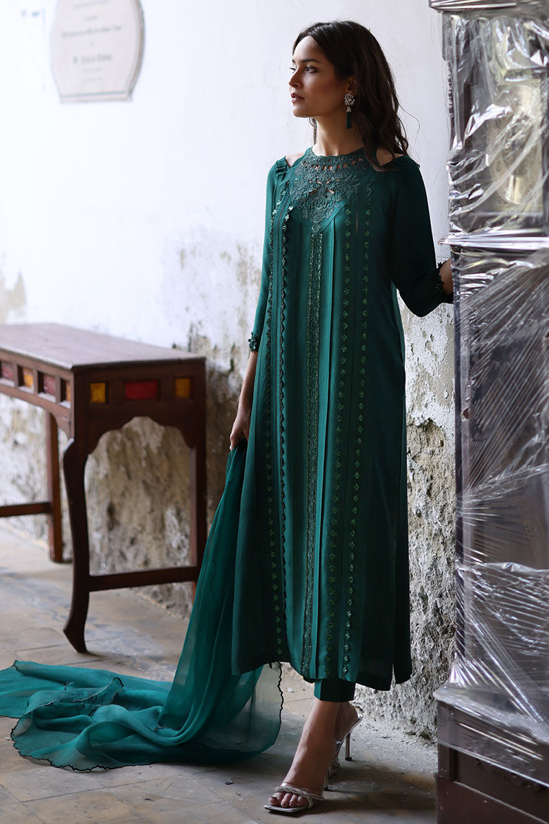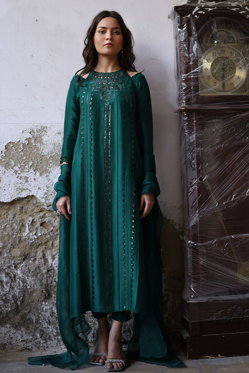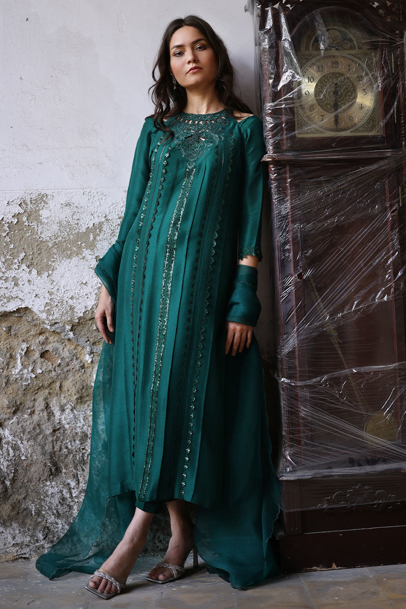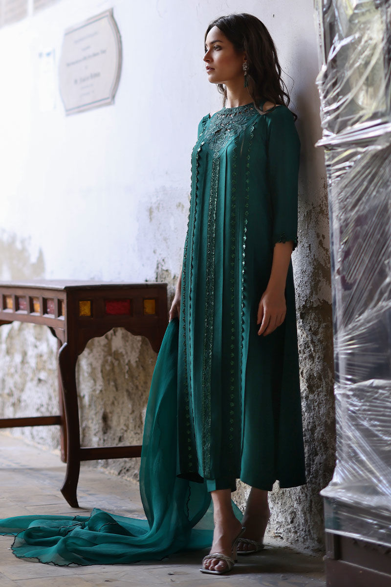 This season's most irresistible trend is the new-age pleats and long shirts with high slits in a refreshing pine needle tone. The shirt is adorned with resham embroidery self-tone in front, pleats, and laces all over the shirt. This elegant shirt is paired with "Pure Raw Silk Pants. Finish the look with a pure organza resham embroidered dupatta with scallops and embroidered corners.