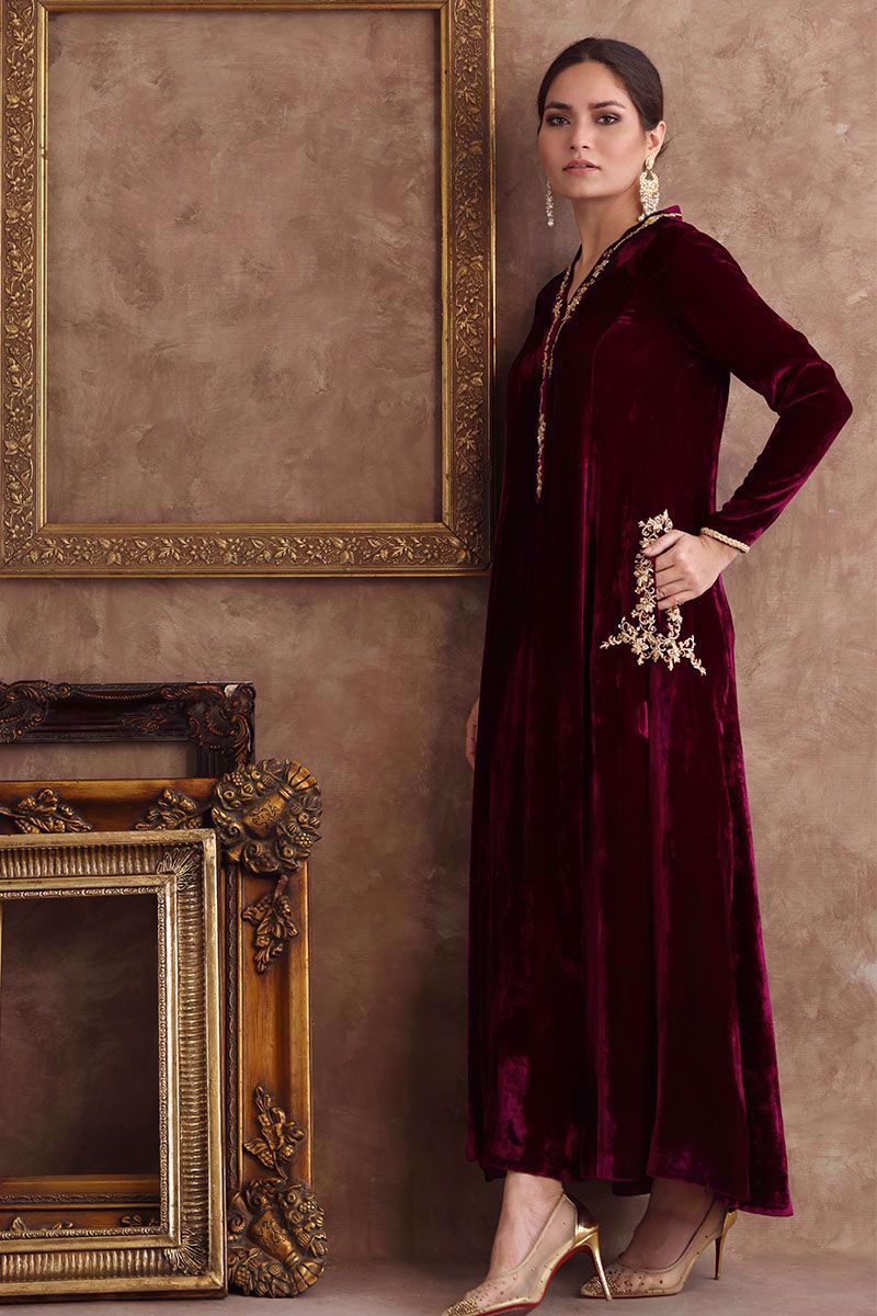 Deep and beautiful plum color pure velvet shirt in a prince panel cut is an elegant and richful piece. The shirt has uplifted with refine zardozi and gota work on neckline, pockets and sleeves. It is paired with pure raw silk pants in same color and fancy crush organza dupatta, to be purchased at additional cost.