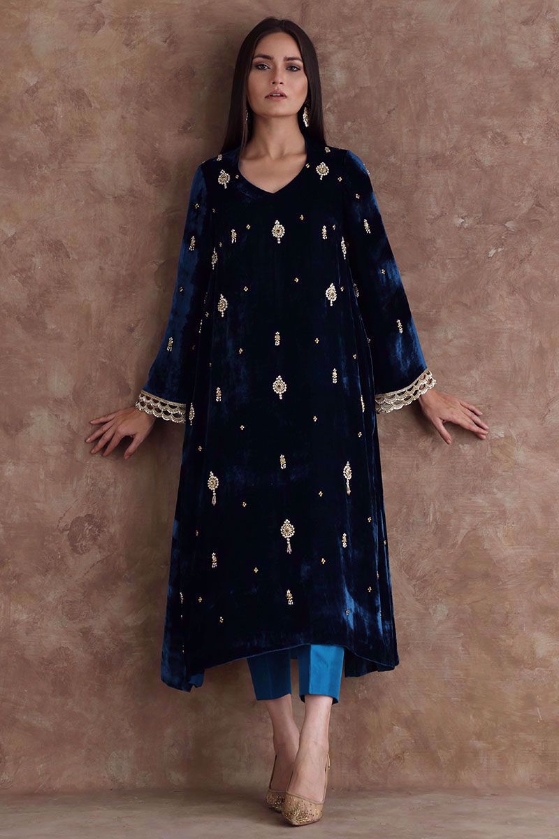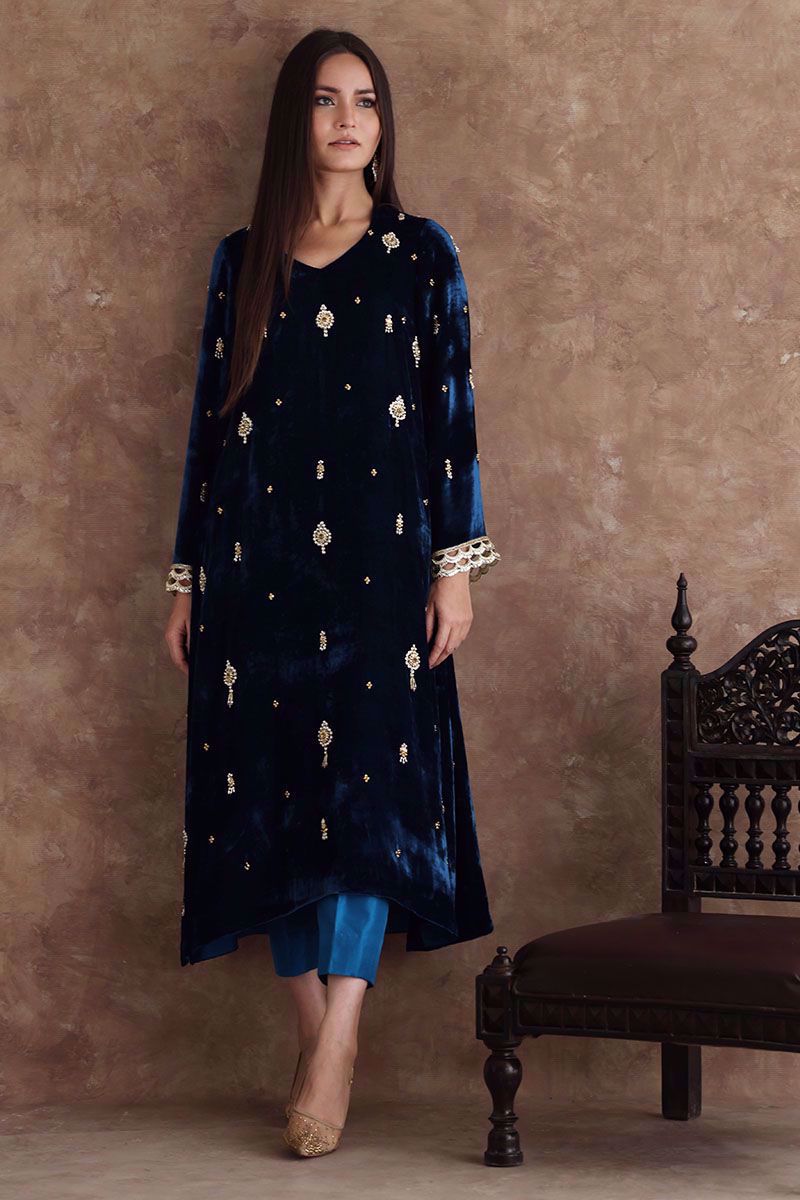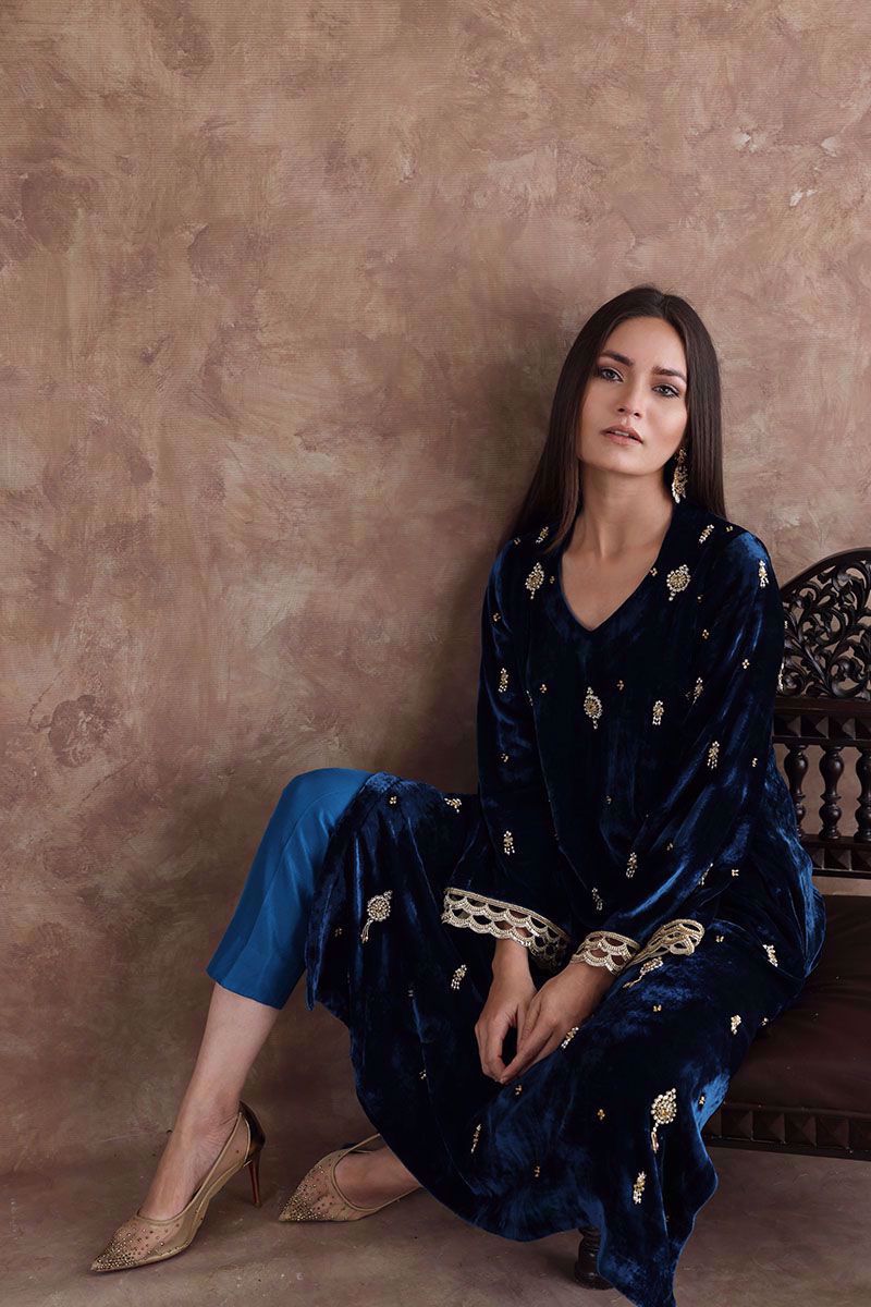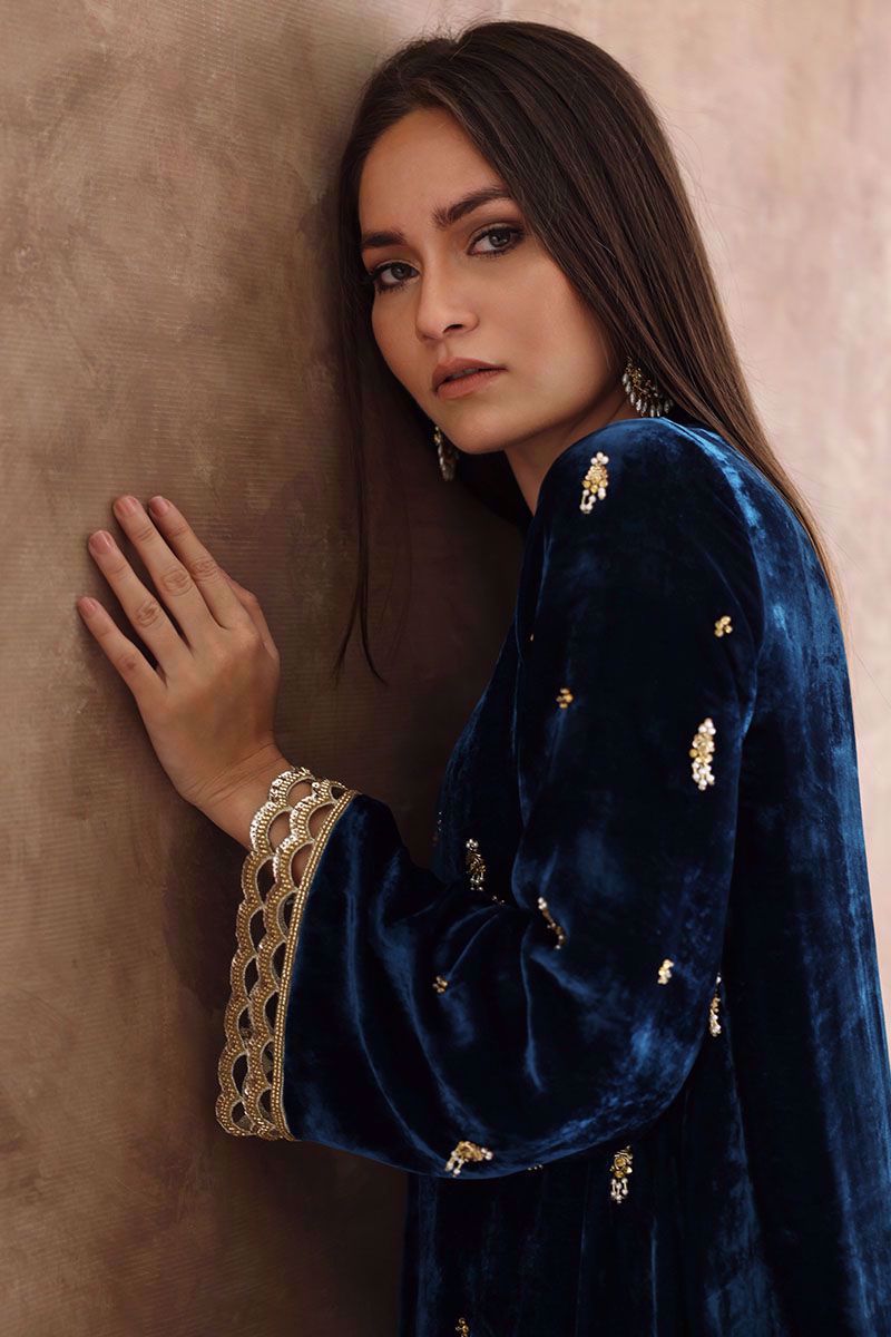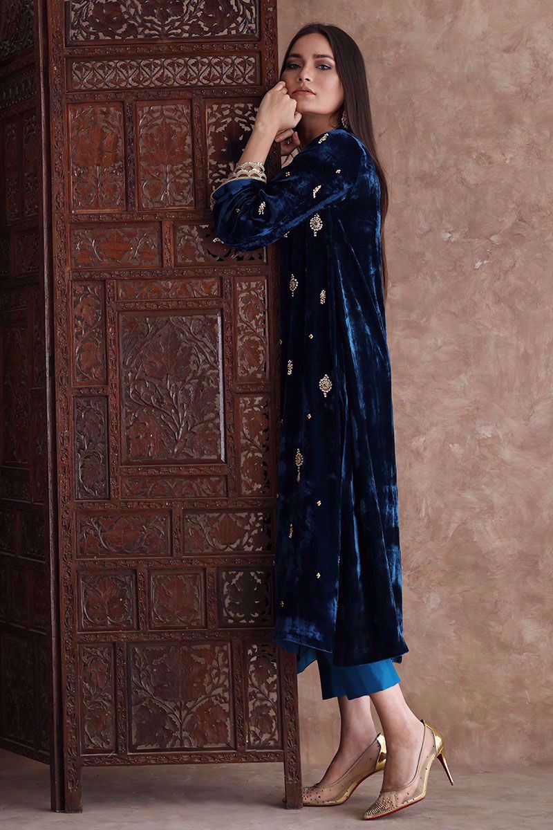Color: Teal Fabric: Velvet Work Details: Embellished