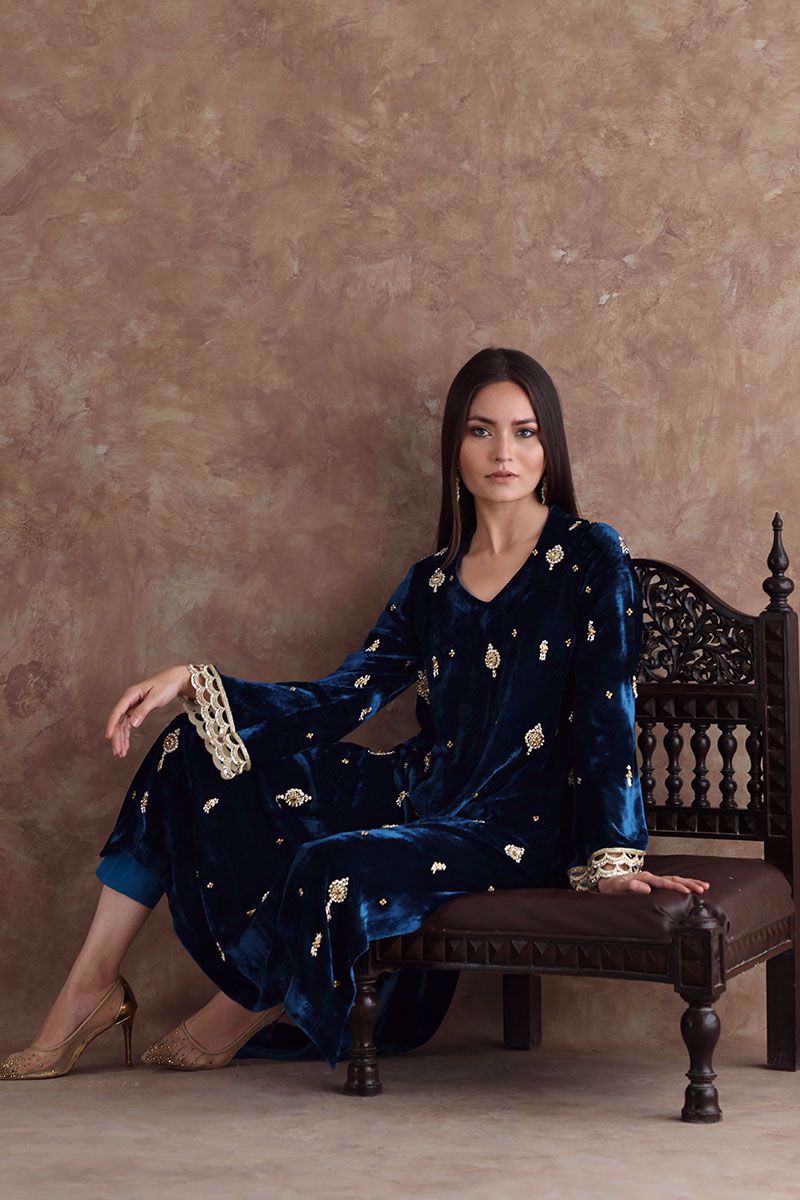 Turkish teal pure velvet shirt enriched with gold hand work. The shirt has jewels inspired motifs comprised with resham, nakshi and sequins all over the shirt and sleeves. The look is completed by giving same color pure raw silk pants, can be bought at additional cost.