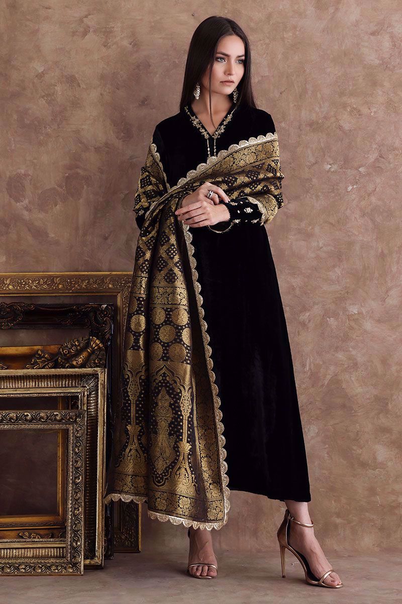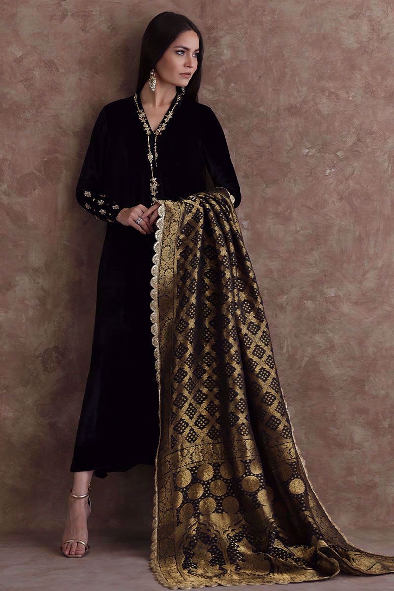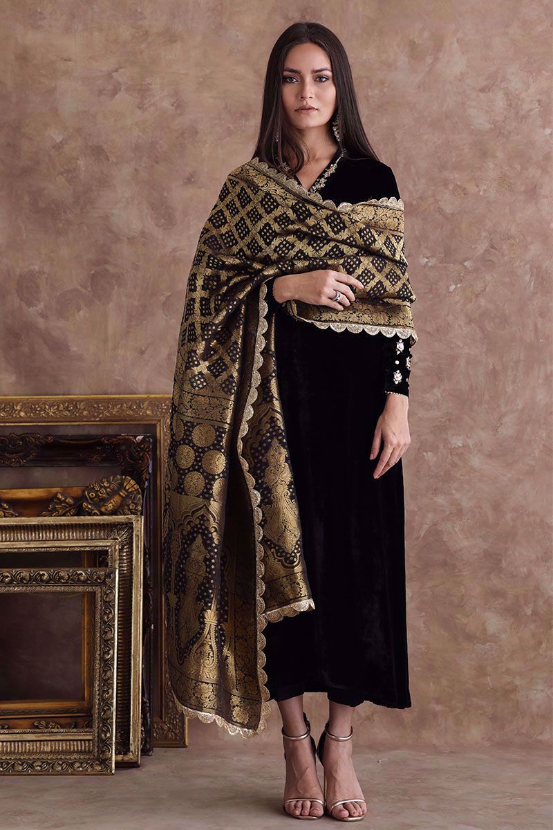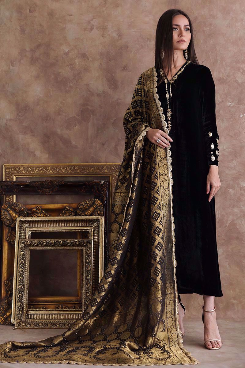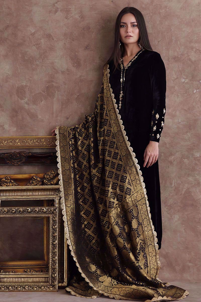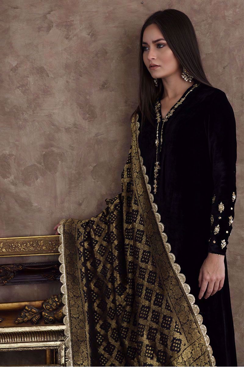 This black pure velvet long shirt is a must have for winters wardrobe with delicate handwork of zardozi, gota and sequins on neckline and sleeves. Matching color chiffon banarsi dupatta and same color pure raw silk pants are given on additional cost to give a regal look to the attire.