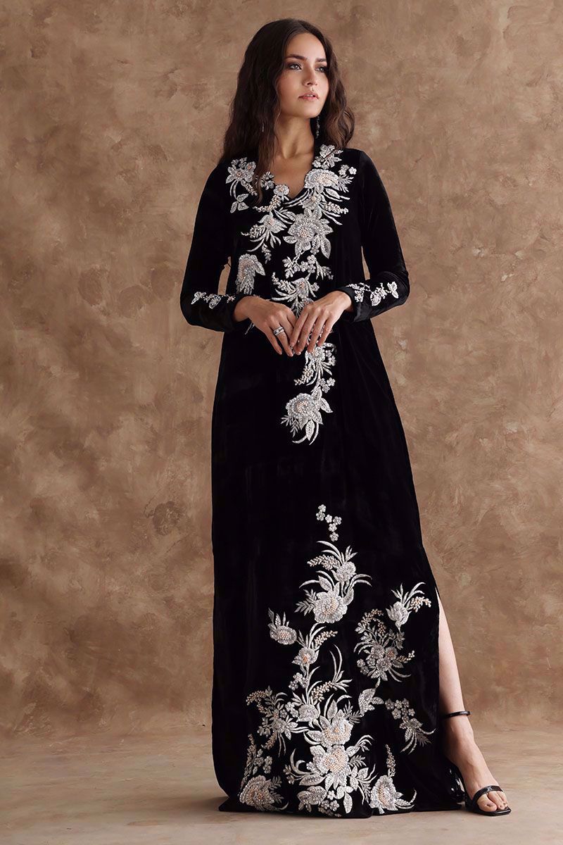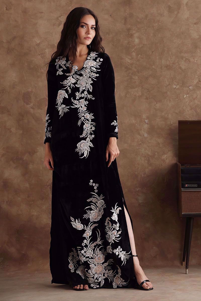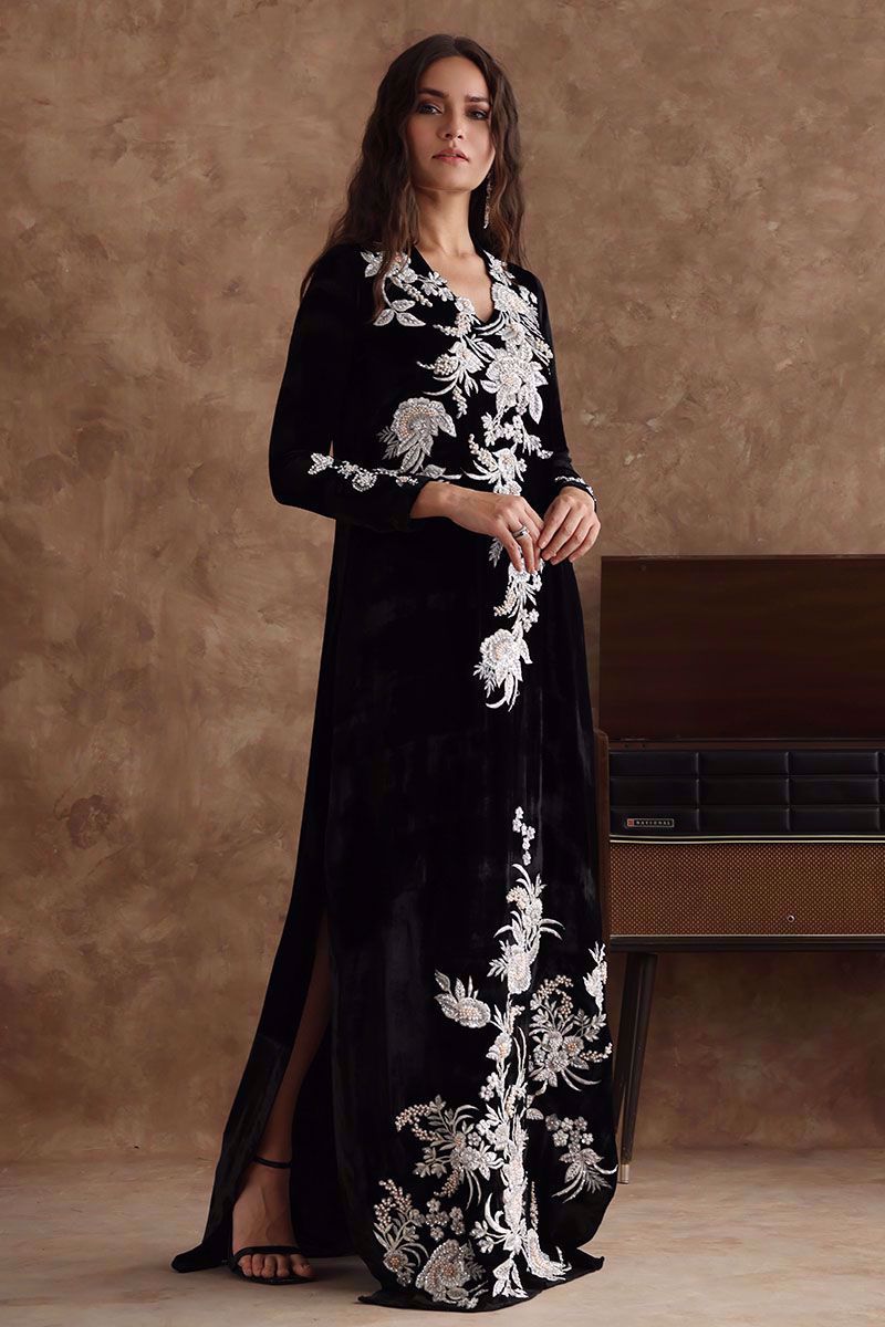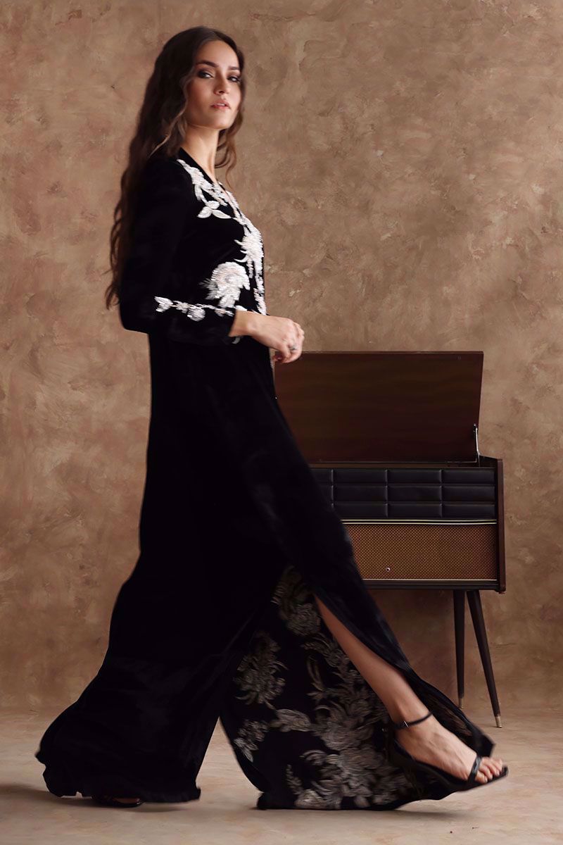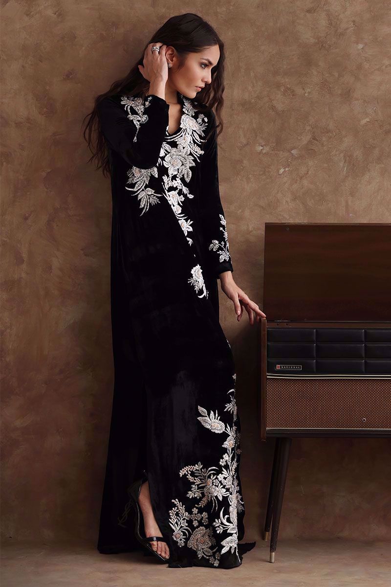Black majestic kaftan in pure velvet is a perfect attire for winter evenings. The kaftan is aesthetically embroidered with resham, cut dana, sequins, and bead work, to create a subdue look.