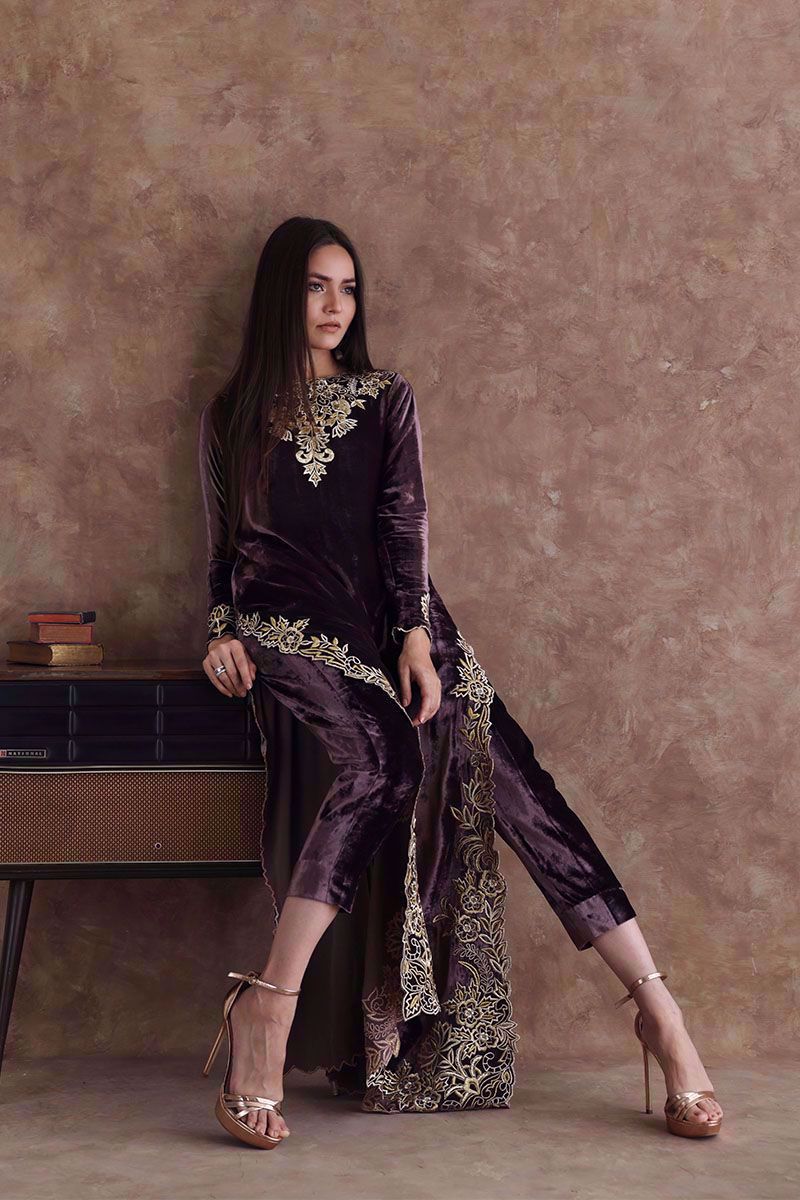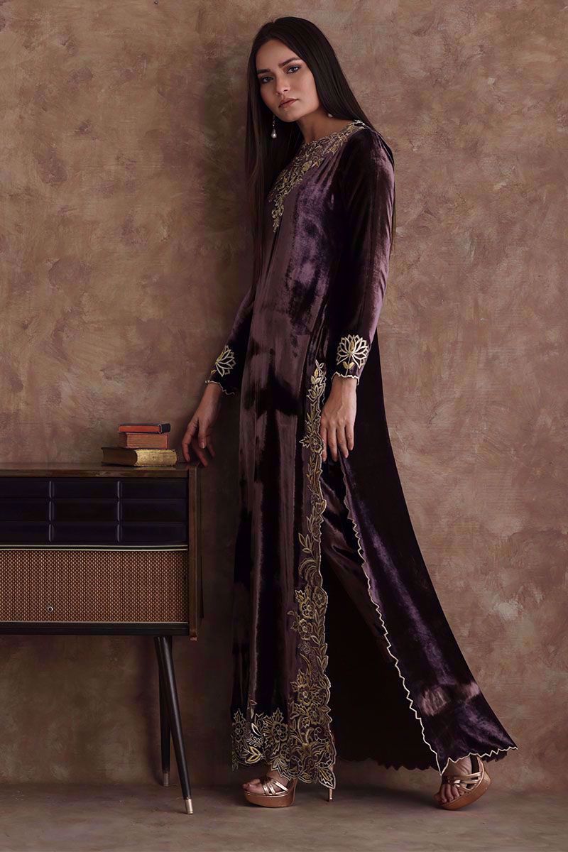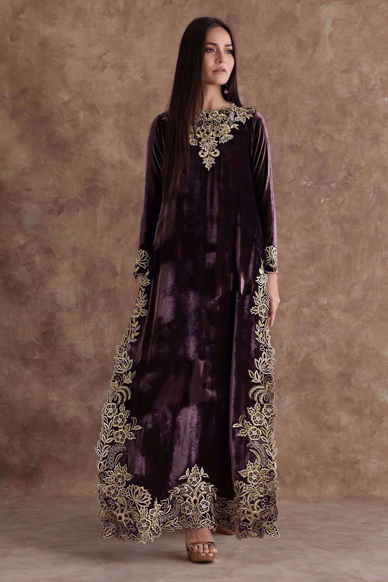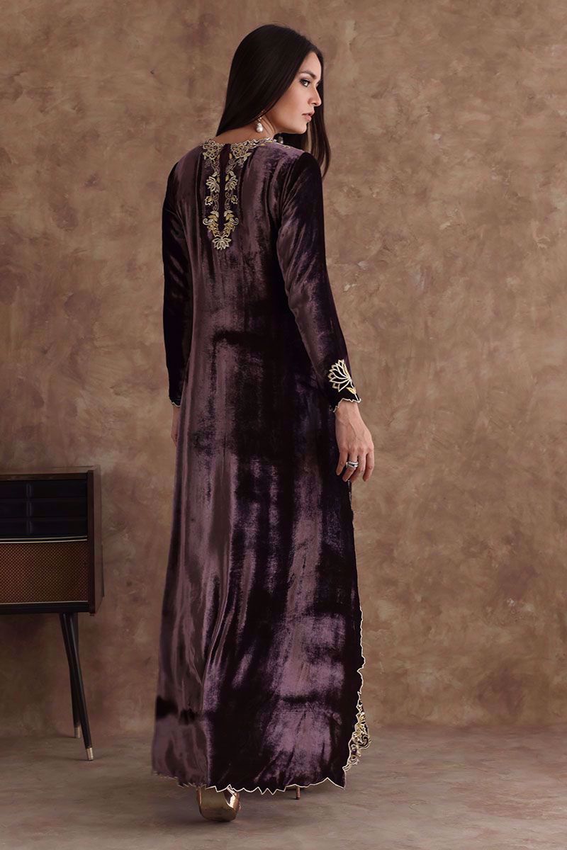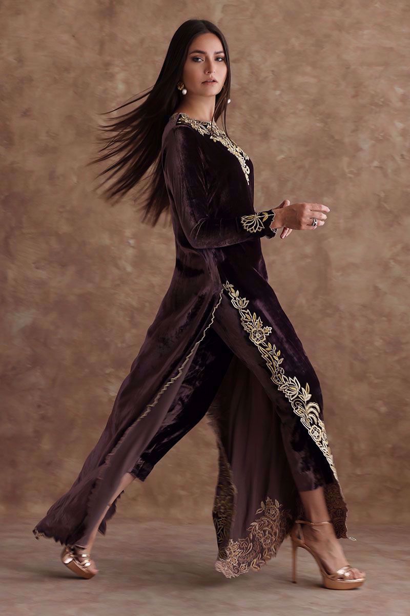 A beaming taupe pure velvet floor length shirt designed with beautiful zari thread embroidery and organza comprising of various stitches making floral patterns all over the shirt maintaining the classic look. It is paired with same color pure velvet pants which can be purchased separately.