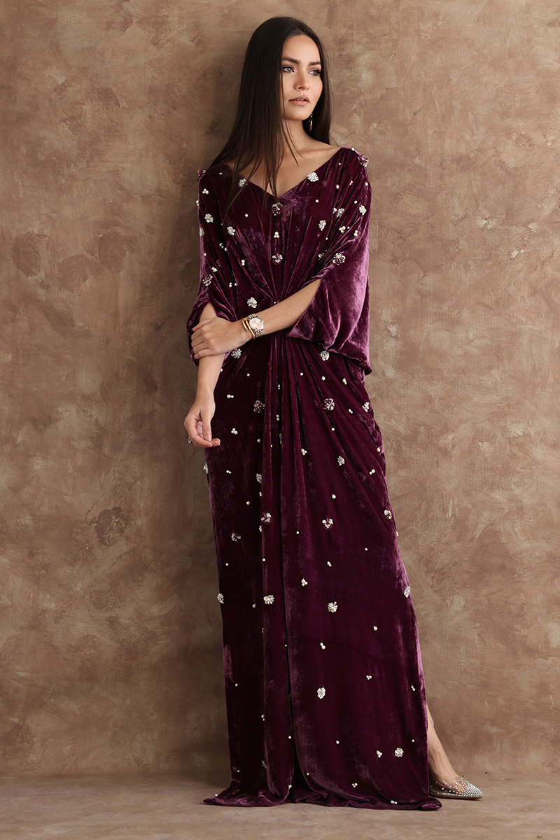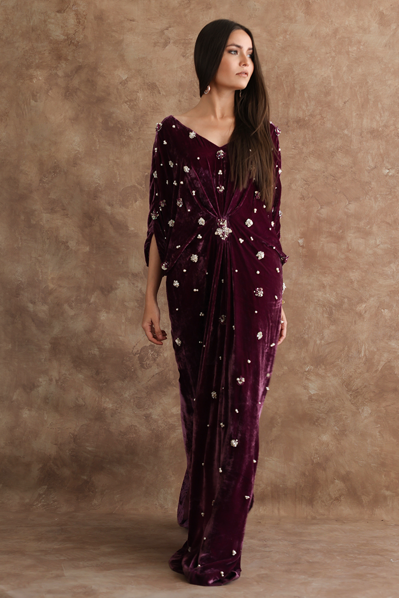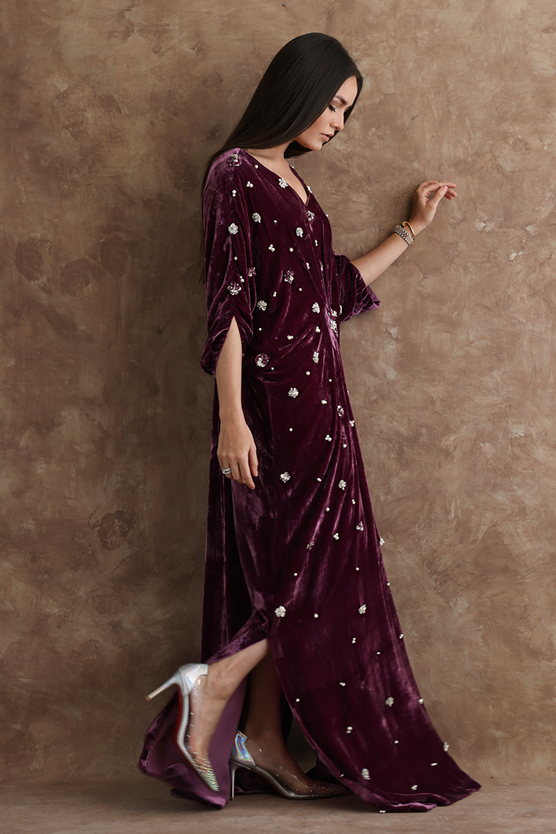 Resplendent mauve kaftan in pure velvet is a statement symbol. A combination of sequins, beads, crystals and 3D flowers are scattered all over the front and sleeves giving a trendy yet classical look to the outfit.