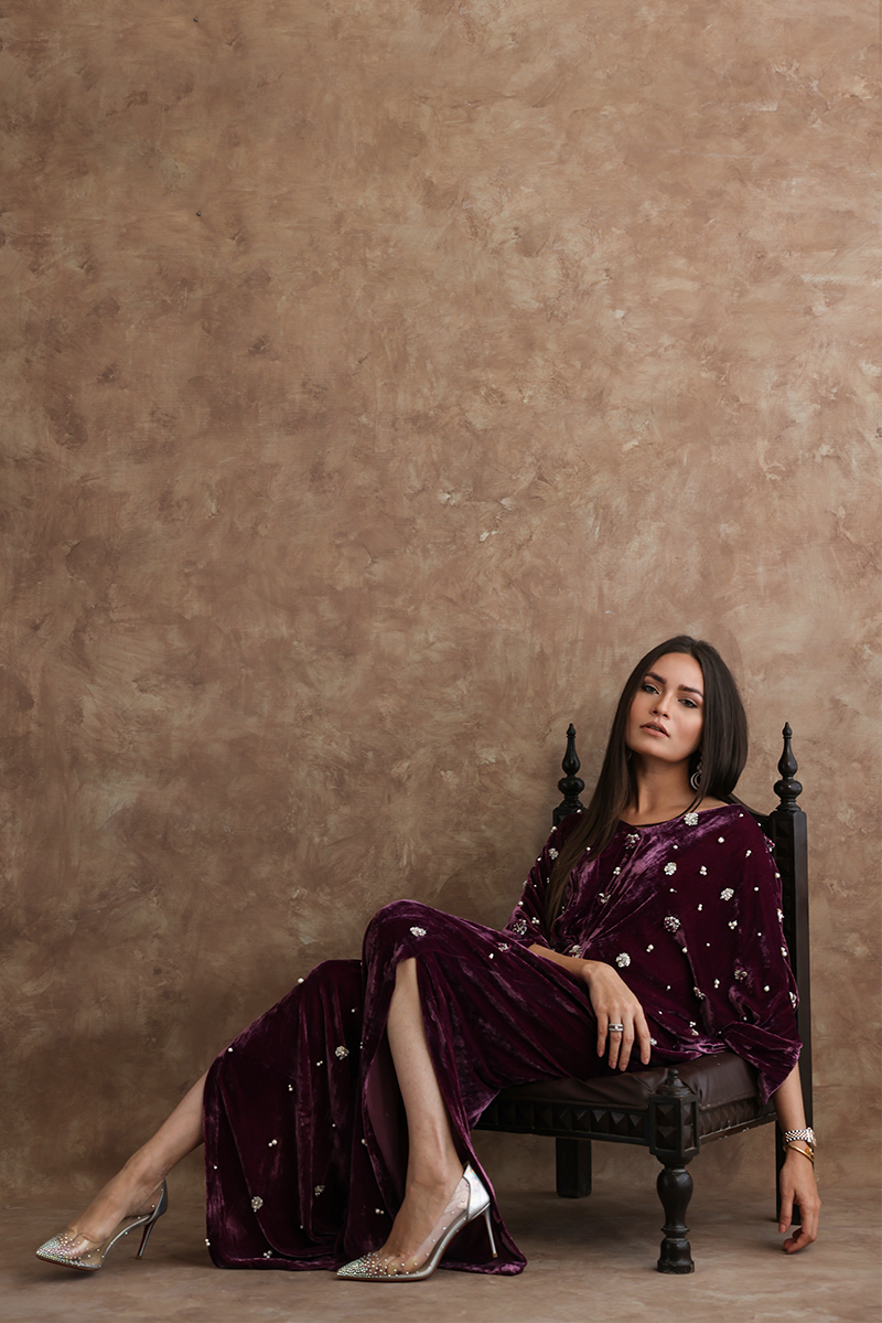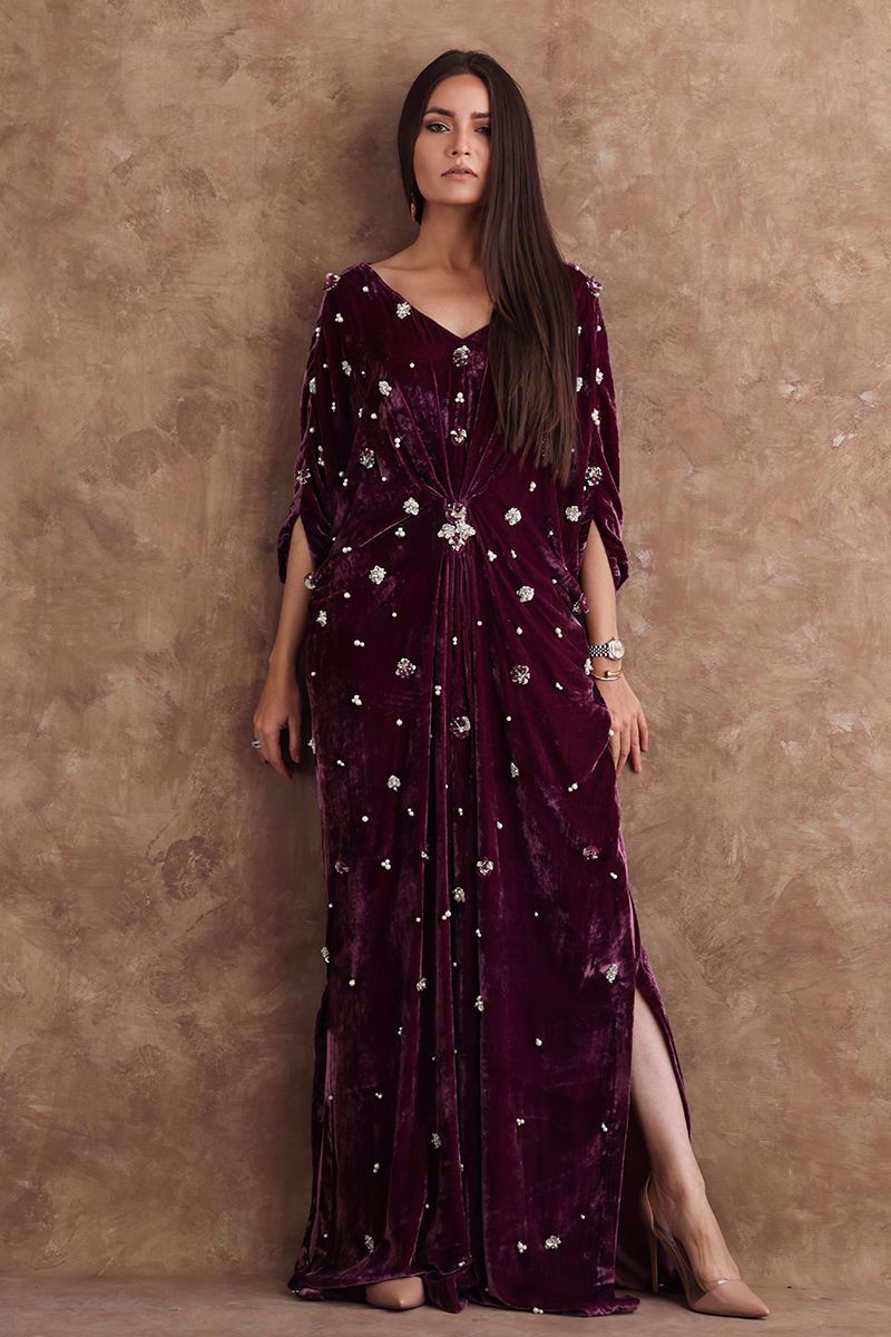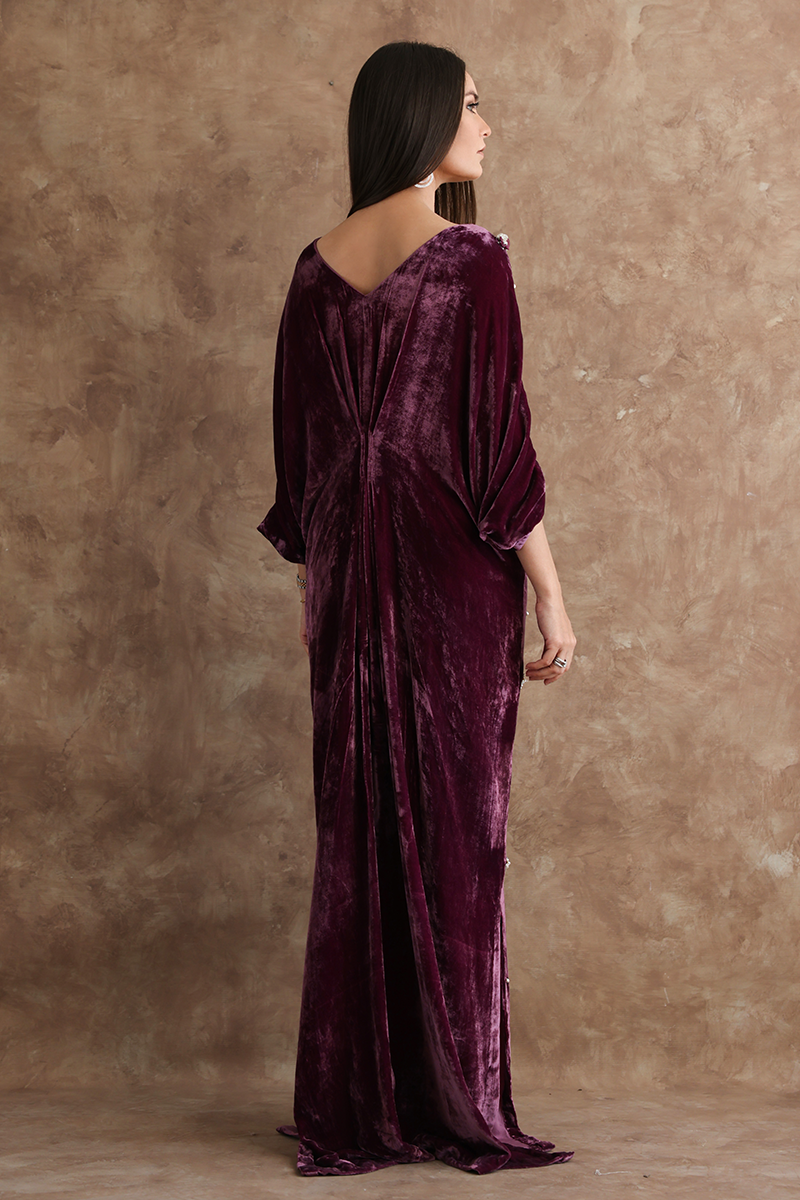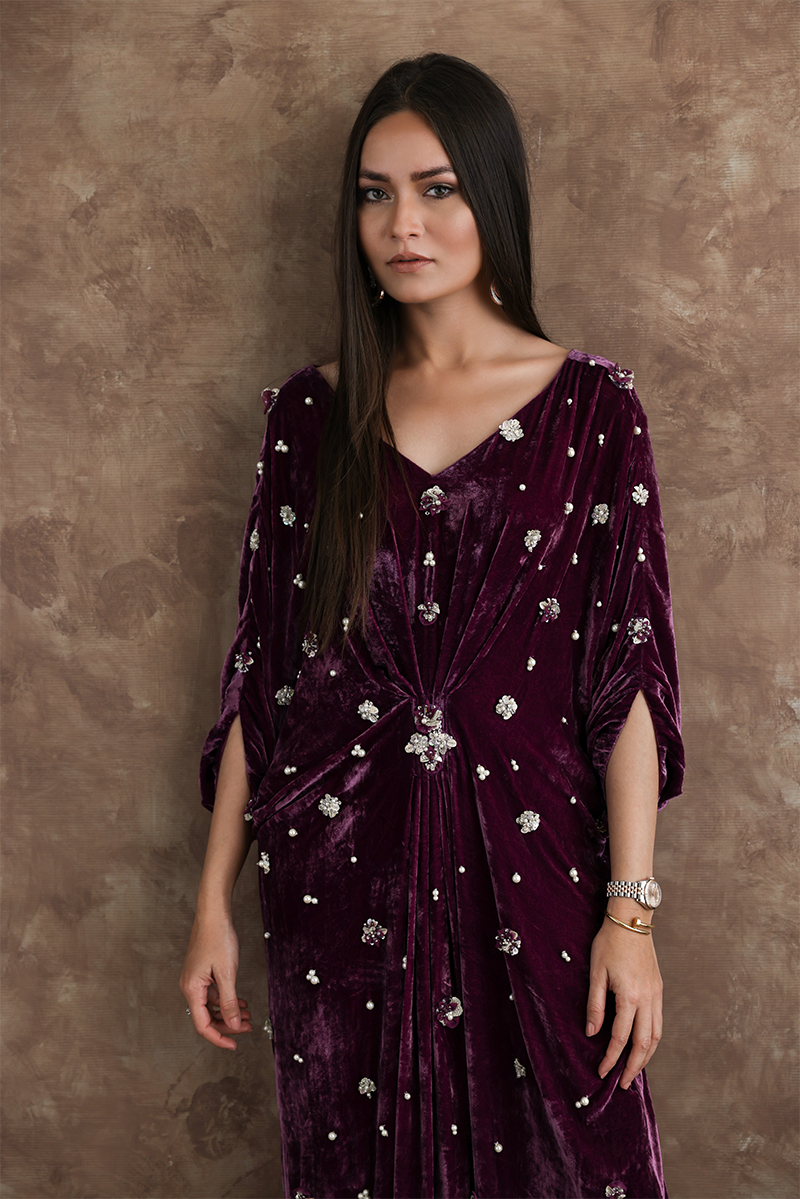 Resplendent mauve kaftan in pure velvet is a statement symbol. A combination of sequins, beads, crystals and 3D flowers are scattered all over the front and sleeves giving a trendy yet classical look to the outfit.