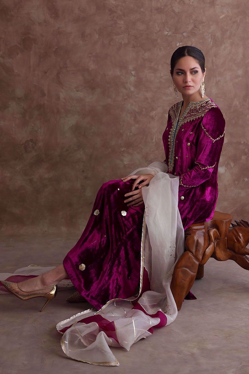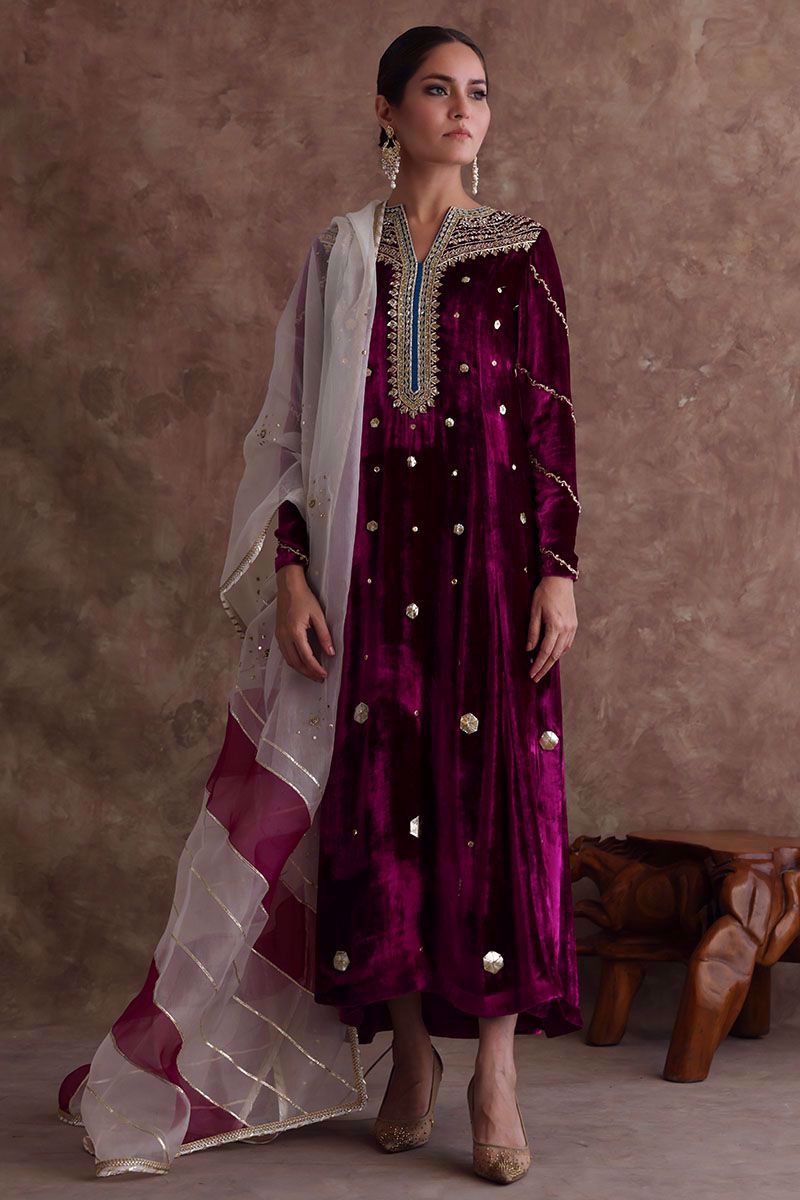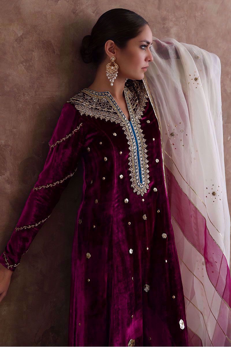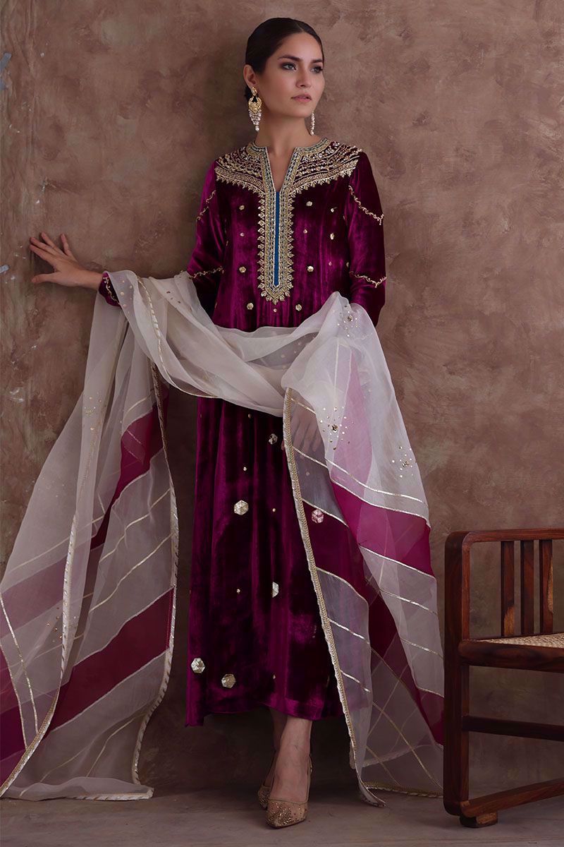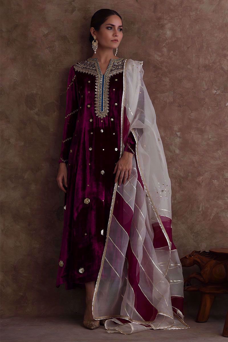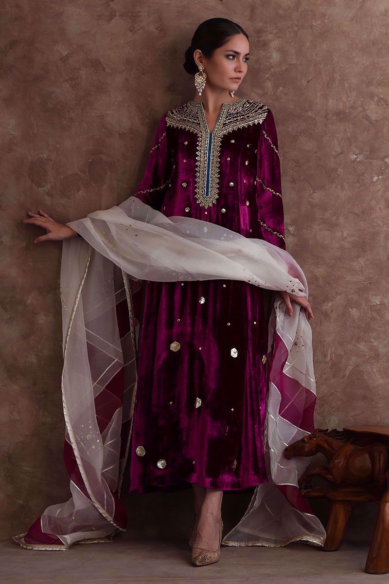 Pure velvet festive fuchsia long shirt beautified with intricate zardozi, naqshi, dabka, crystals and gota on neckline, further enhanced with hexagon shape gota booti all over the shirt. Ivory colored pure organza dupatta with color blocking of festive fuchsia, styled with gota and sequins work all over it and same color pure raw silk pants can be purchased at additional cost.
