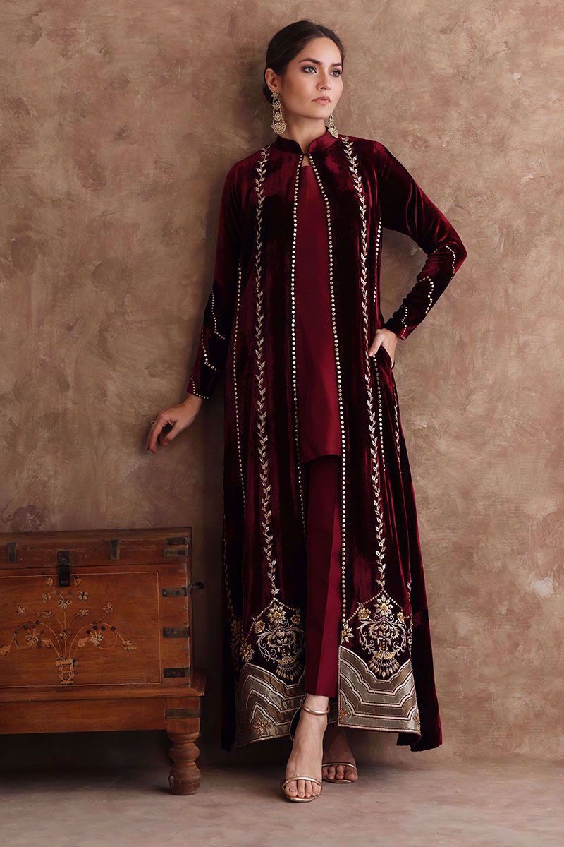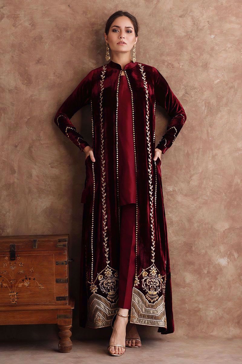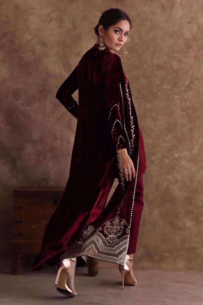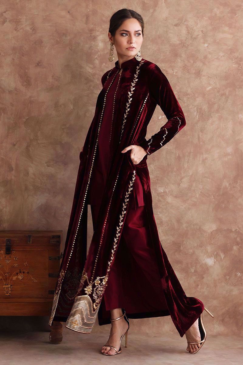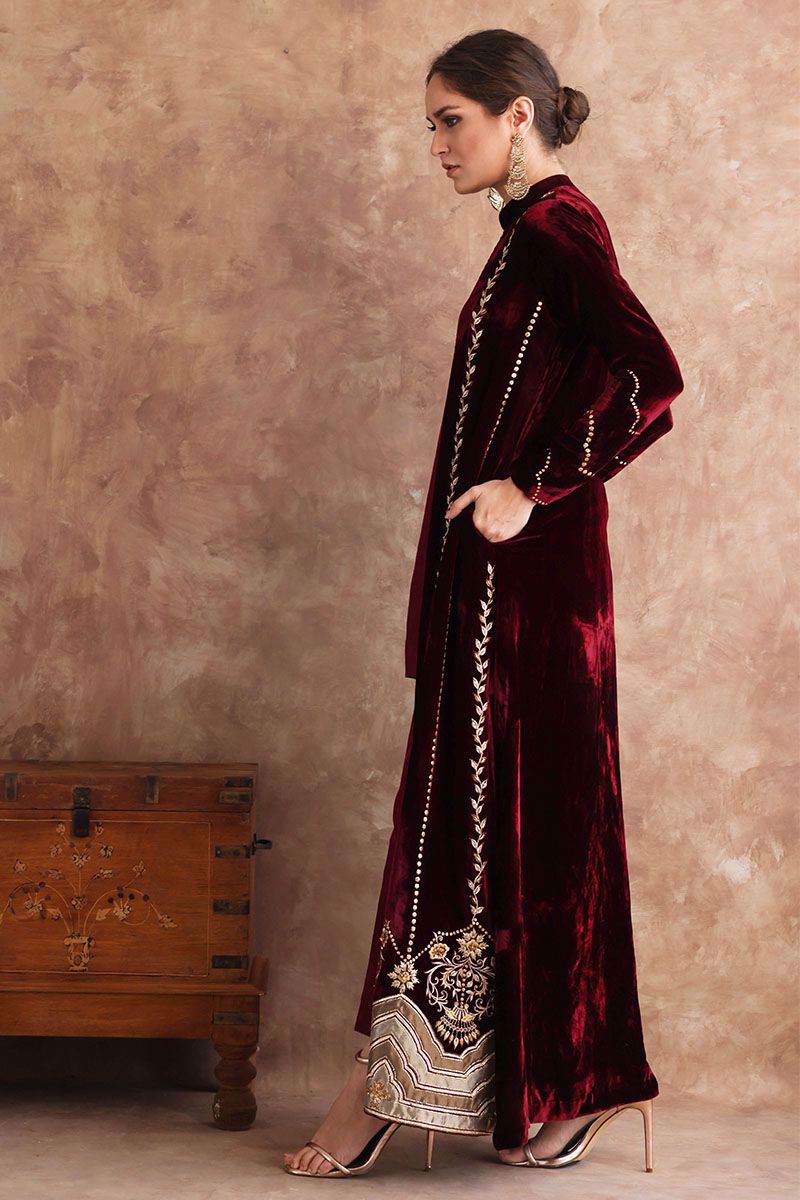 Long pure velvet jacket in ruby wine color. Brilliantly designed border with fine embroidery of zari work, gota, sequins and aesthetically added applique work inspired by arches. The jacket is further beautified with exquisite zari and sequins work which brings together a ravishing outfit. The attire is paired with pure raw silk pants in matching color can be purchased at additional cost.