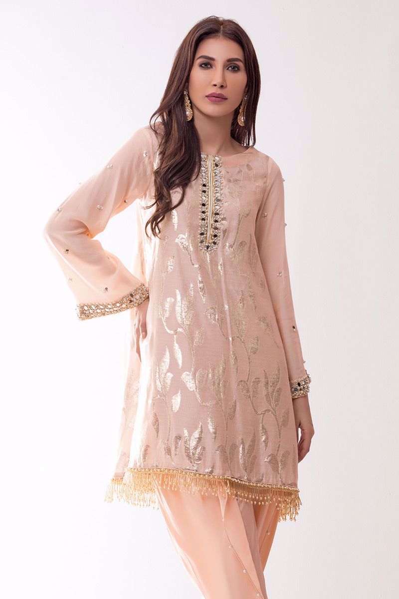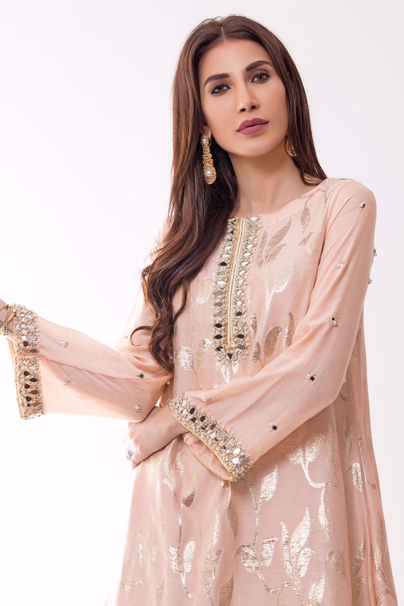 Peach khadi net Banarsi Top intricately hand worked with kora, dabka, sheesha, moti, pearls and gota on neckline and all over sleeves is the perfect pick of the season.
