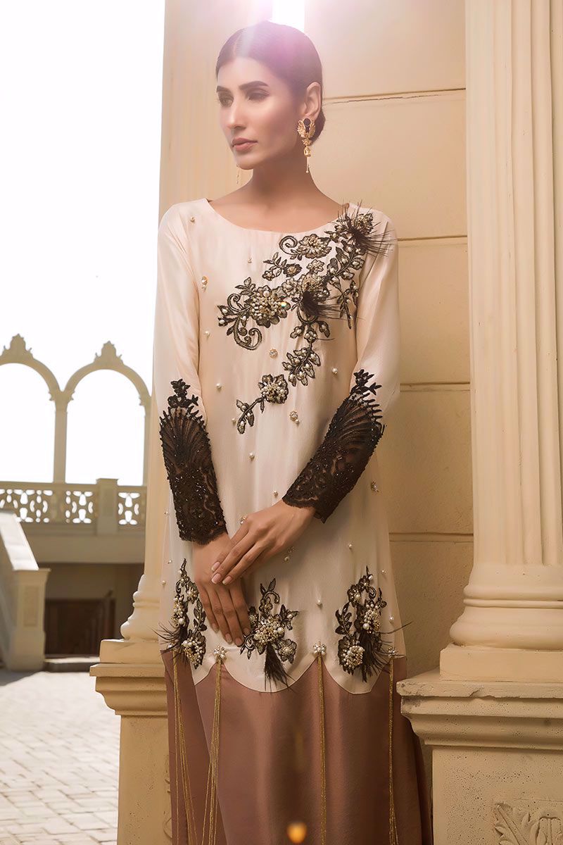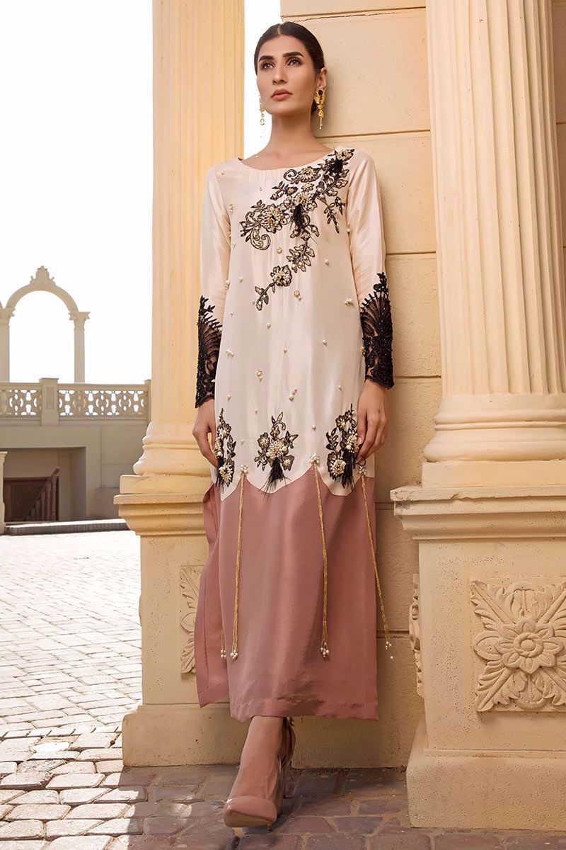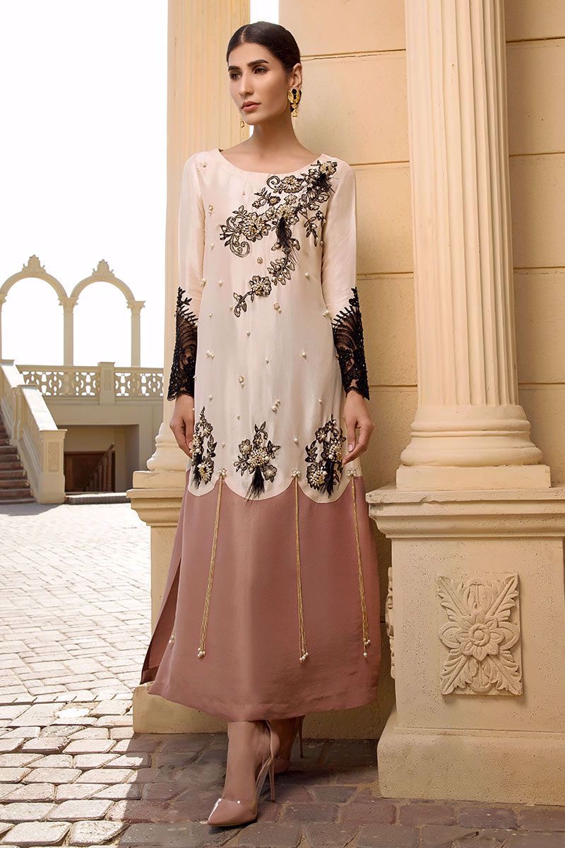 Meet our color blocked long Shirt in breathtaking shades of Pearled Ivory with nude pink color blocking crafted with stonework, pearls, cut dana, pearl hangings, Chantilly lace finished with intricate embellishments and feathers along with cut dana detailed net sleeves. Black stretchable Pants finished with black organza and pearl hangings can be bought separately to complete the look.