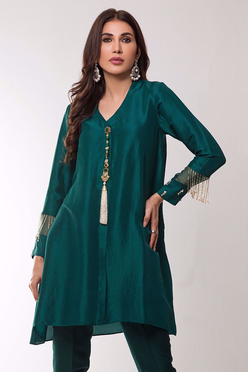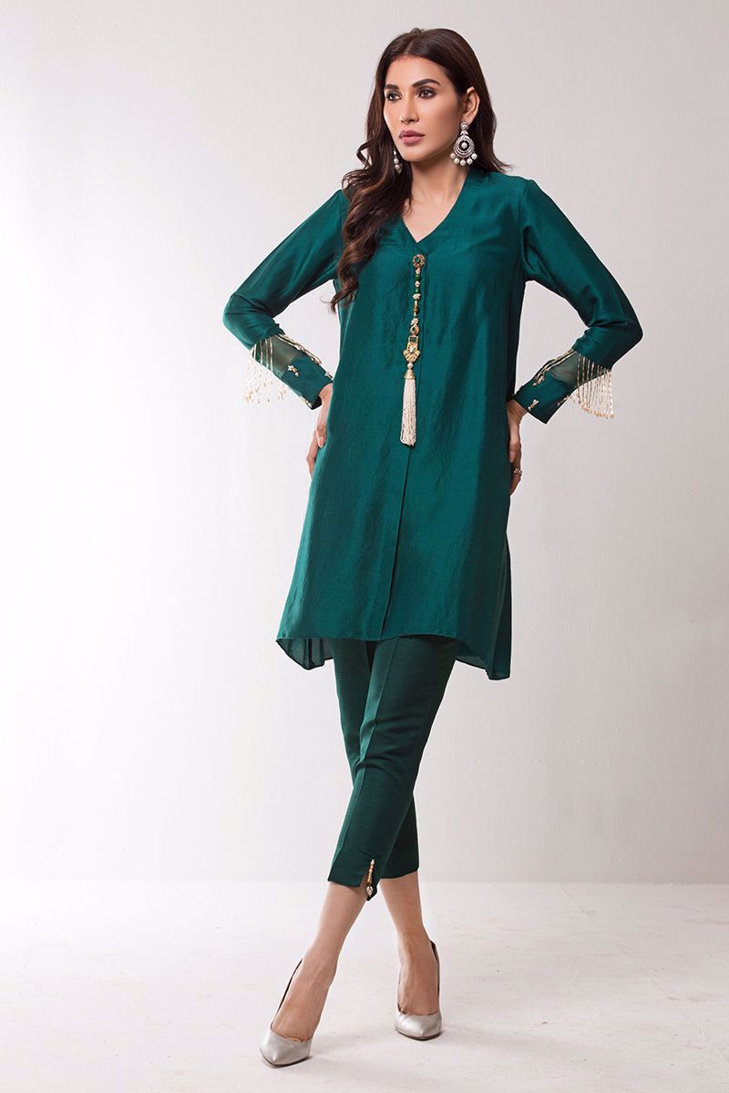 Bottle green pure raw silk Kurta beautifully embellished with Indian jeweled motifs on front and trendy handwork on sleeves