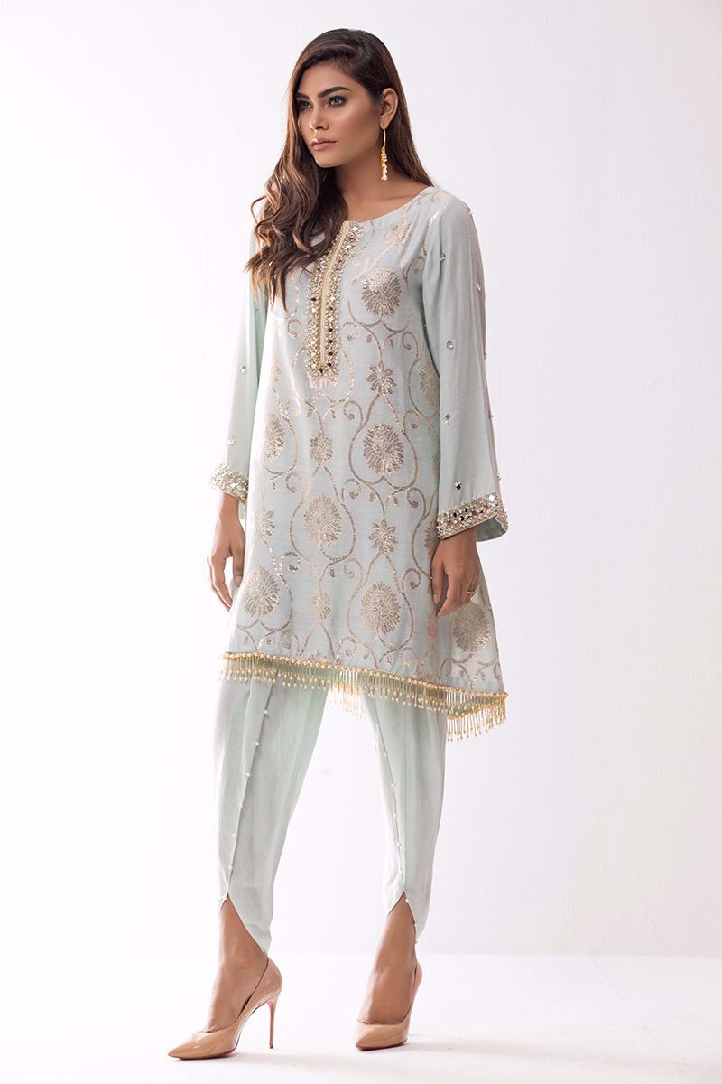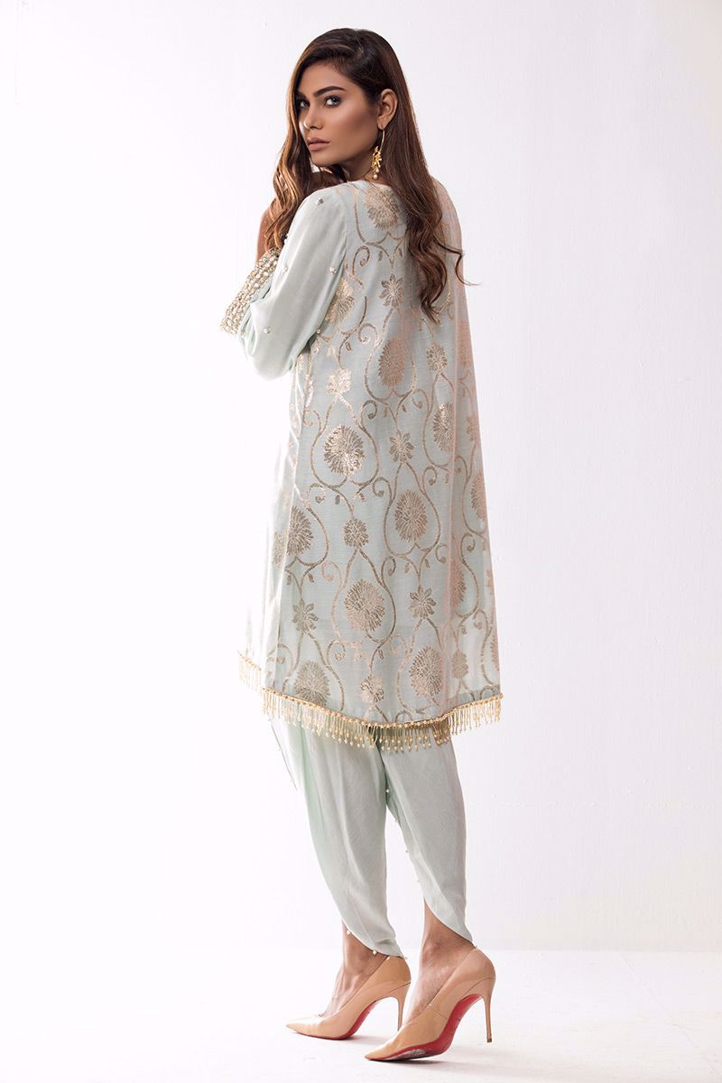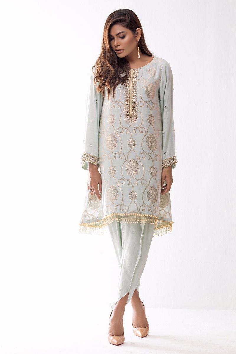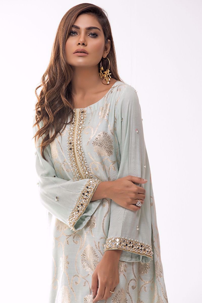 Mint colored khadi net Banarsi Top intricately hand worked with kora, dabka, sheesha, moti, pearls and gota on neckline and all over sleeves is the perfect pick.
