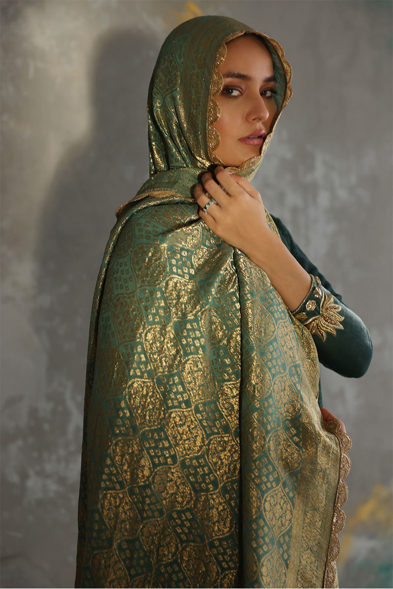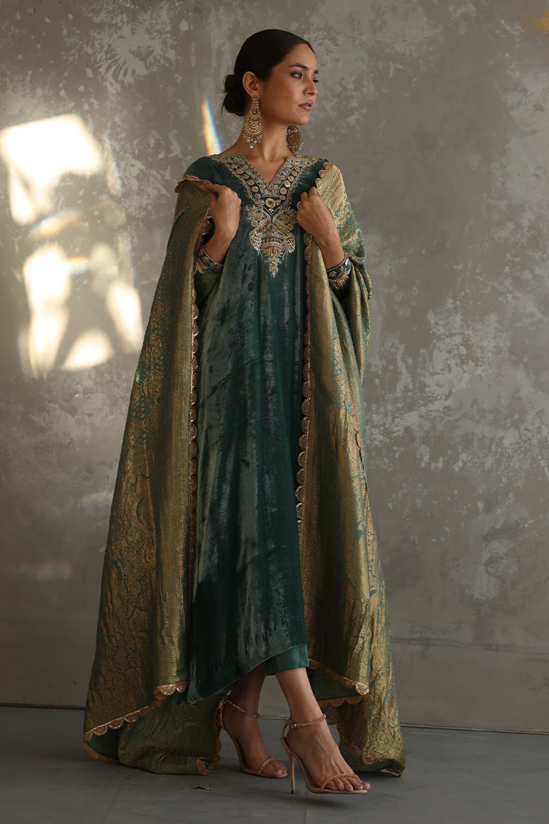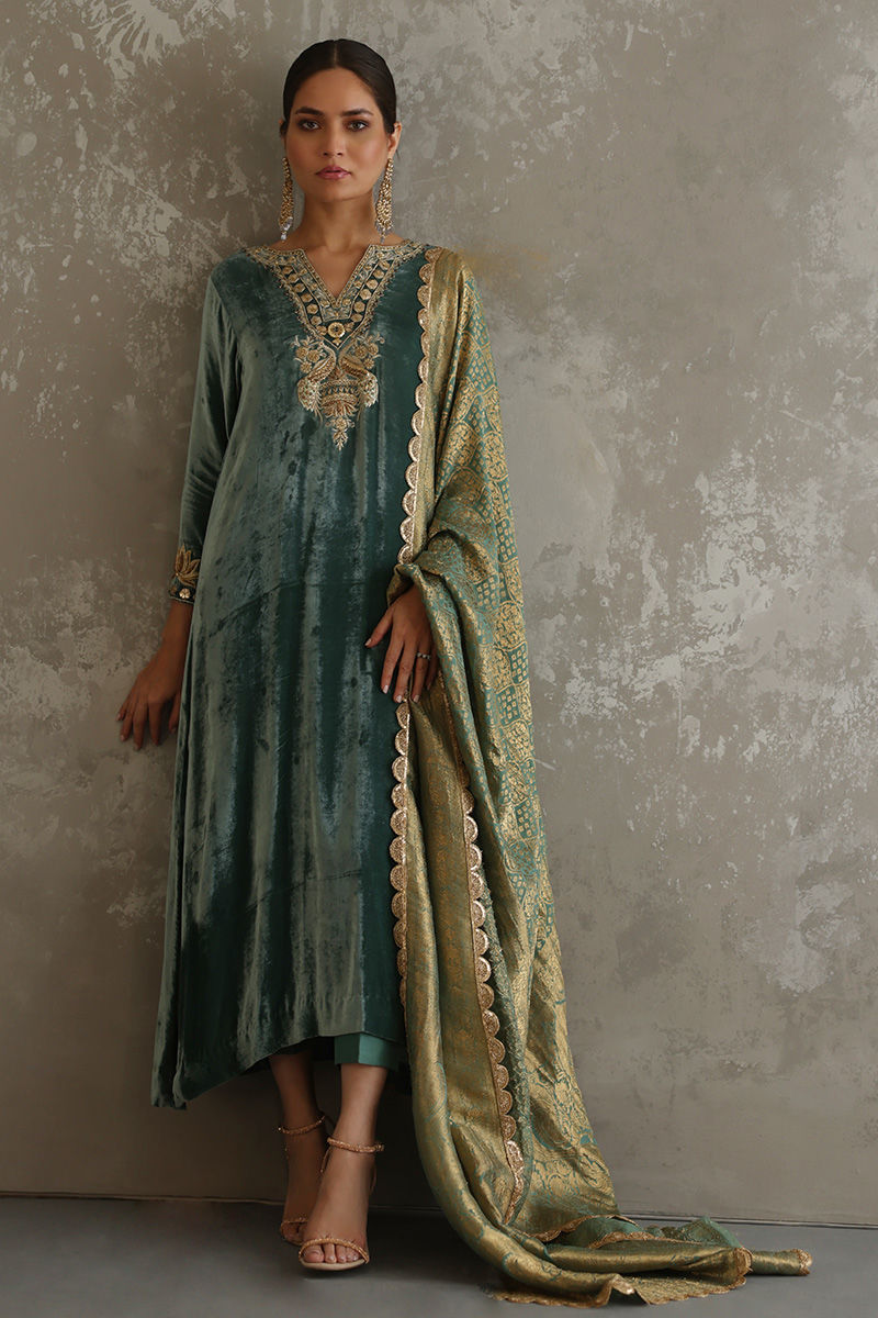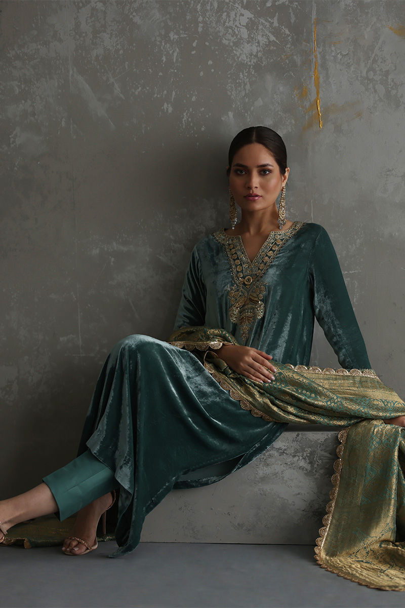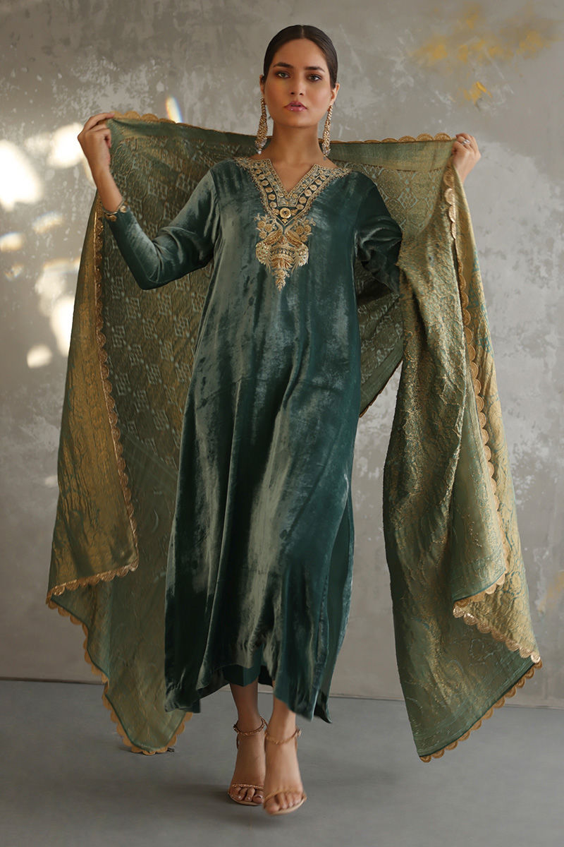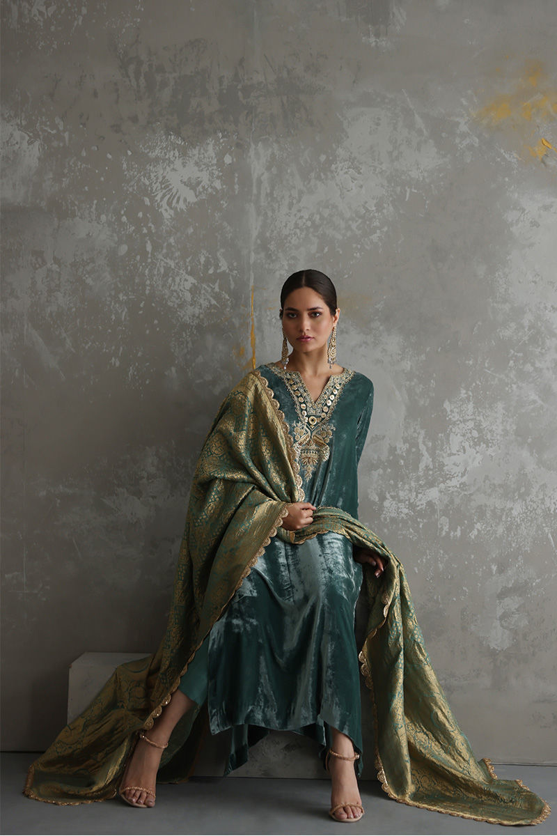 This Wasabi Green pure velvet long shirt is a must have for winters wardrobe with beautiful neckline and sleeves of zari, gota, sequins, stones and zardozi work. Matching color pure banarsi chiffon chadar and same color pure raw silk pants are paired on additional cost to give a regal look to the attire.