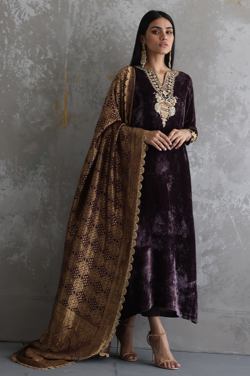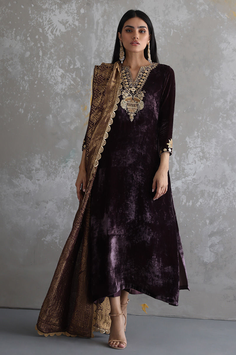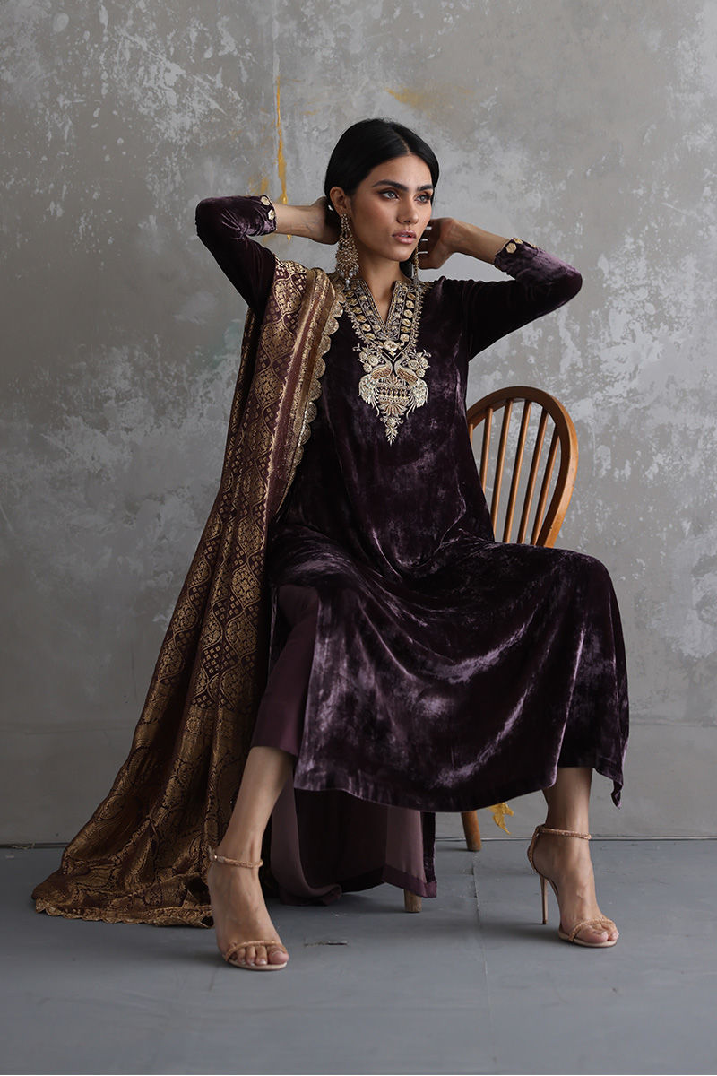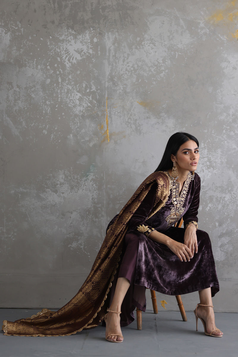 This Taupe velvet long shirt is a must have for winters wardrobe with beautiful neckline and sleeves of zari, gota, sequins, stones and zardozi work. Matching color pure banarsi chiffon chadar and same color pure raw silk pants are paired on additional cost to give a regal look to the attire.