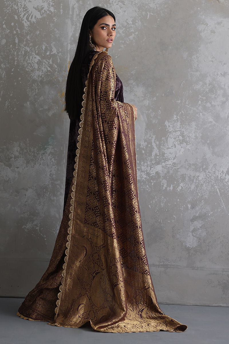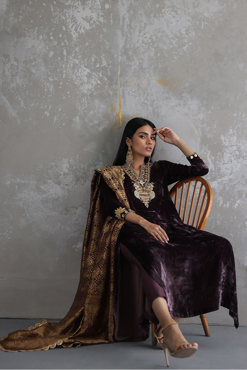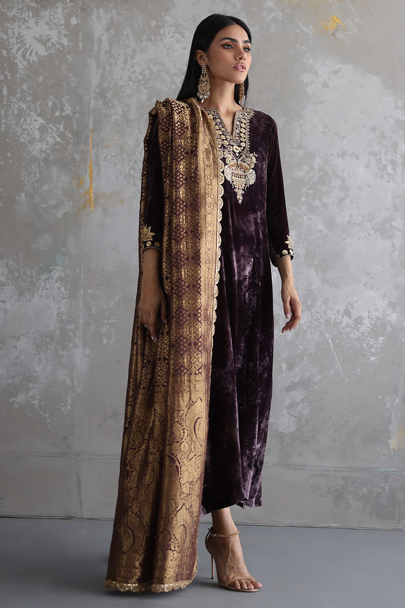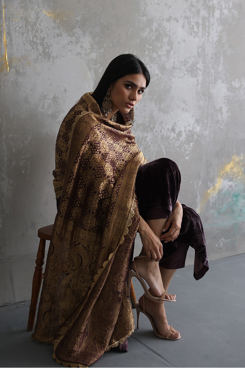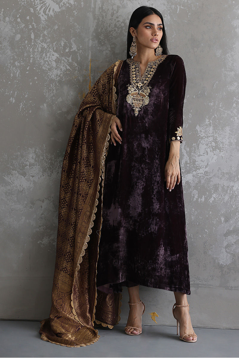 This Taupe velvet long shirt is a must have for winters wardrobe with beautiful neckline and sleeves of zari, gota, sequins, stones and zardozi work. Matching color pure banarsi chiffon chadar and same color pure raw silk pants are paired on additional cost to give a regal look to the attire.