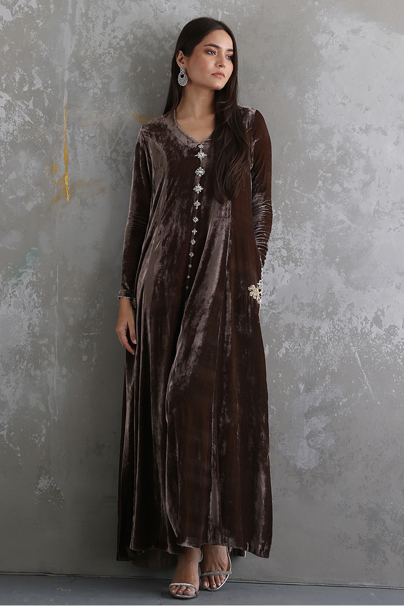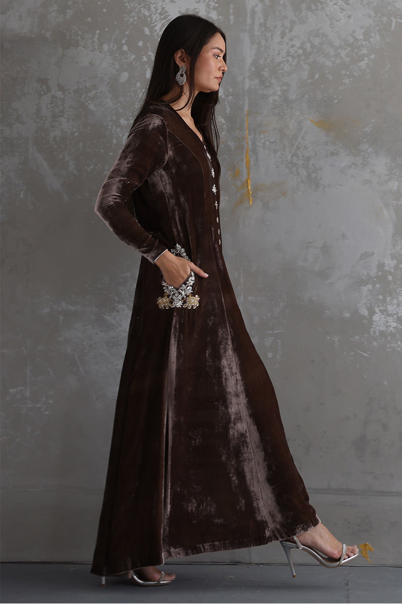 Pinewood color Pure velvet in a prince panel and centre cut style is an elegant and richful piece. The shirt has uplifted with the refine zardozi work on pockets and front line. It is paired with pure raw silk pants in same color, to be purchased at additional cost.