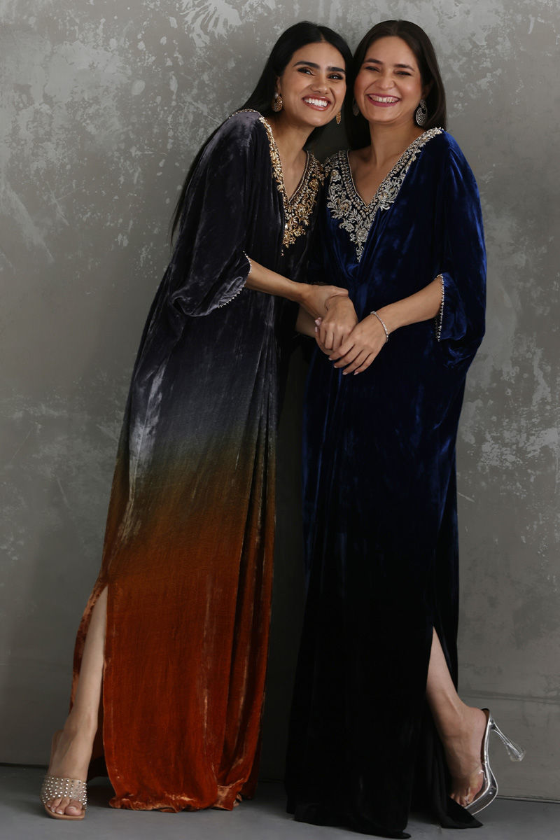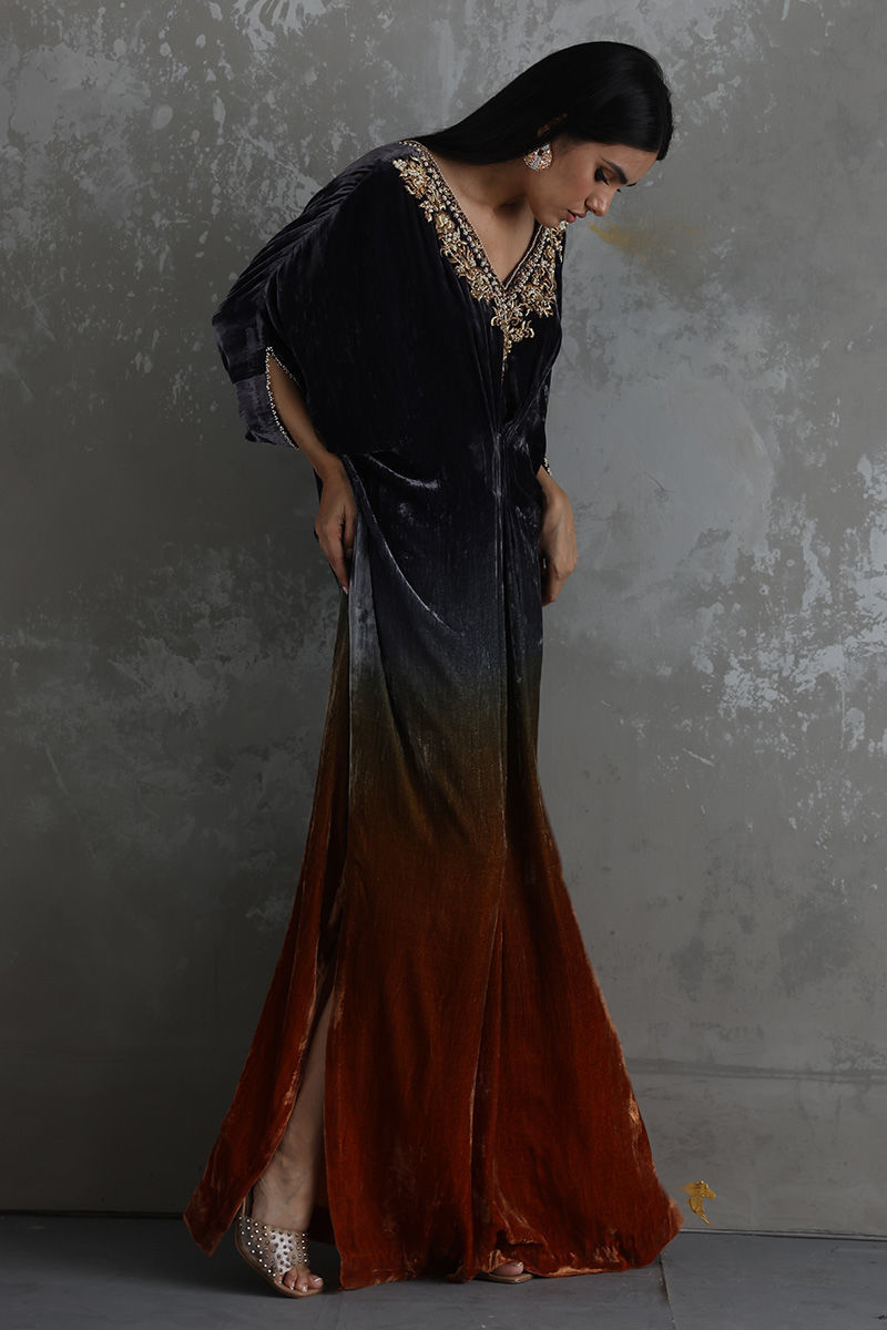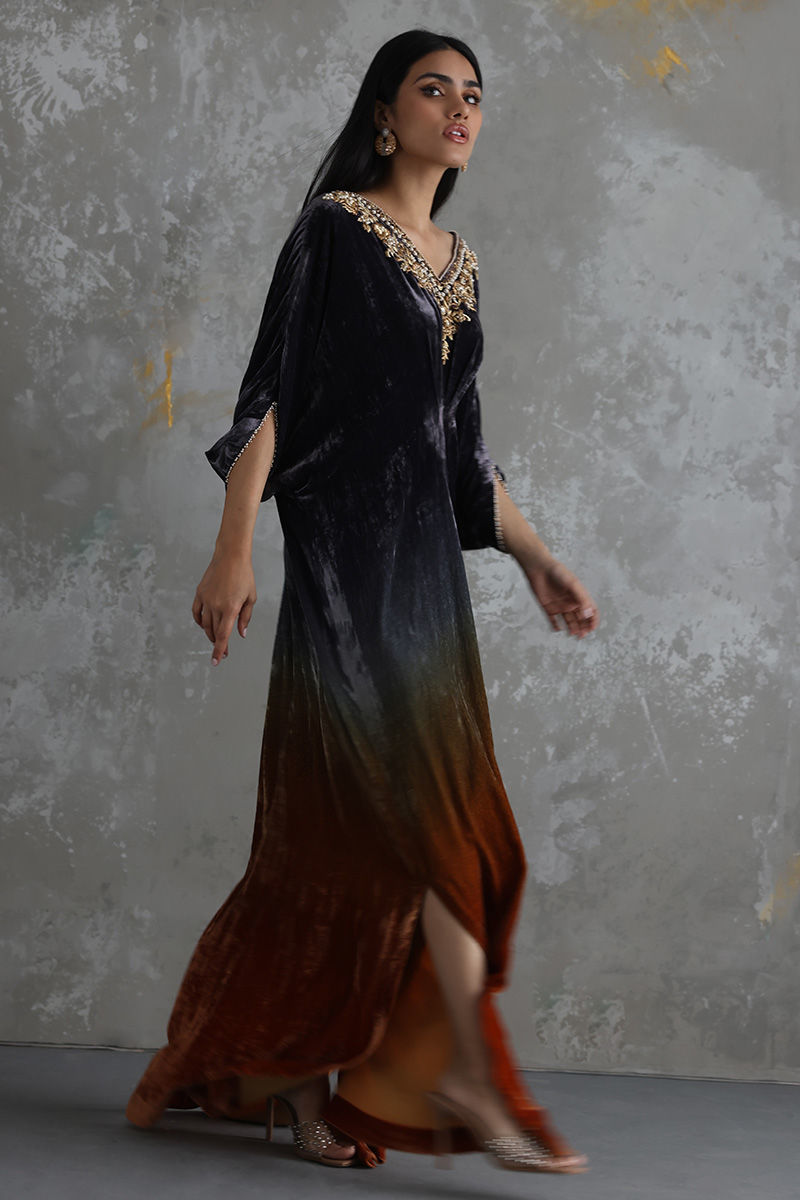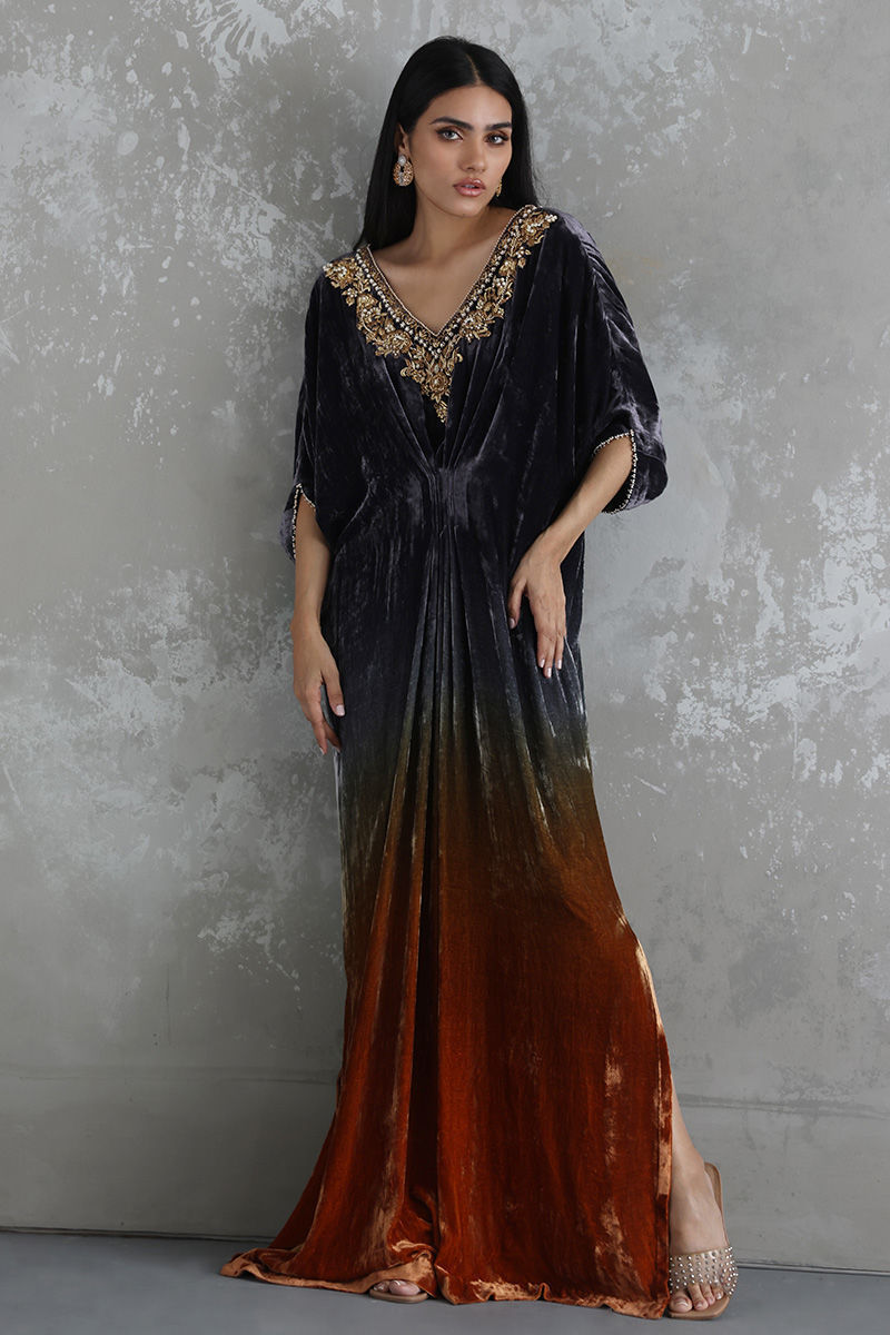 A perfect fusion of modern and traditional heritage can be witnessed in this Sunset Grey ombre kaftan in pure velvet fabric. The front and back neckline and sleeves are hand worked with pure delicate zardozi work to give a regal look to the attire.
