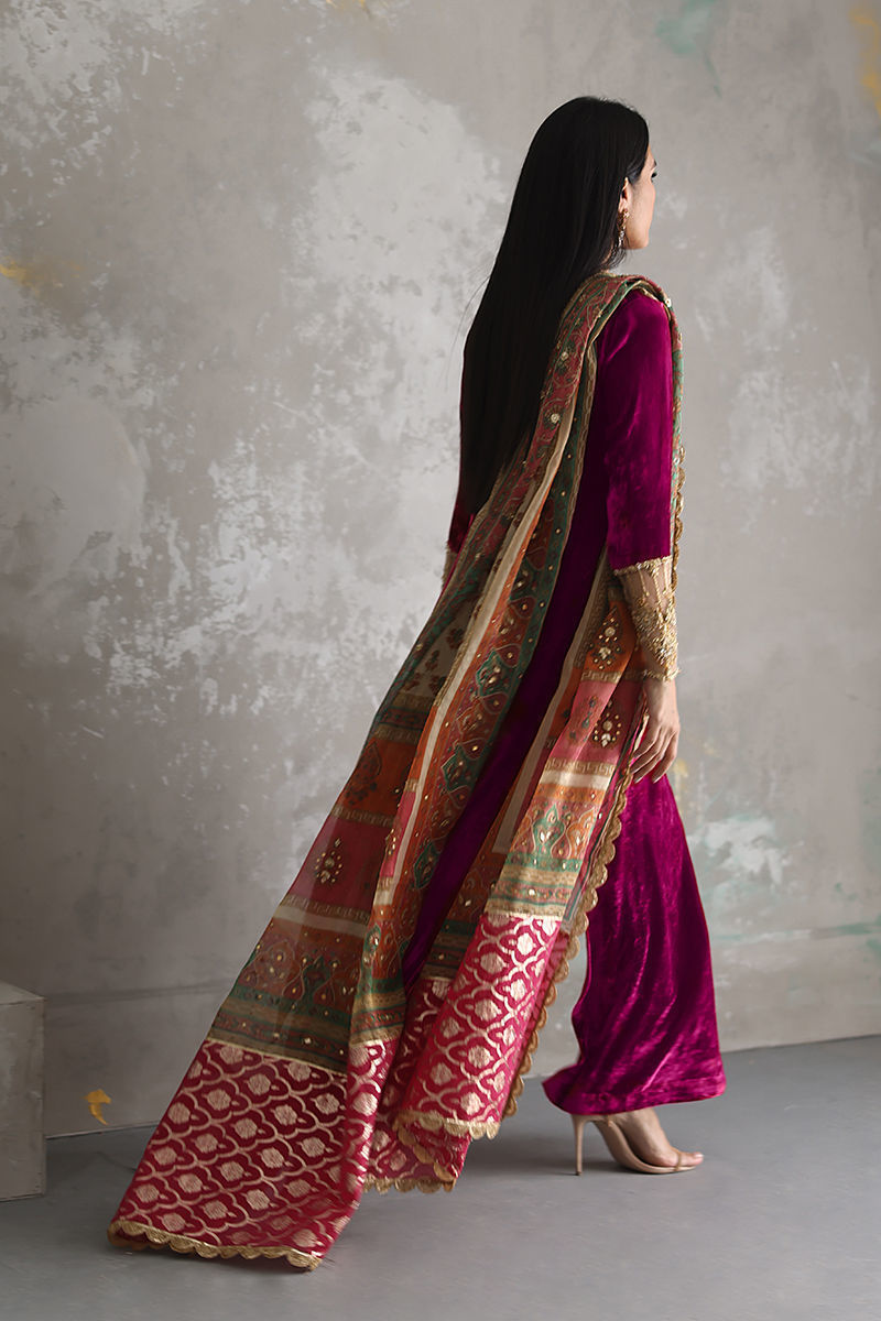 Perfect colour for winter evenings. This Rose Red pure velvet shirt in prince panel cut is a statement of elegance. The adorned Style is complimented with delicate zardozi work on sleeves. Maysuri screen print dupatta with gota, sequins and stones handwork all over and pure raw silk pants can be purchased separately.