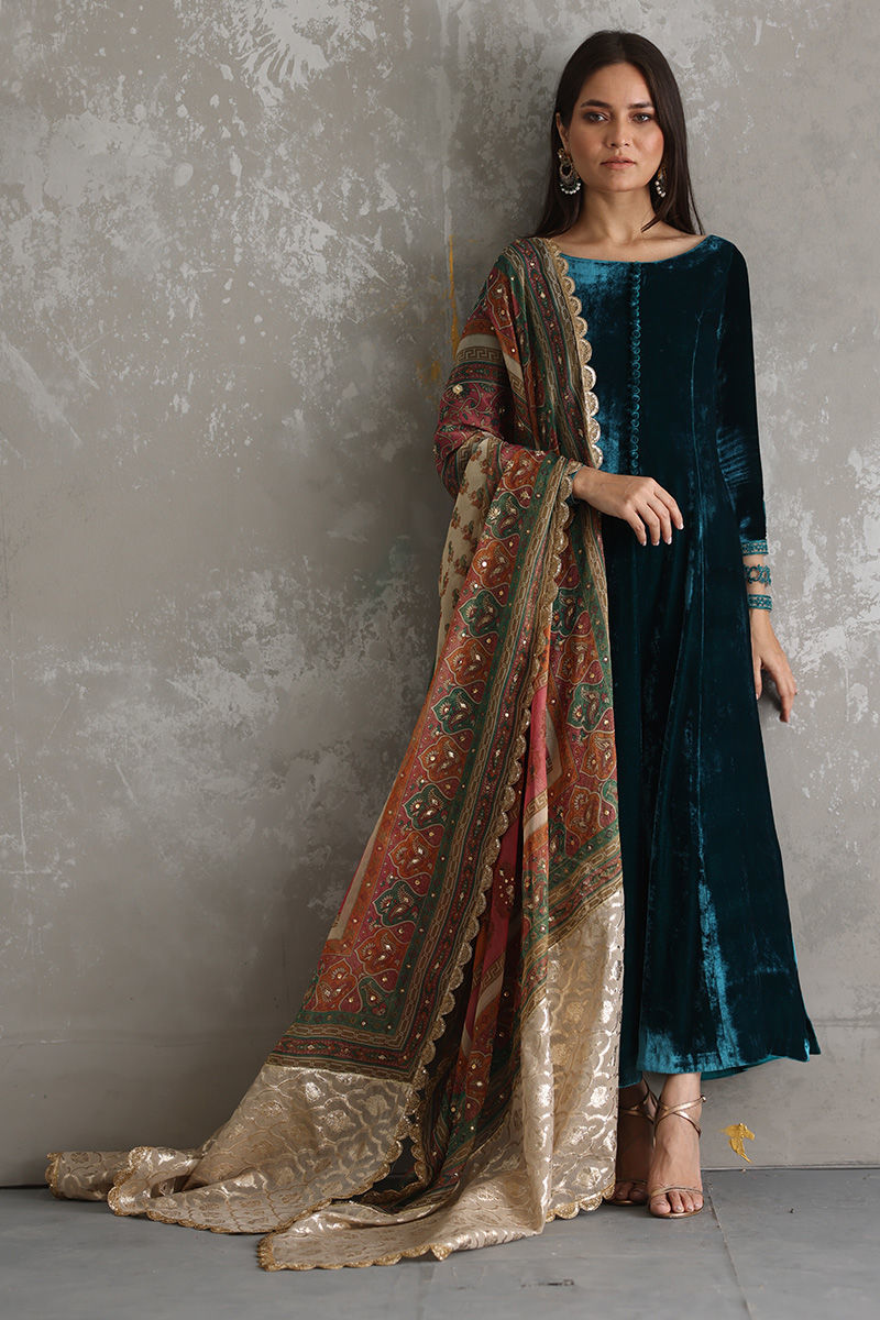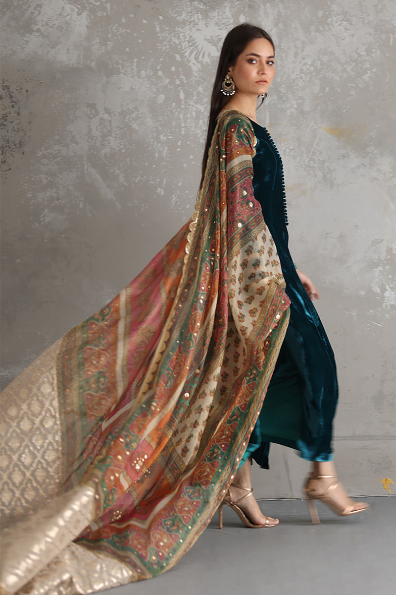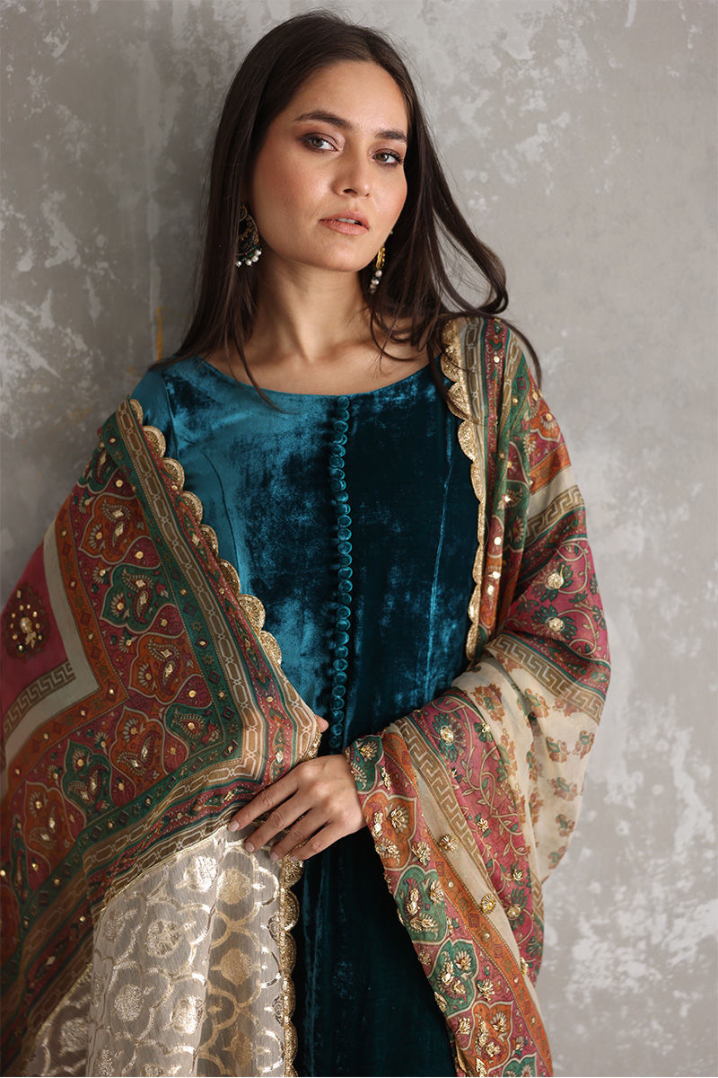 Perfect colour for winter evenings. This Peacock Green pure velvet shirt in prince panel cut is a statement of elegance. The adorned style is complimented with delicate zari work on sleeves and back. Maysuri screen print dupatta with gota, sequins and stones handwork all over and pure raw silk pants can be purchased separately.