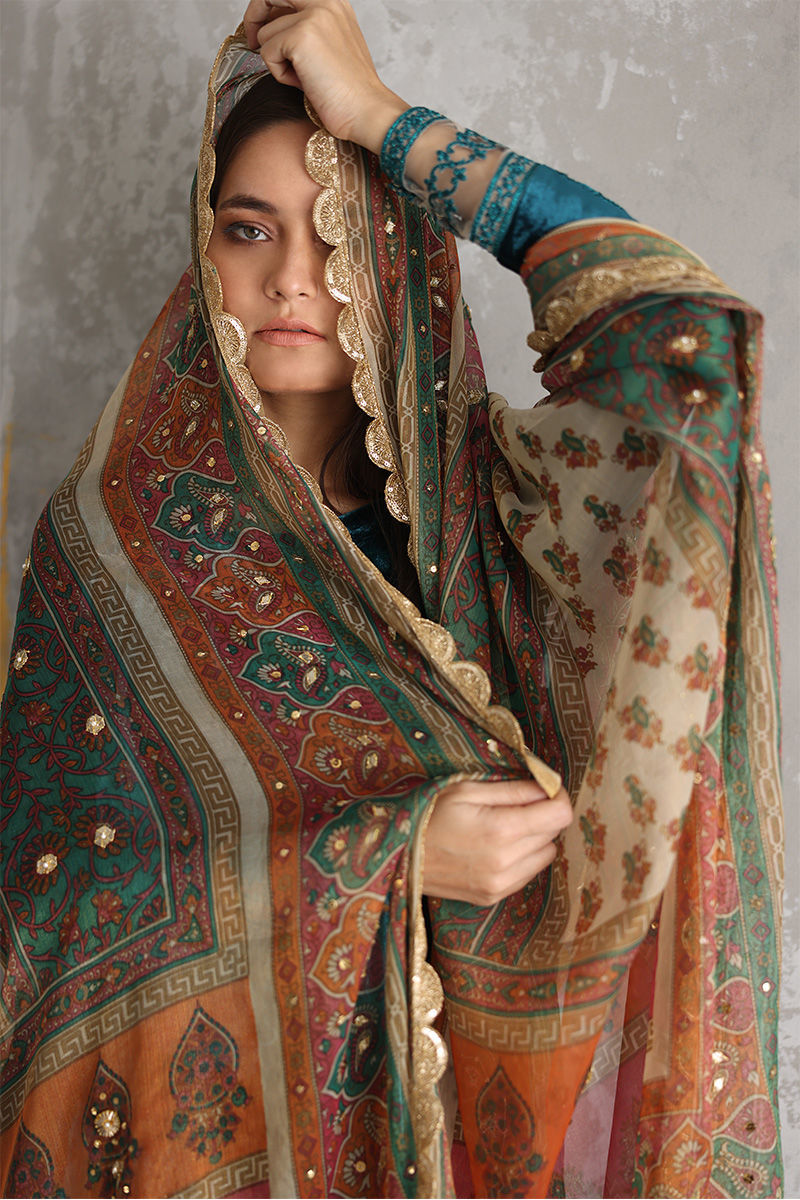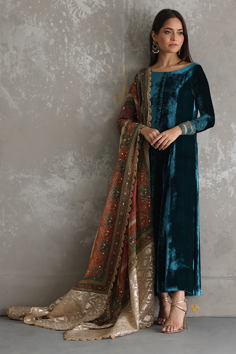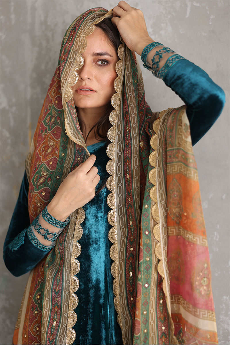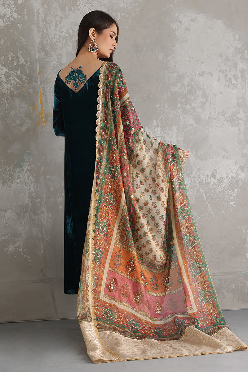 Perfect colour for winter evenings. This Peacock Green pure velvet shirt in prince panel cut is a statement of elegance. The adorned style is complimented with delicate zari work on sleeves and back. Maysuri screen print dupatta with gota, sequins and stones handwork all over and pure raw silk pants can be purchased separately.