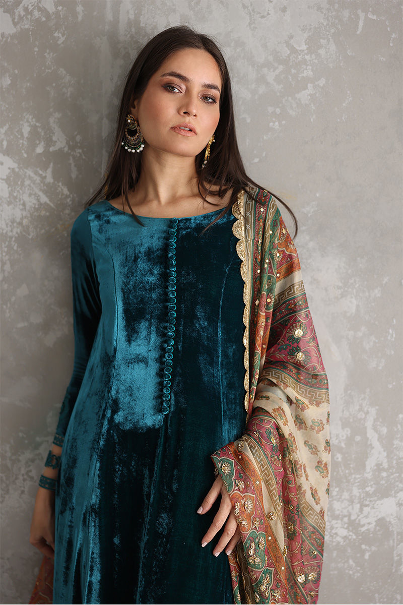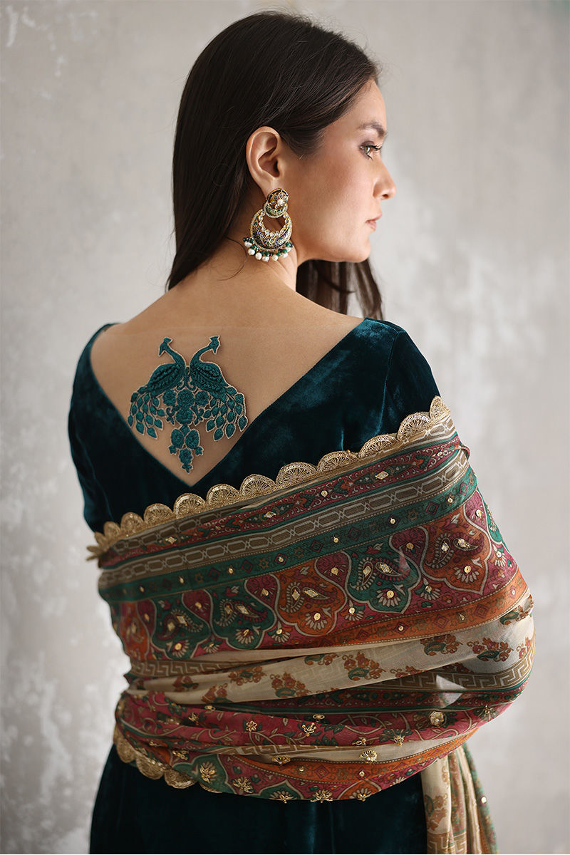 Color: Peacock Green Fabric: Velvet Work Details: Embellished