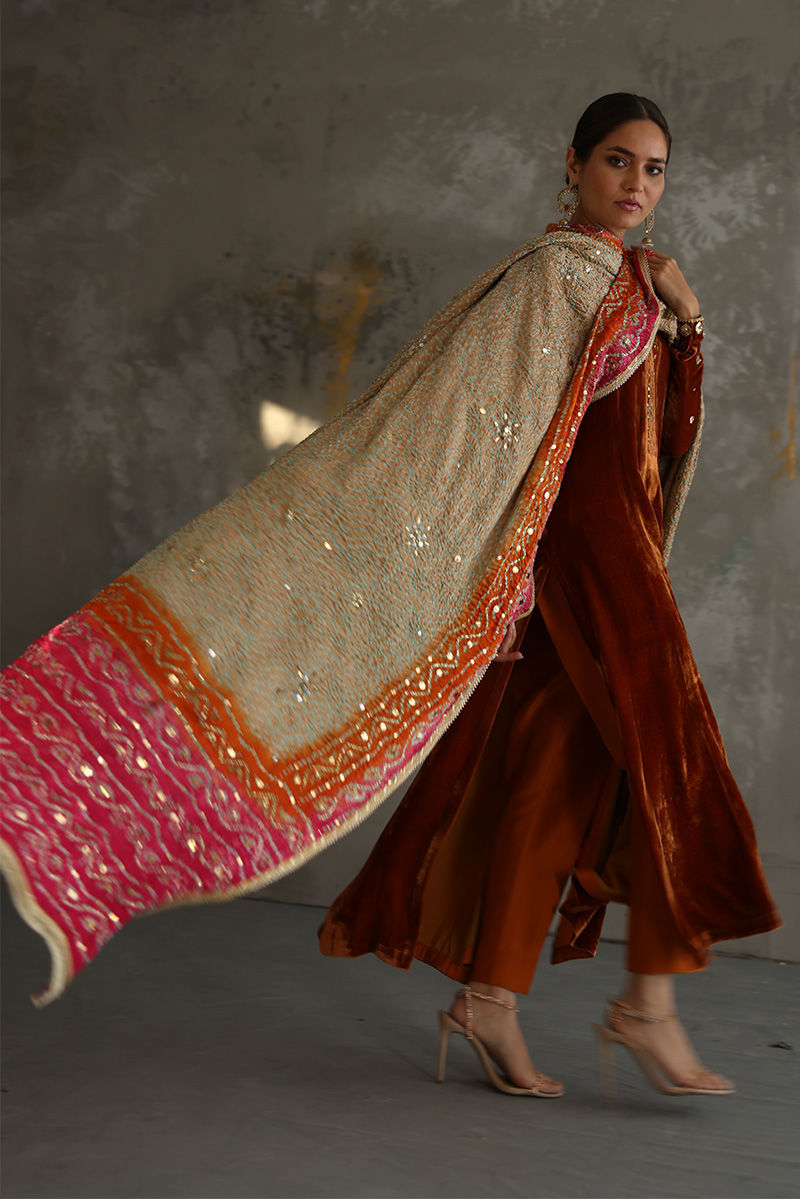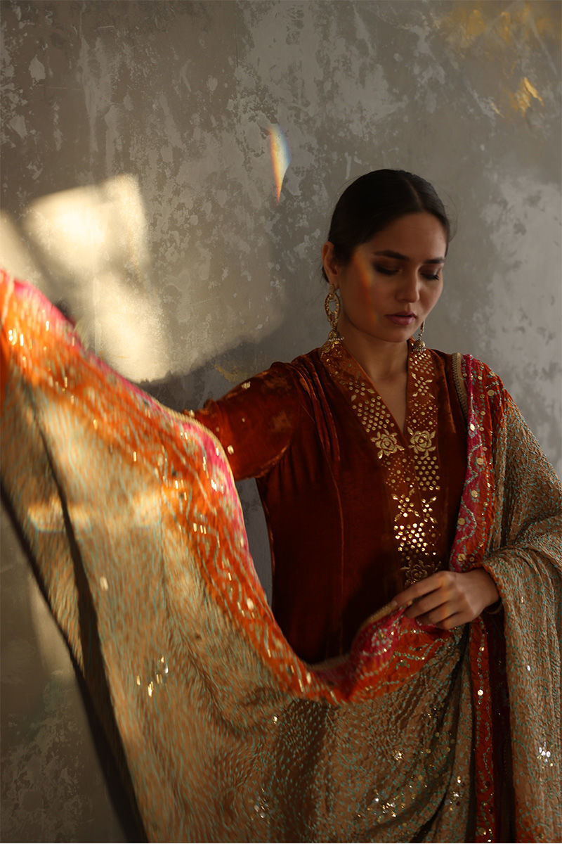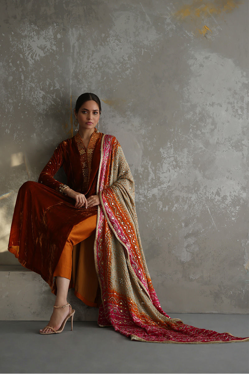 Exquisite design shown in Tangerine colored pure velvet prince panel cut. The details around the neckline are all hand-crafted kamdani work, also contributing towards the beautiful Gota and sequin work on all oversleeves. Pure raw silk pants can be paired as shown in the picture at additional charges. Multi-color pure silk Bandhni Dupatta with kamdani and sequins working all over is a great option to pair with it.