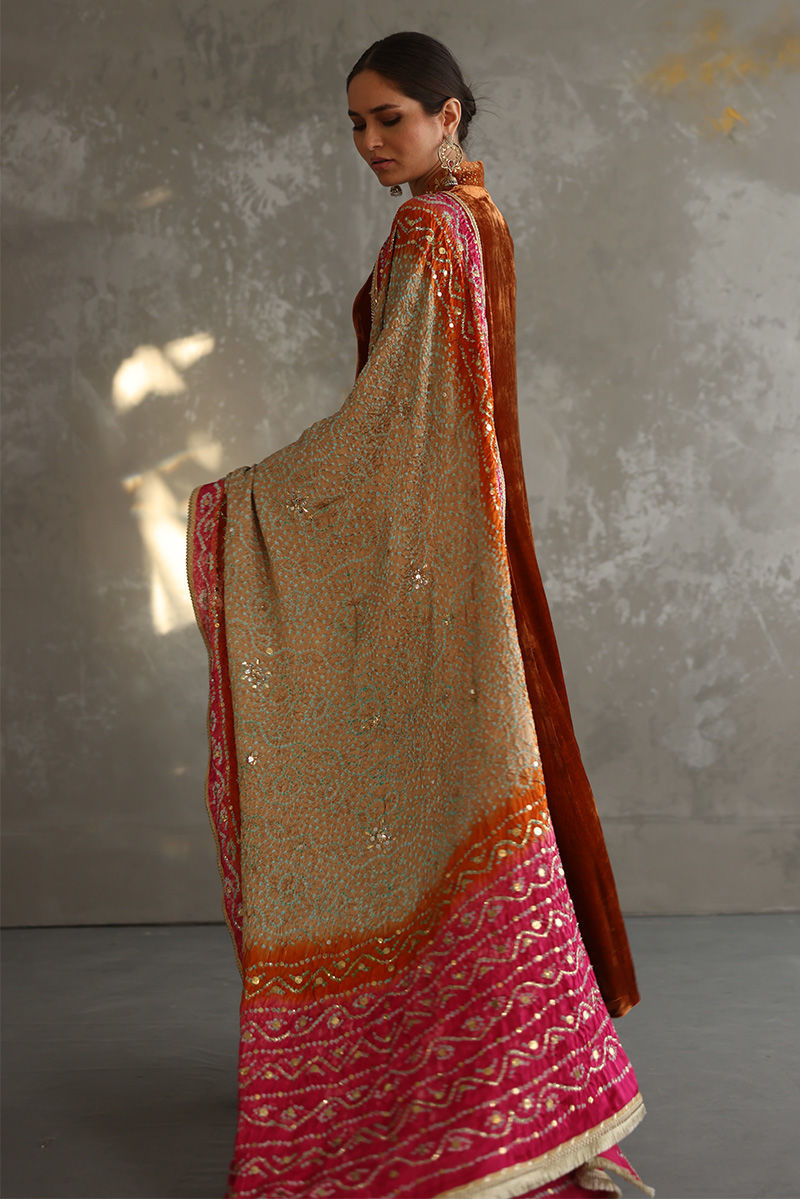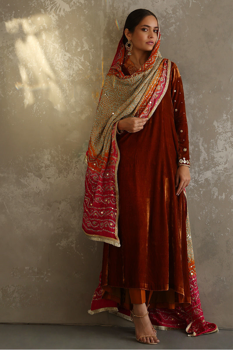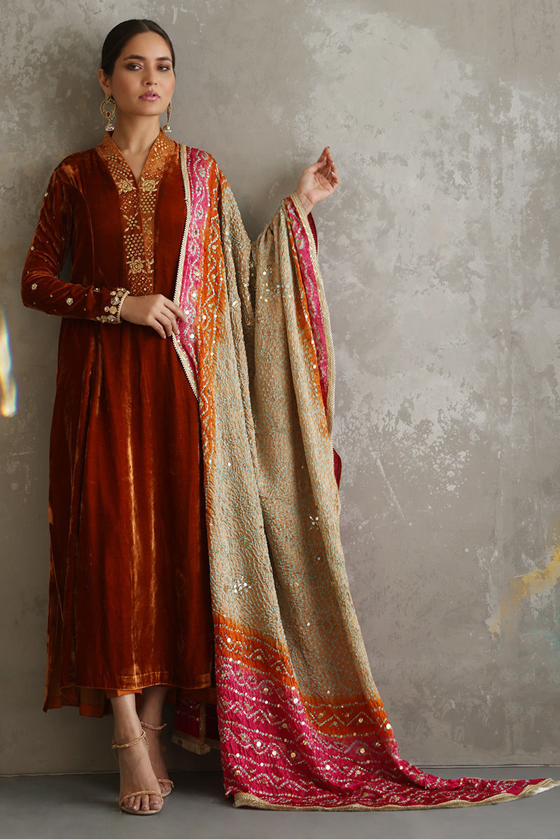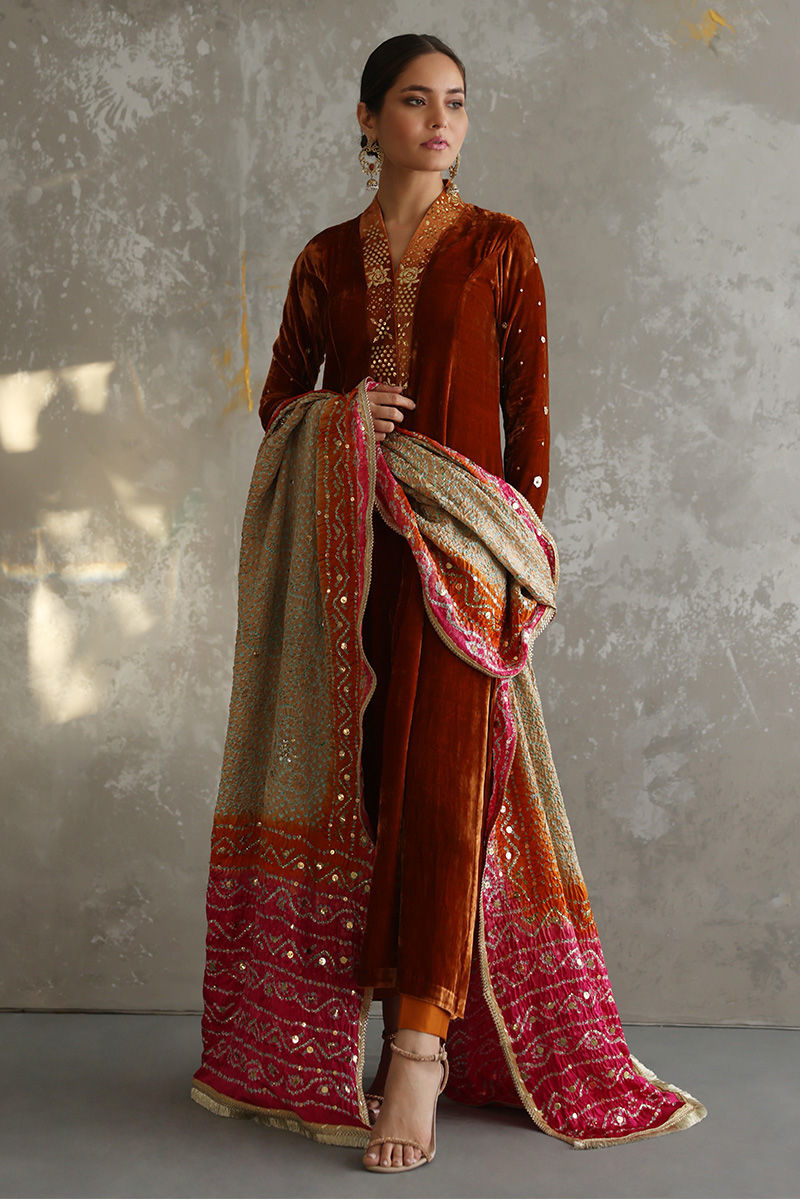Exquisite design shown in Tangerine colored pure velvet prince panel cut. The details around the neckline are all hand-crafted kamdani work, also contributing towards the beautiful Gota and sequin work on all oversleeves. Pure raw silk pants can be paired as shown in the picture at additional charges. Multi-color pure silk Bandhni Dupatta with kamdani and sequins working all over is a great option to pair with it.