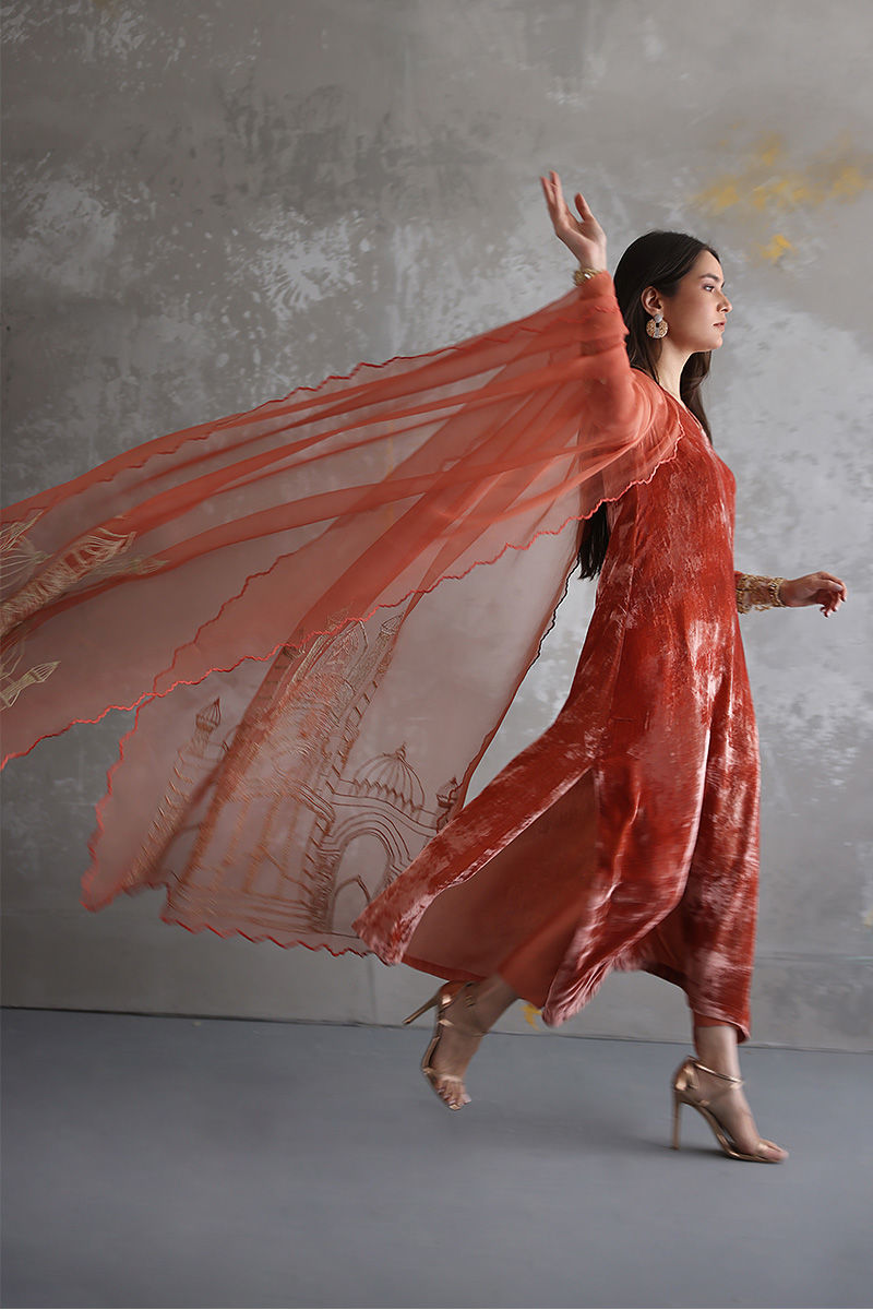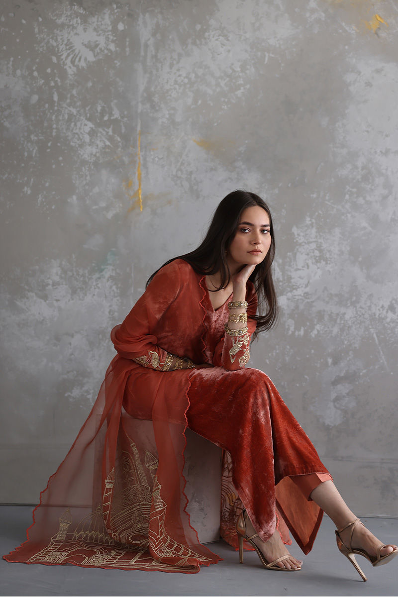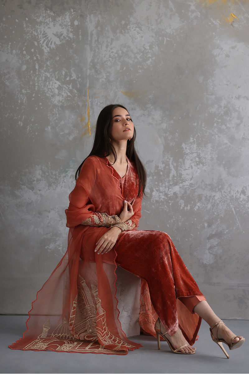 Portrayal of elegance seen in this Coral Reef pure velvet shirt. Intricate zardozi work is well positioned with nakshi, kora, dabka, sequins, stones and zari on sleeves. Same colour pure raw silk pants and pure organza dupatta having architecture embroidery with zari is paired, to be purchased separately.