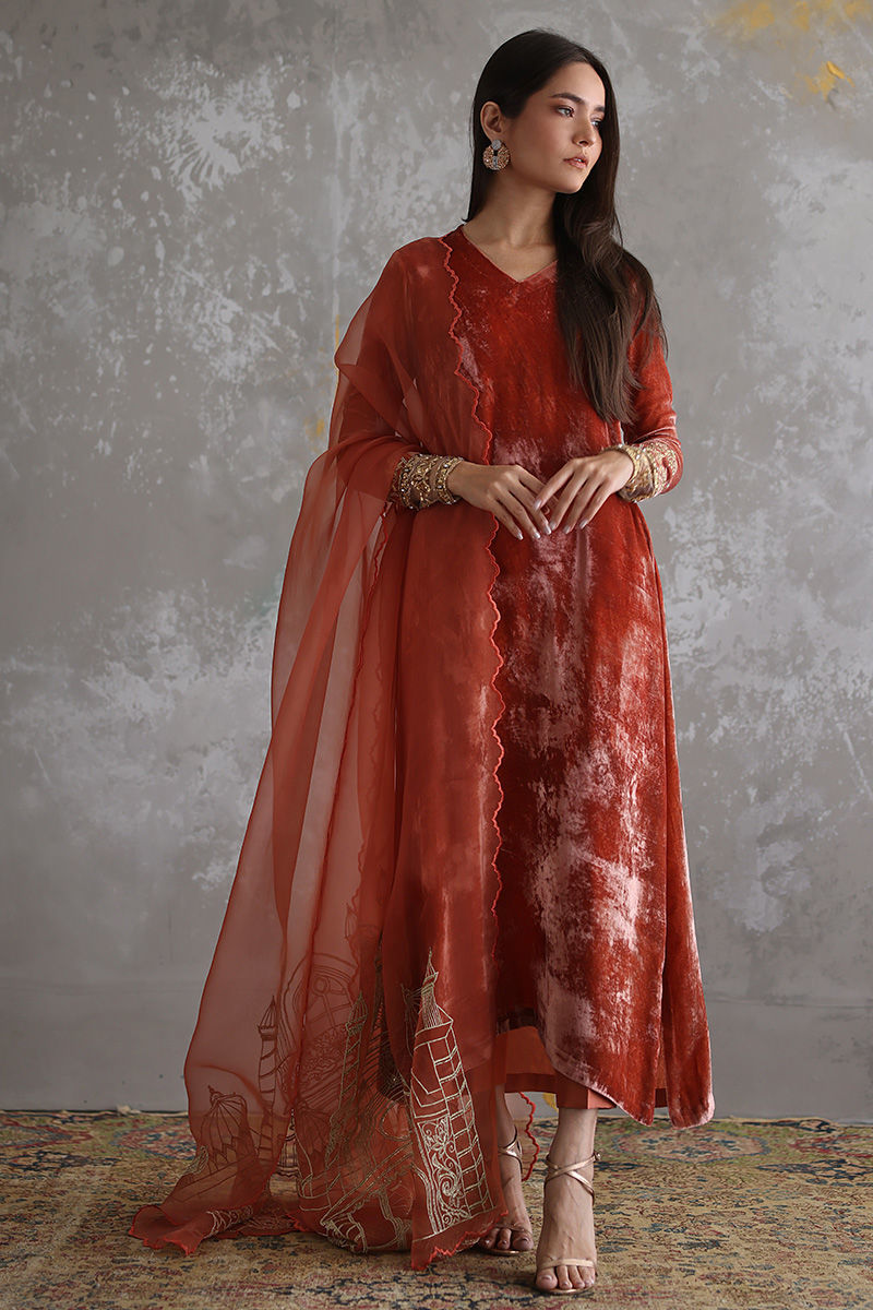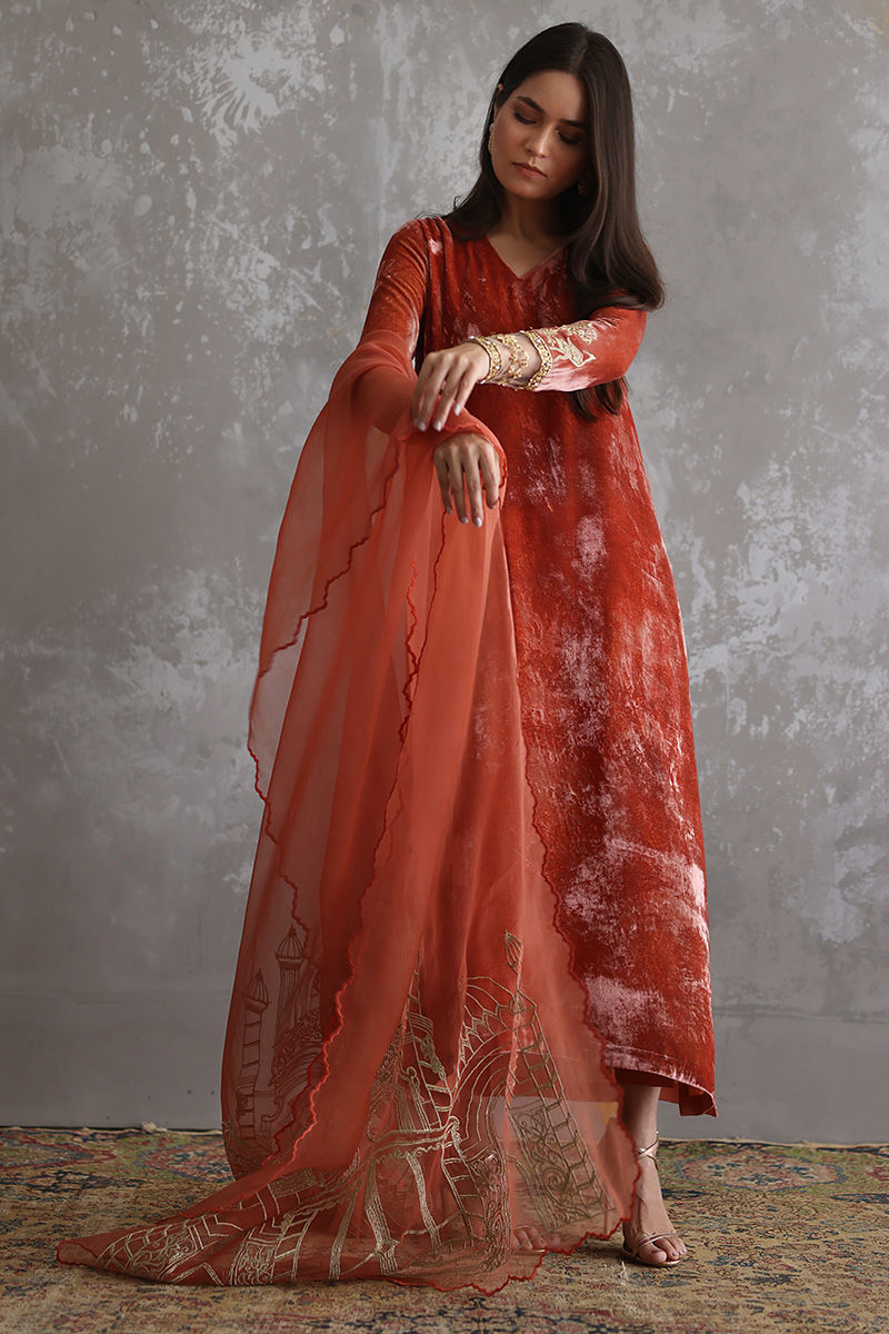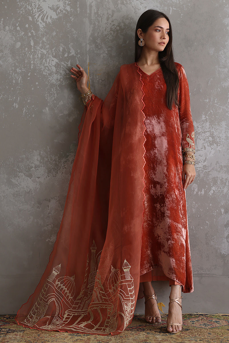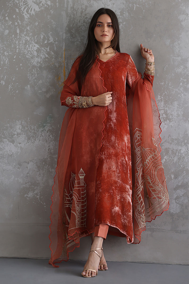 Portrayal of elegance seen in this Coral Reef pure velvet shirt. Intricate zardozi work is well positioned with nakshi, kora, dabka, sequins, stones and zari on sleeves. Same colour pure raw silk pants and pure organza dupatta having architecture embroidery with zari is paired, to be purchased separately.