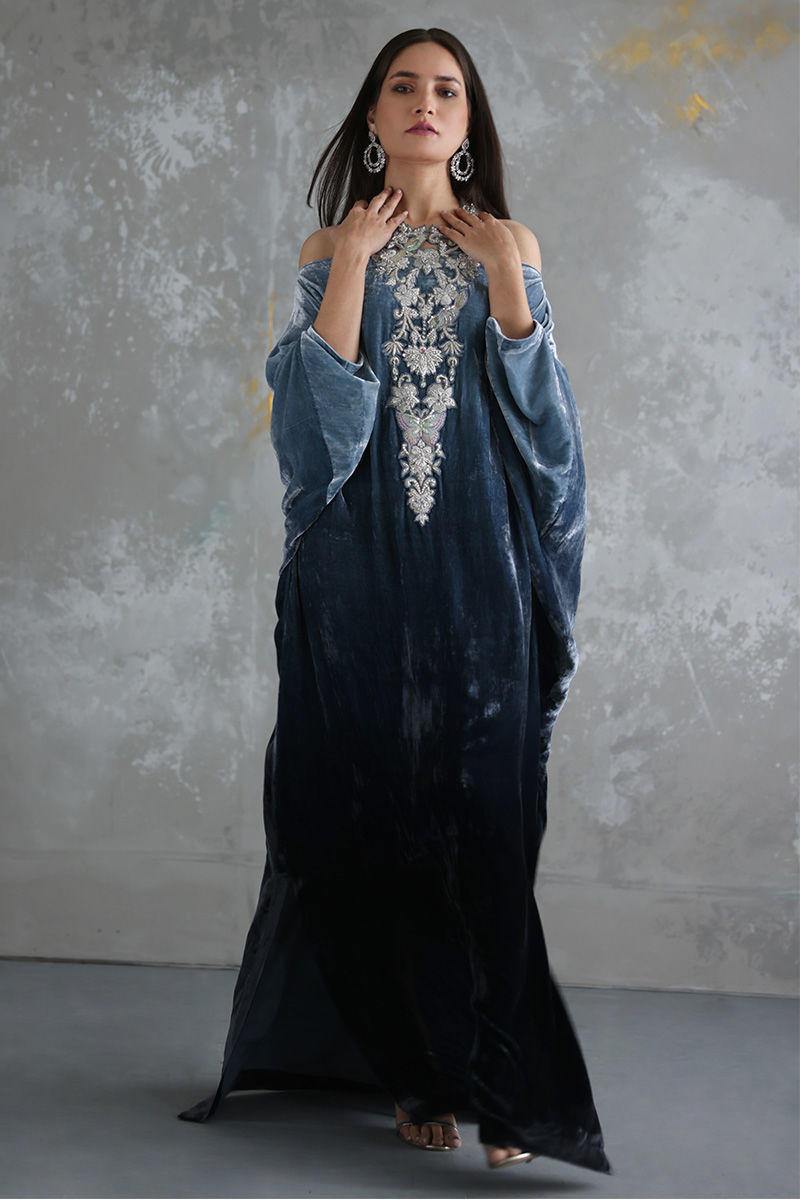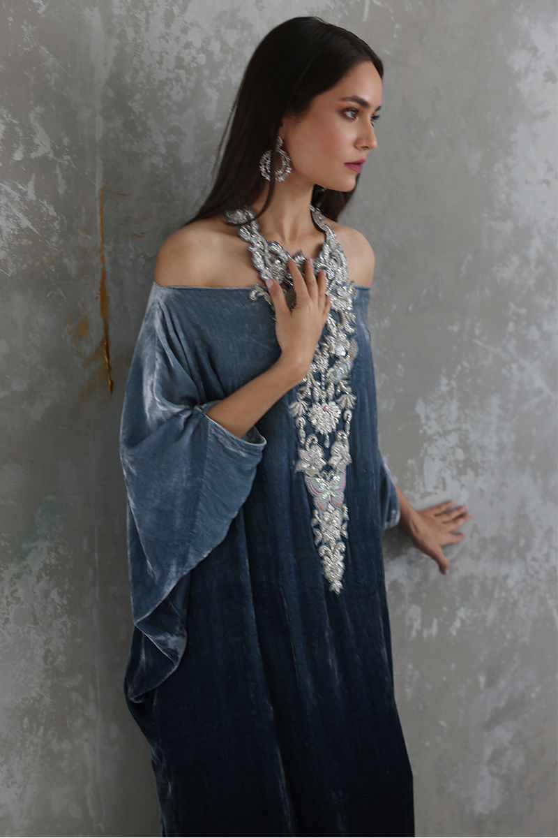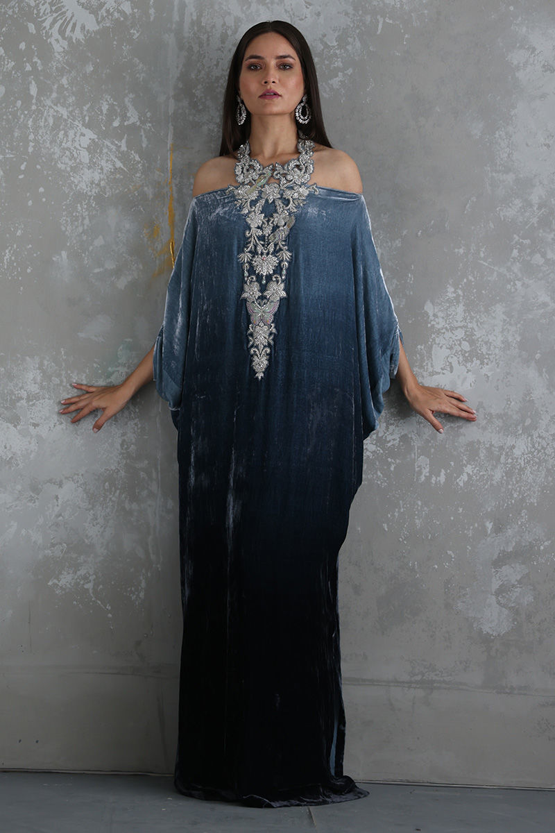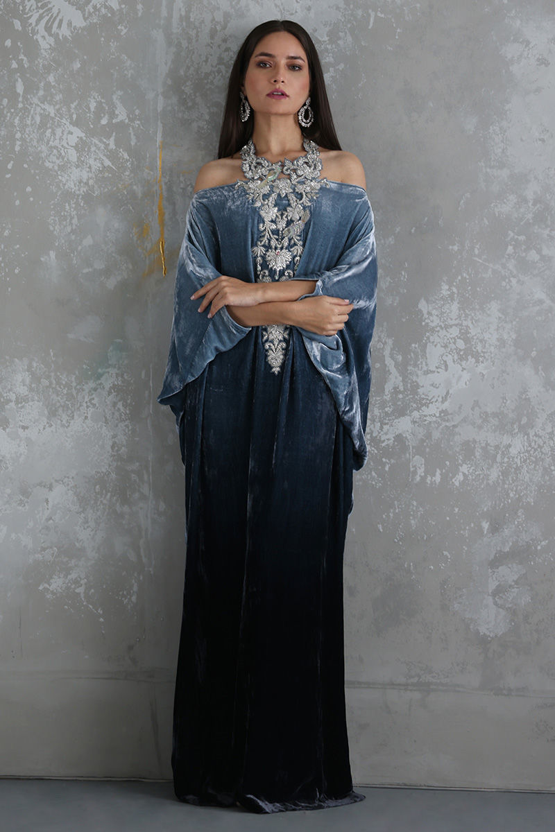 Steeple Grey ombre look pure velvet off shoulder kaftan is stare worthy. The hues of resham and zari work enhanced with sequins and stones are placed carefully forming a classic and trendy neck piece.