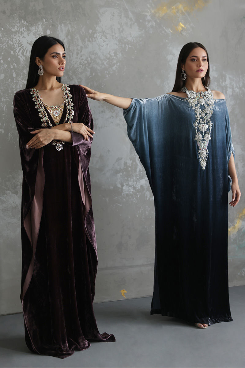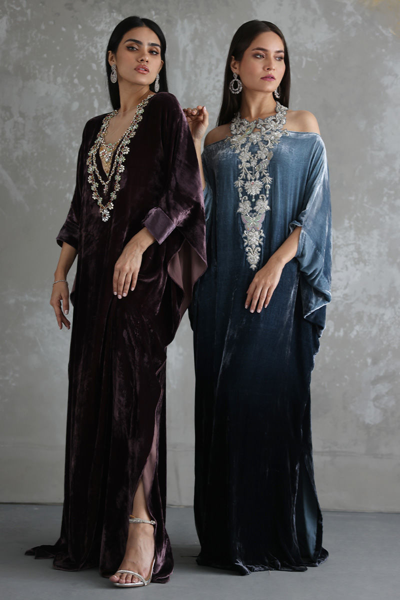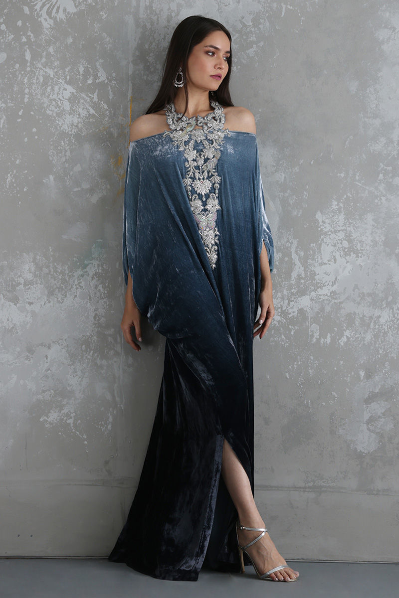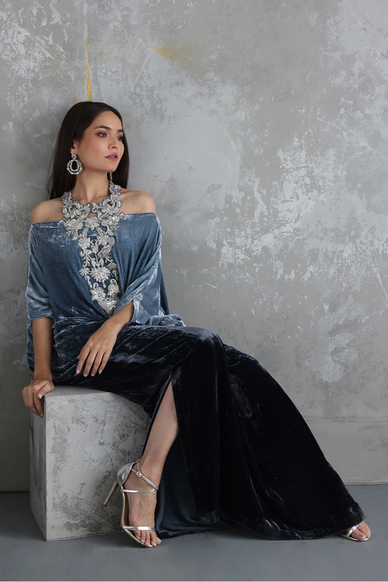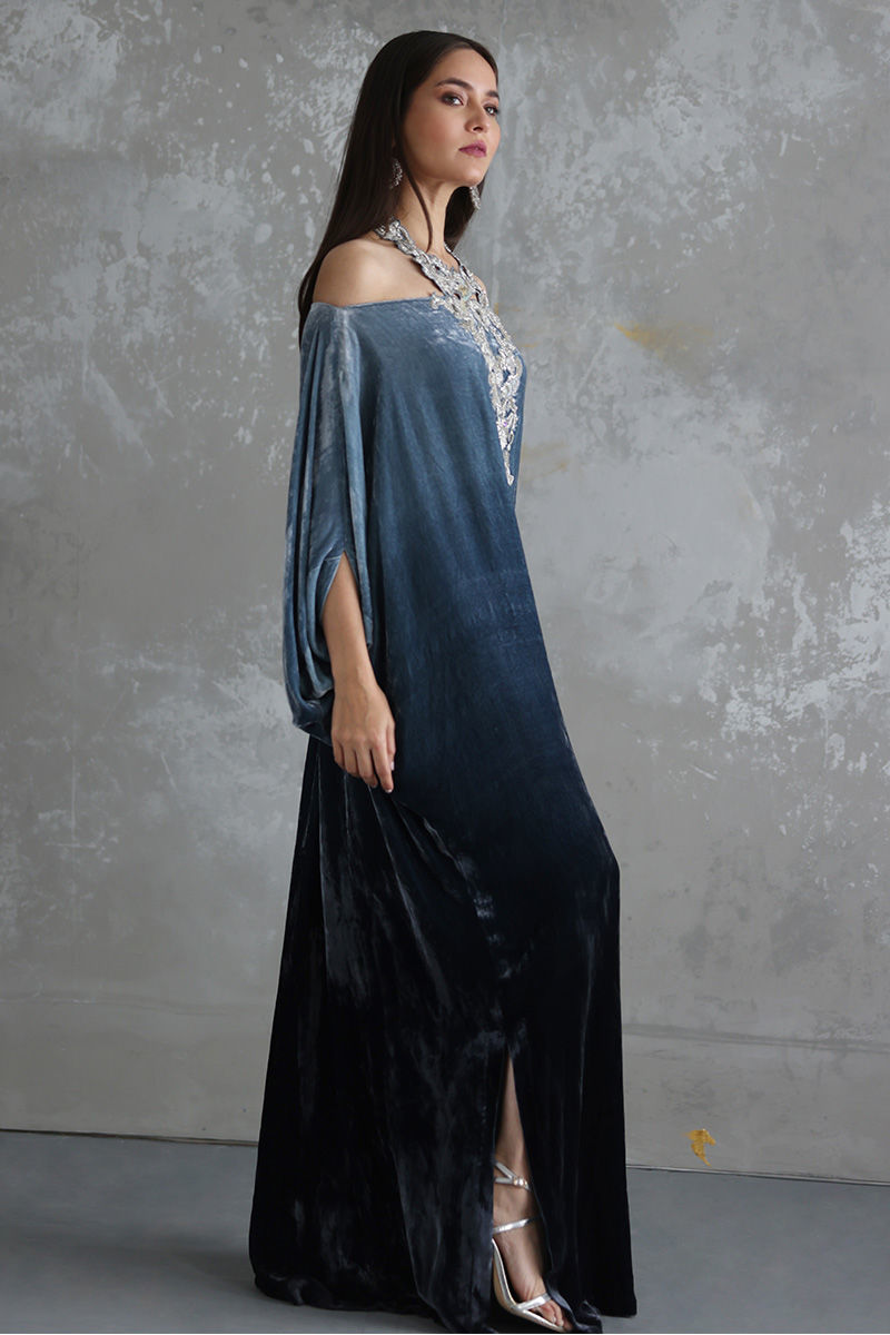 Steeple Grey ombre look pure velvet off shoulder kaftan is stare worthy. The hues of resham and zari work enhanced with sequins and stones are placed carefully forming a classic and trendy neck piece.