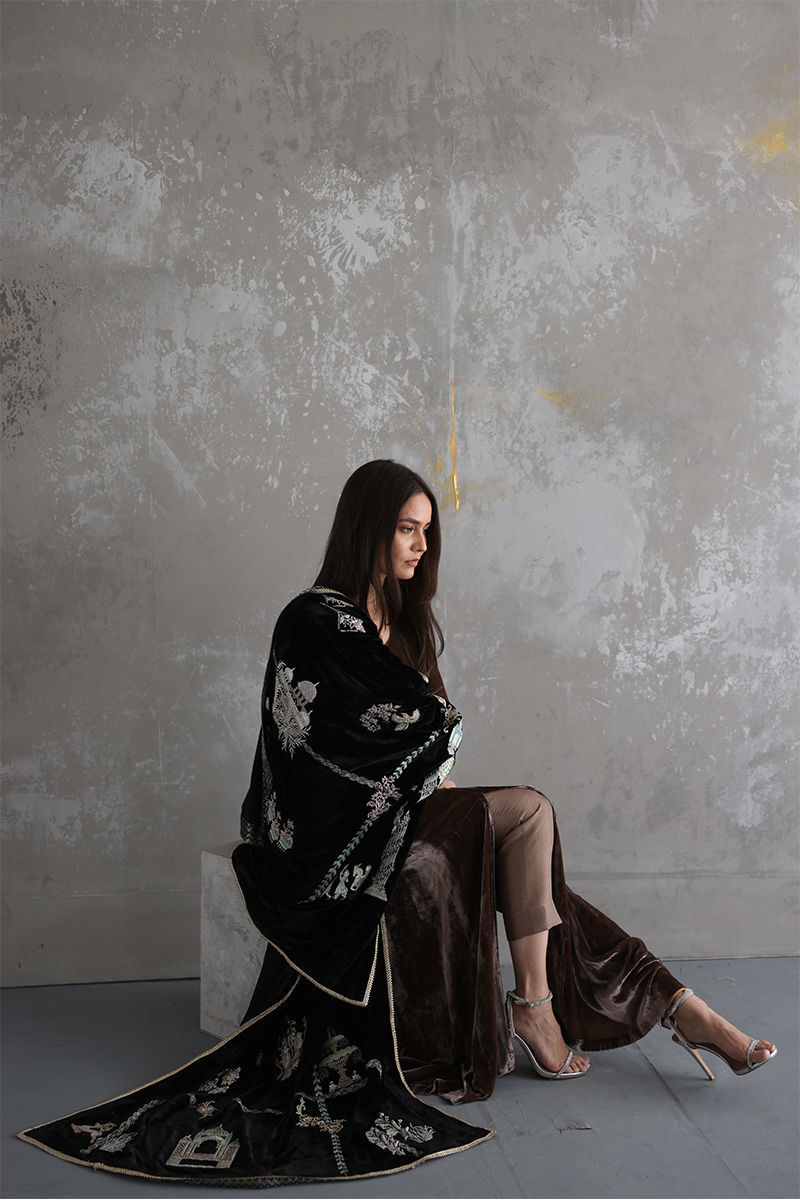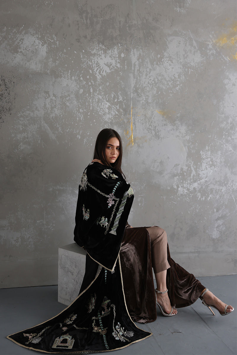 This timeless black pure velvet Shawl acts as the canvas with artwork of Floral and Mughal theme with fine Zari and thread work by talented Craftsman of RM.