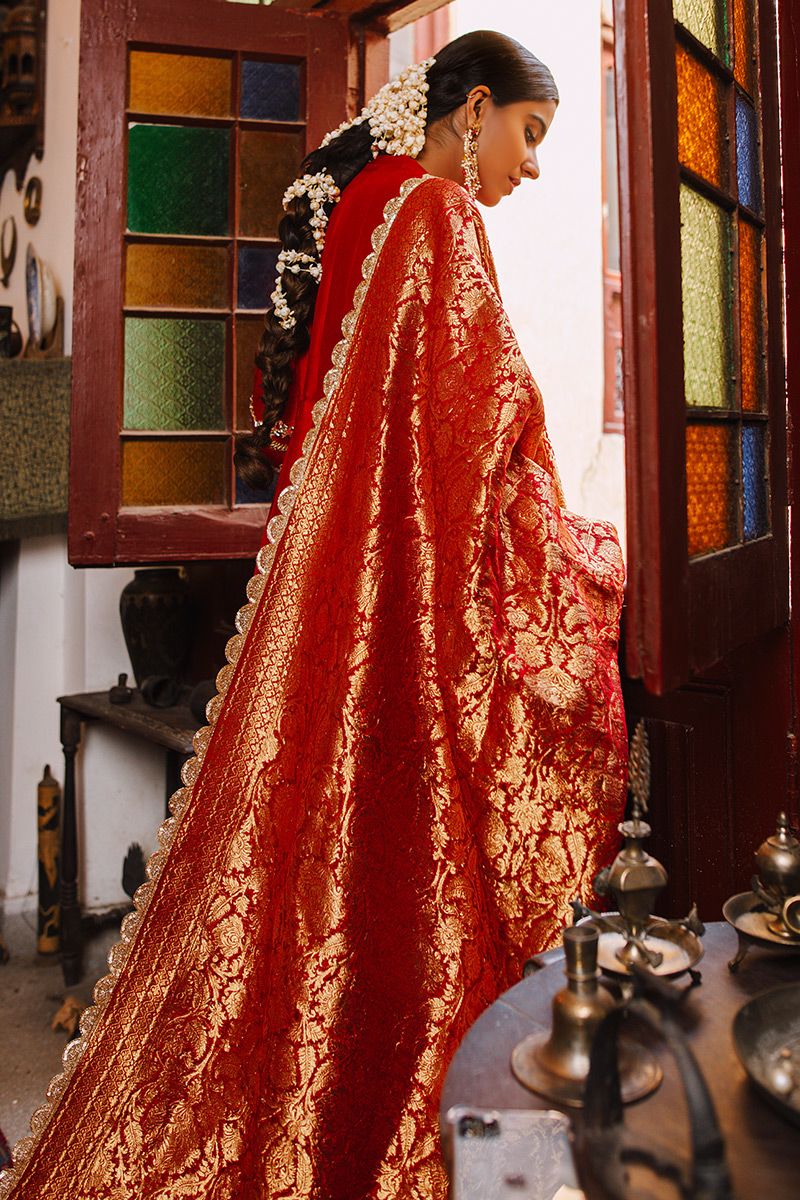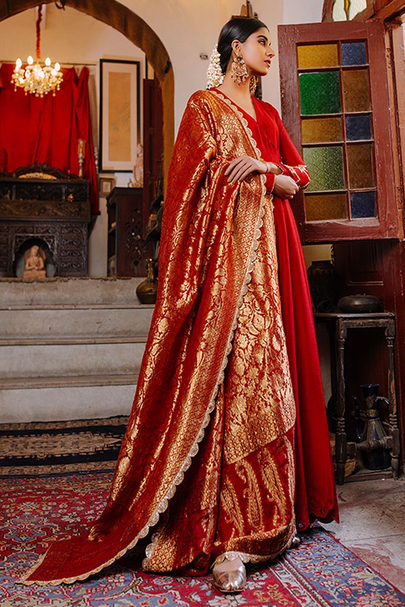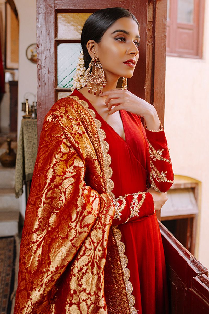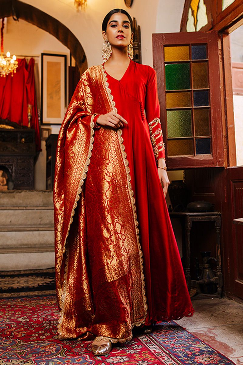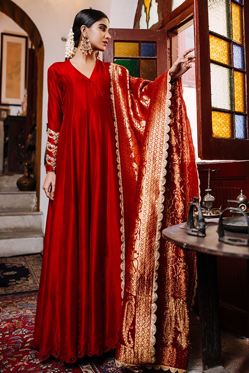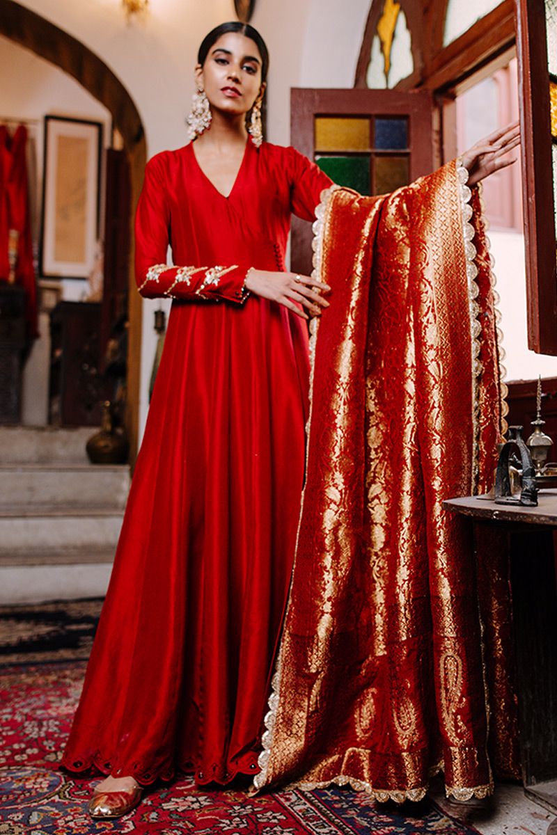 A conventional chili pepper pure raw silk angrakha, gives a Sufi aura. It features delicate gold handwork of mirror, gota, nakshi and pants. The shirt is finished of with exquisite cutwork with crystal hangings. Same color semi pure pants and luxurious red chiffon banarsi dupatta can be purchased at additional cost.