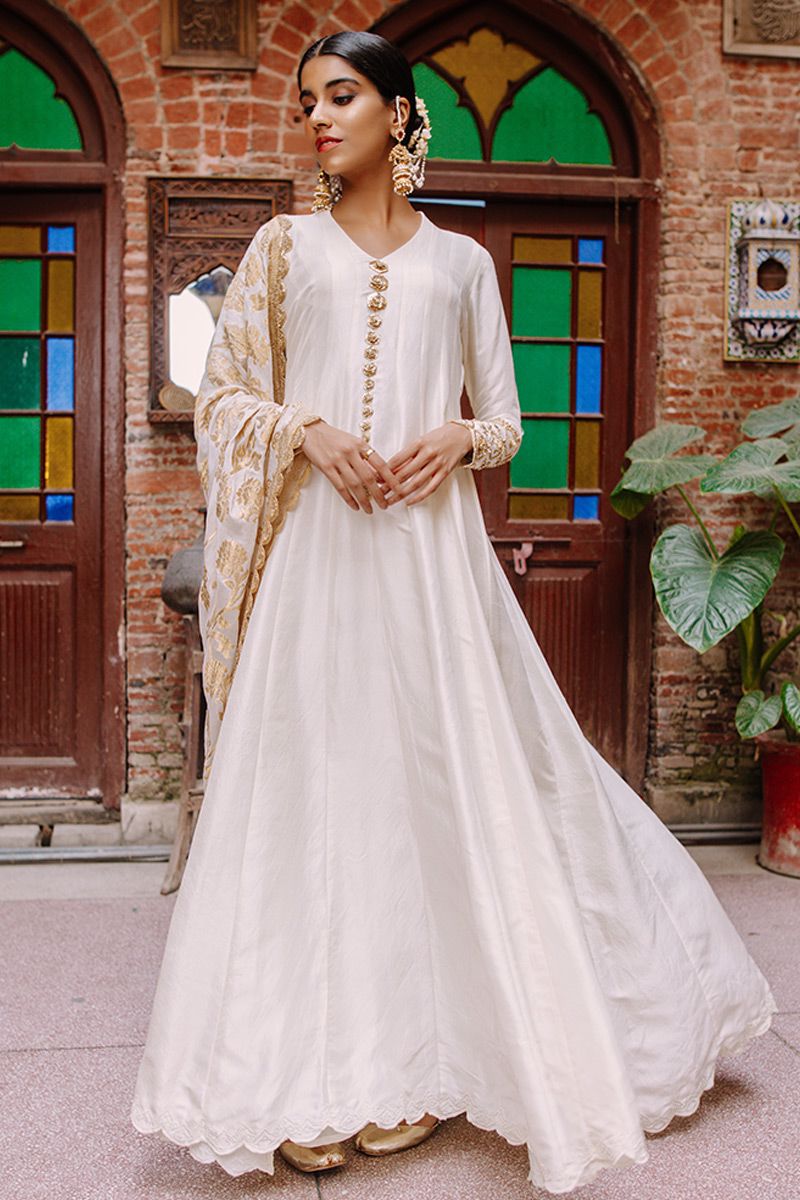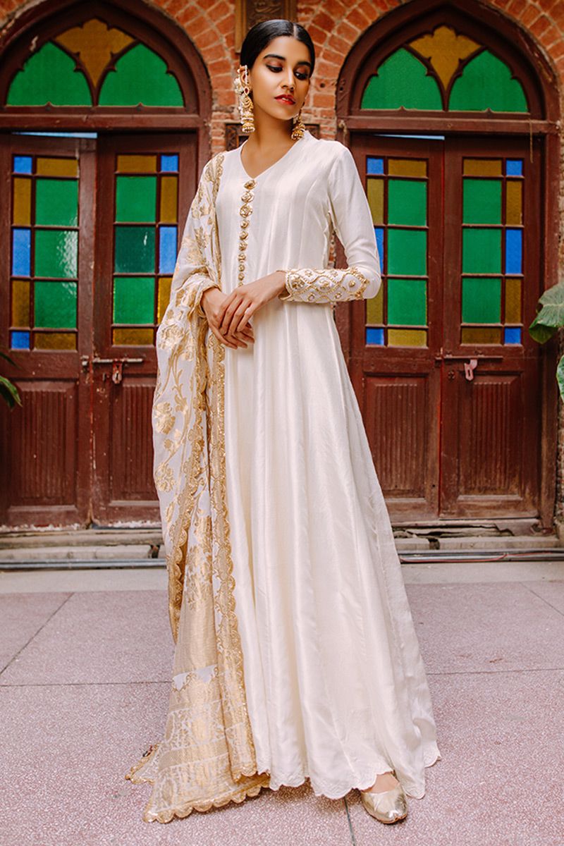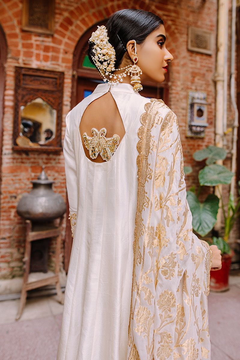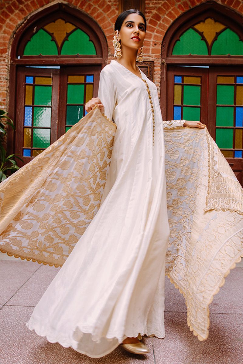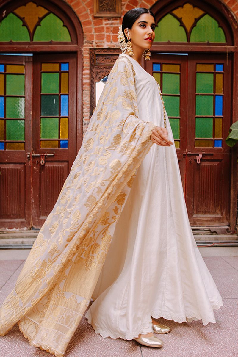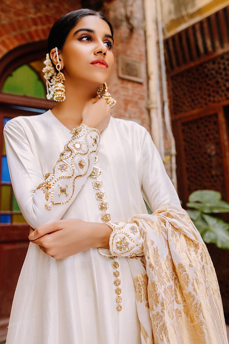 Flawless lengthy mineral white pure raw silk kalidar is a statement of purity. The thoughtful craftsmanship of tailor is witnessed while assembling the panels. This unadorned shirt compliments best with beautifully embellished sleeves comprising of pearls, cutdana, kora, dabka, nakshi, gota and resham flowers. To complete off the look same color semi pure pants and pure chiffon ivory dupatta to be purchased at additional cost.
