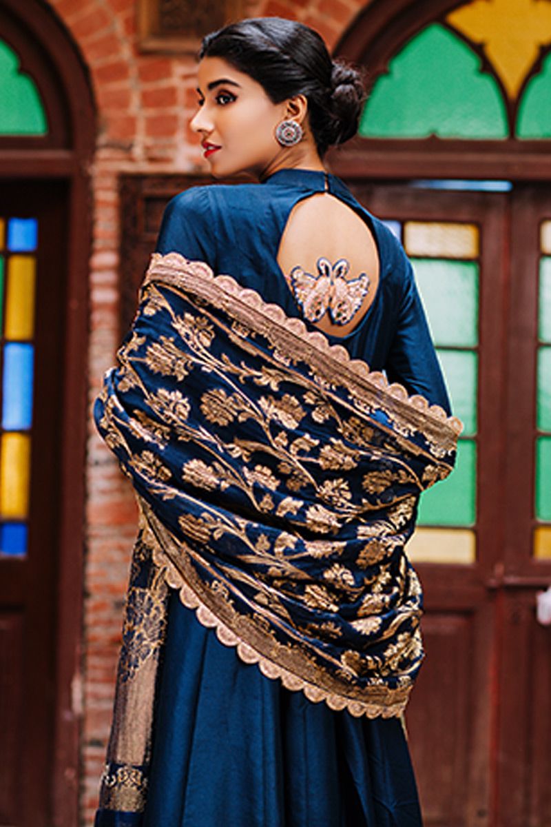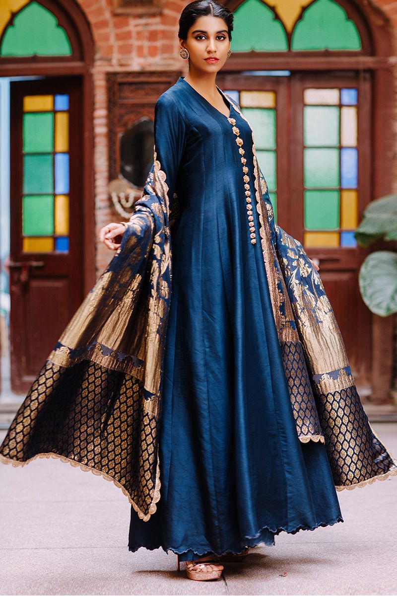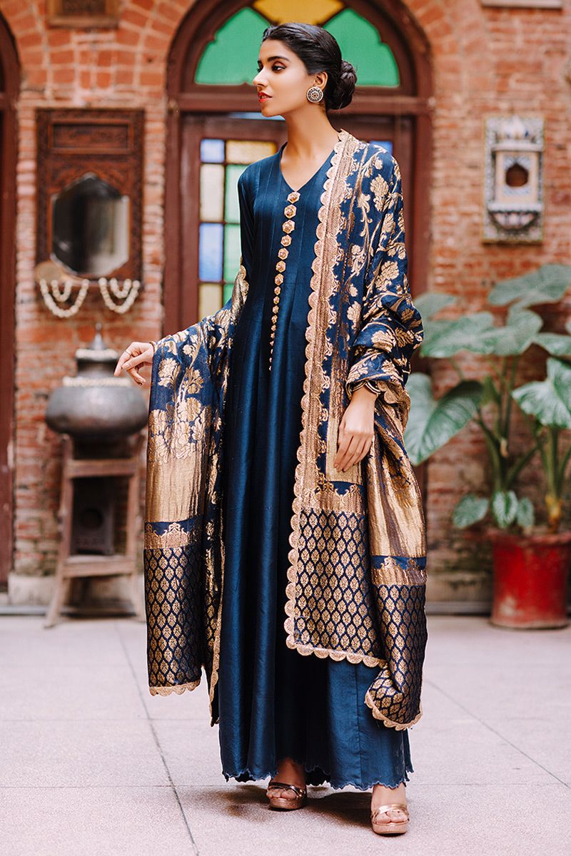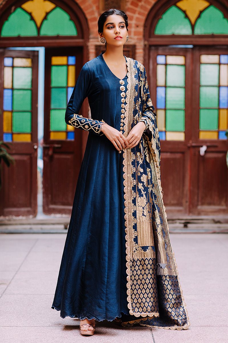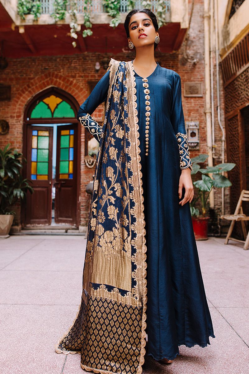 Flawless lengthy mineral white pure raw silk kalidar is a statement of purity. The thoughtful craftsmanship of tailor is witnessed while assembling the panels. This unadorned shirt compliments best with beautifully embellished sleeves comprising of pearls, cutdana, kora, dabka, nakshi, gota and resham flowers. To complete off the look same color semi pure pants and pure chiffon ivory dupatta to be purchased at additional cost.
