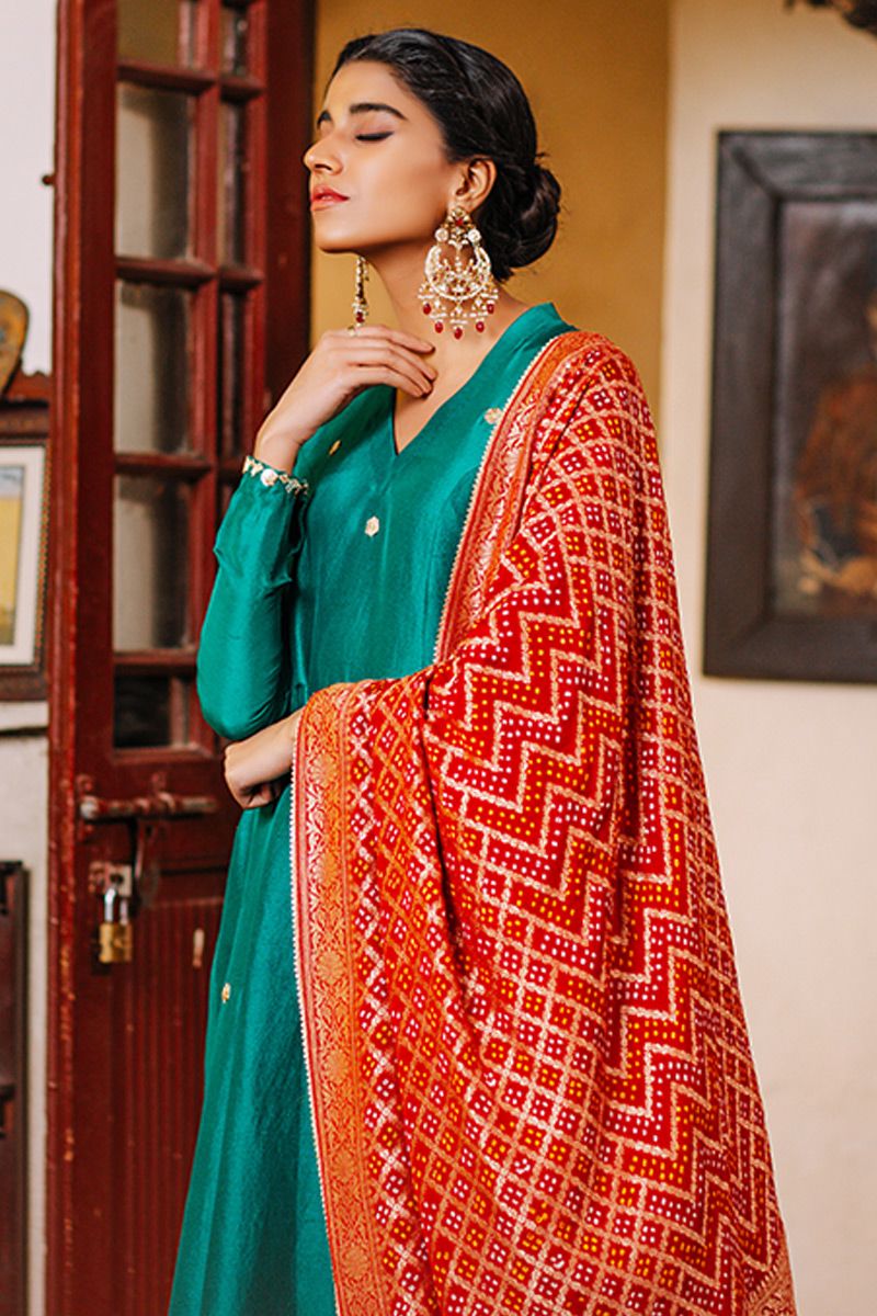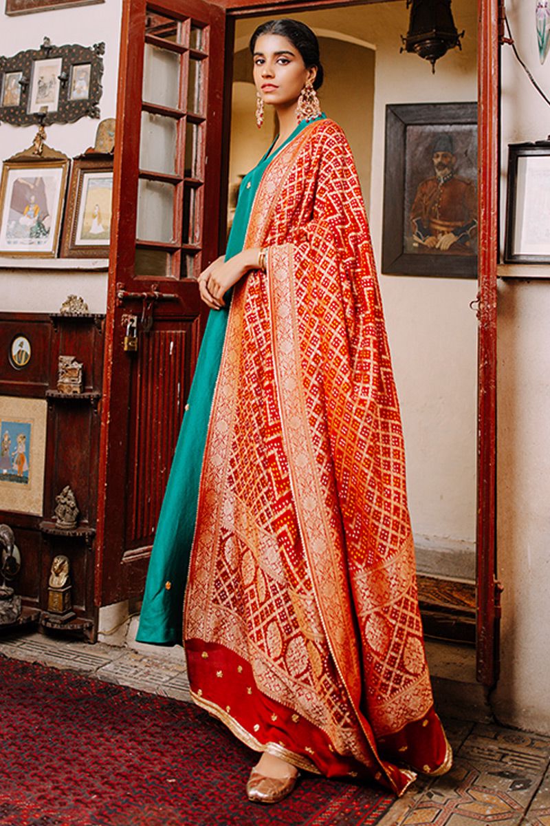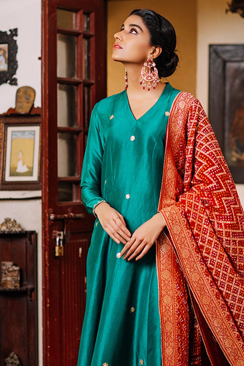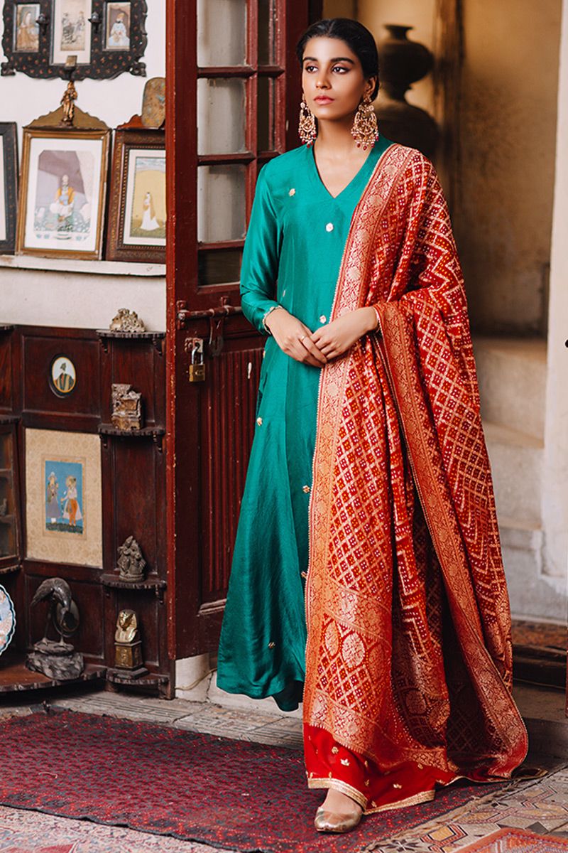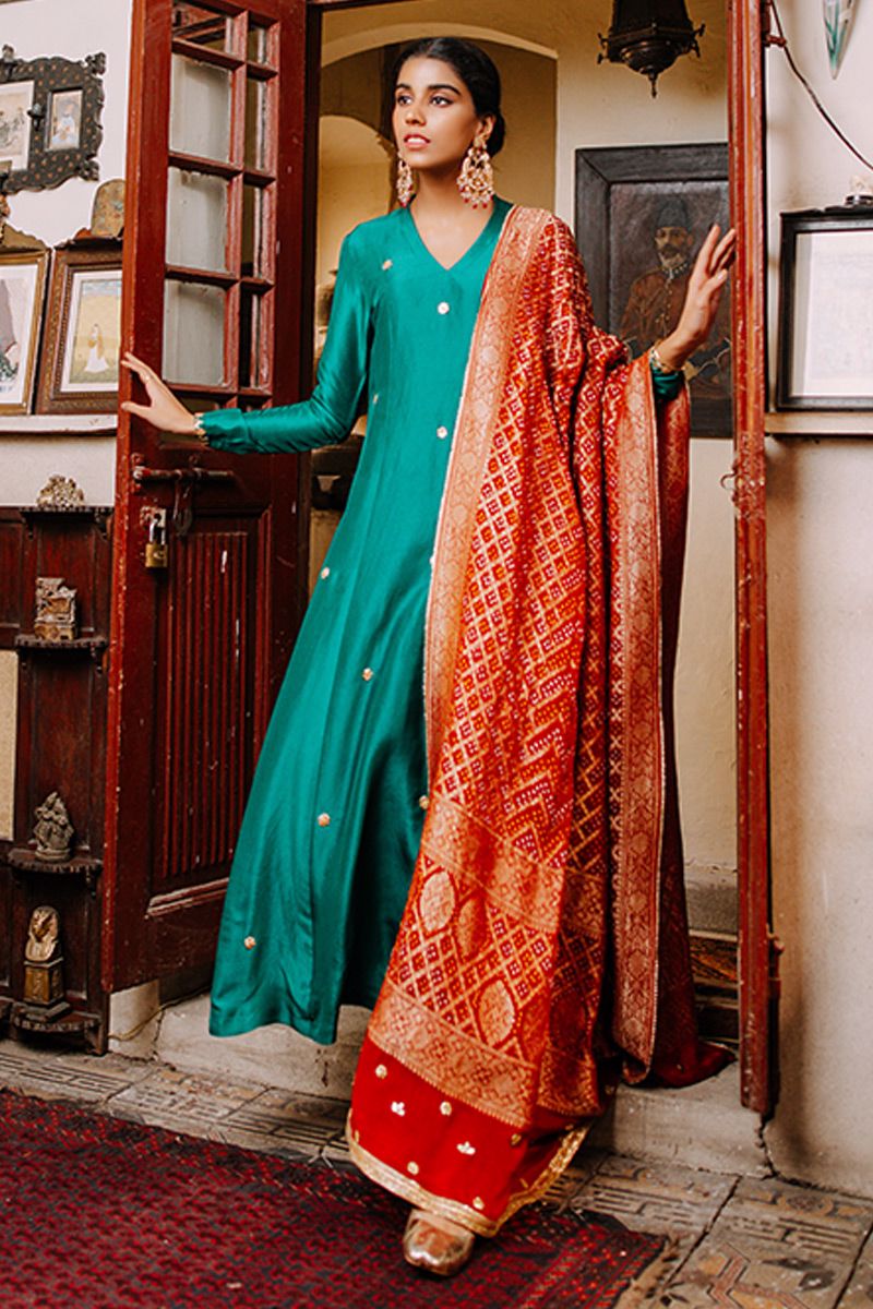 Green prince panel shirt with gota + Red ghar chola timeless pure raw silk shirt with gota motif scattered on the front. This simple silhouette is uplifted with red gaur chola dupatta creating a perfect ethnic neon. Worn with green color pure raw silk to be purchased at additional cost .