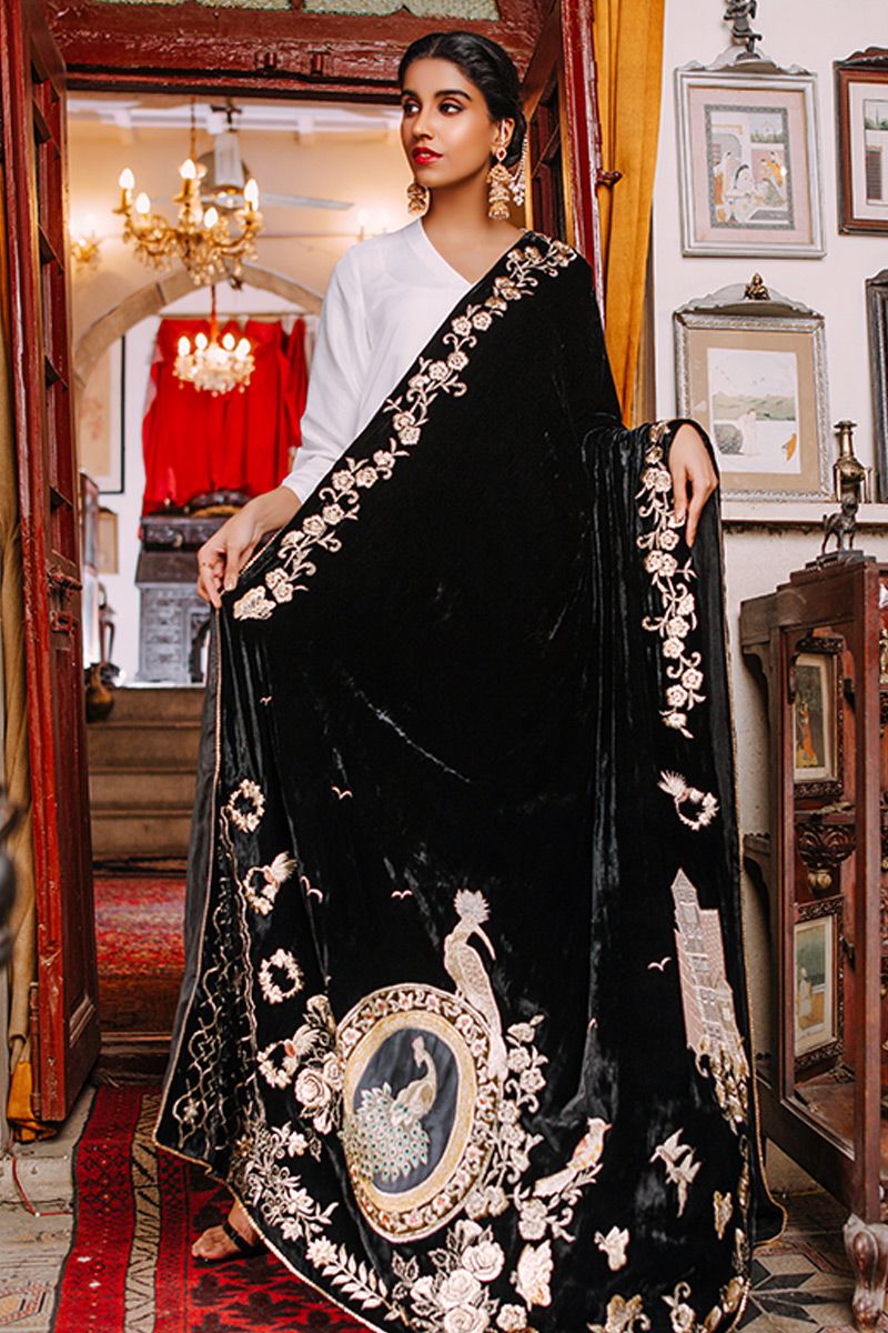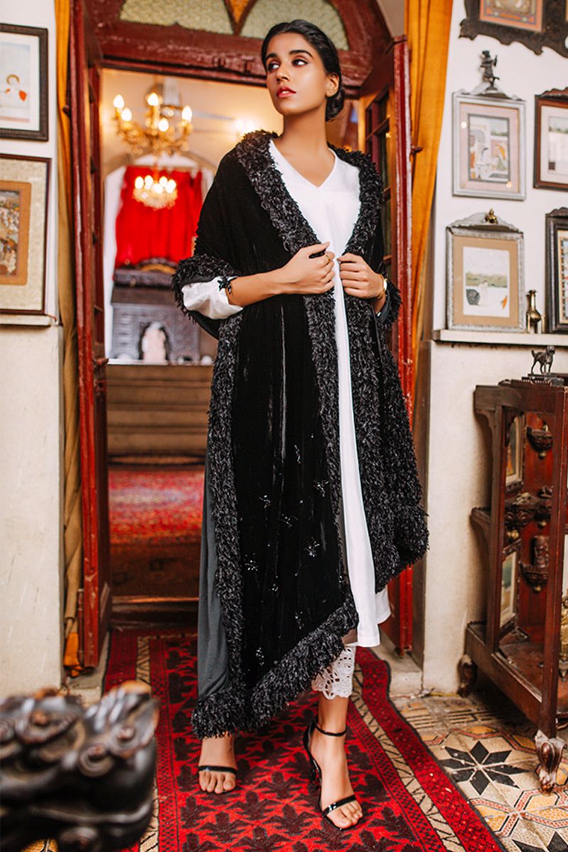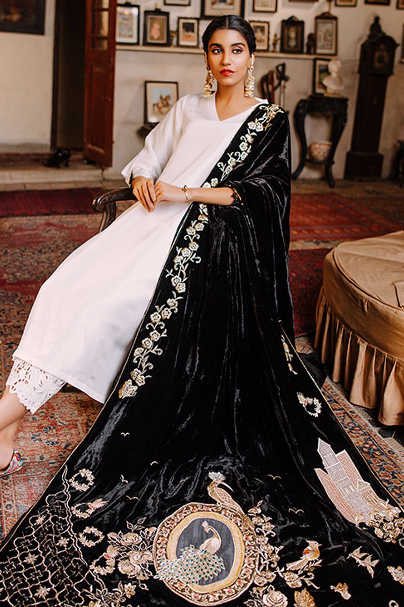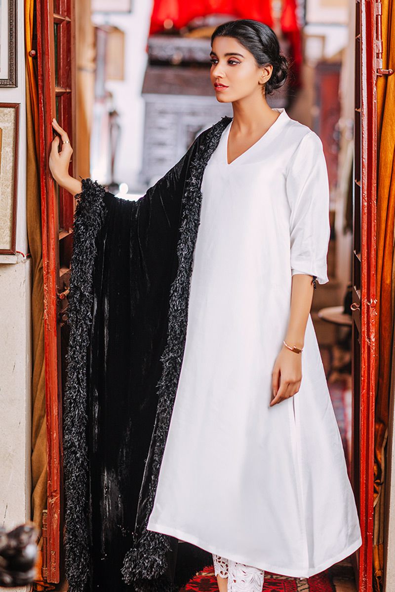 A classic ivory ensemble in A-line silhouette is incorporated with puff sleeves with a tiny adornment on the cuff. To finish off the look same color cutwork pants is paired and can be purchased at additional cost.
