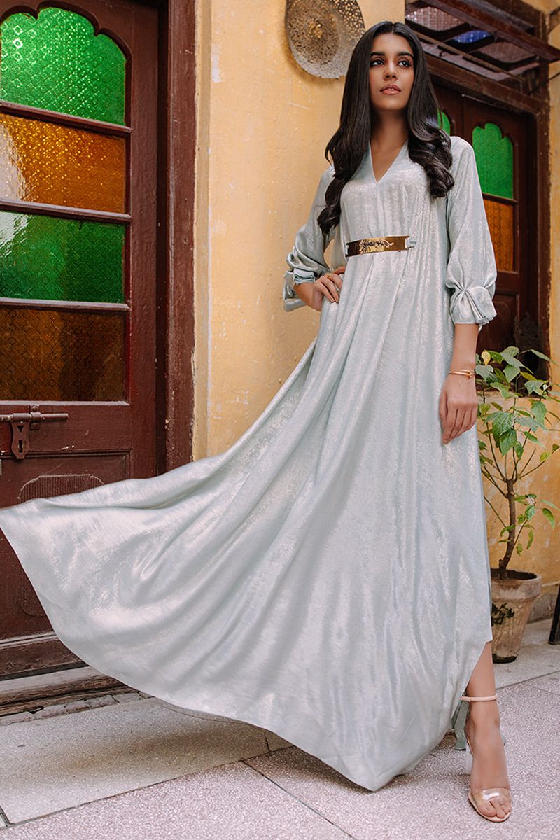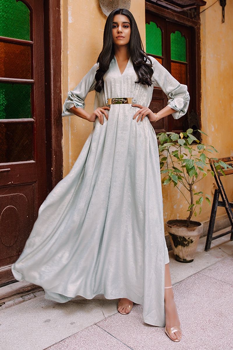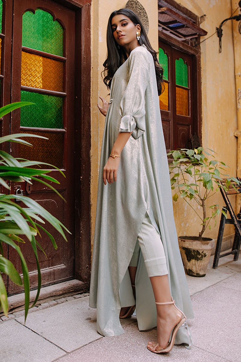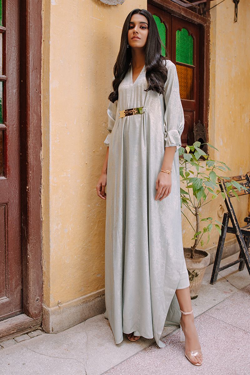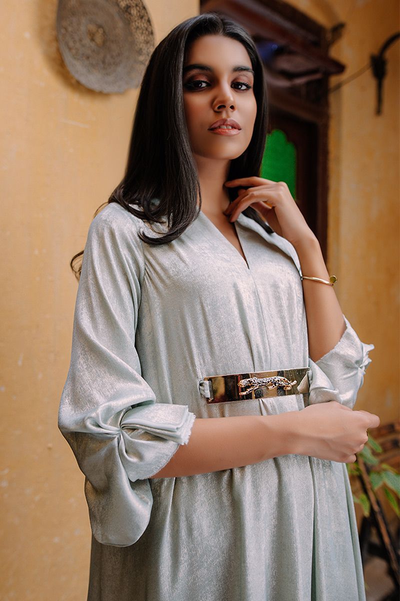 This mint lengthy outfit is a true retro throw back. The shiny fabric falls rightly on to the body, fastened with a metal belt on the waist. Details on the sleeves are not be missed. Same color stretchable pants are paired and can be purchased at additional cost price