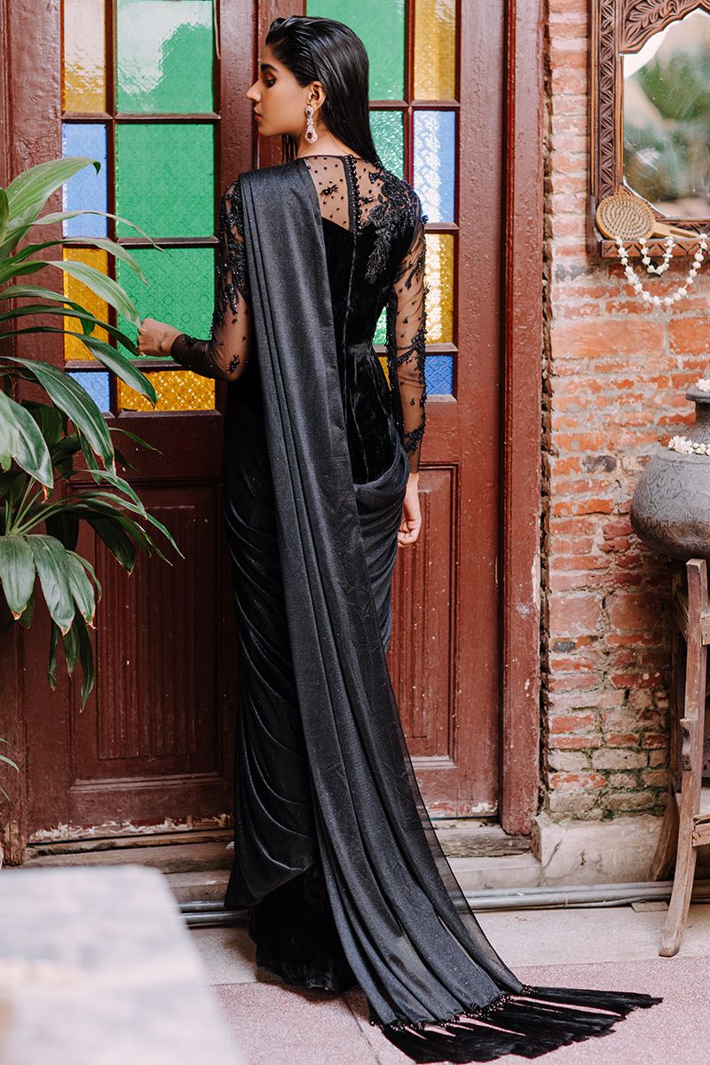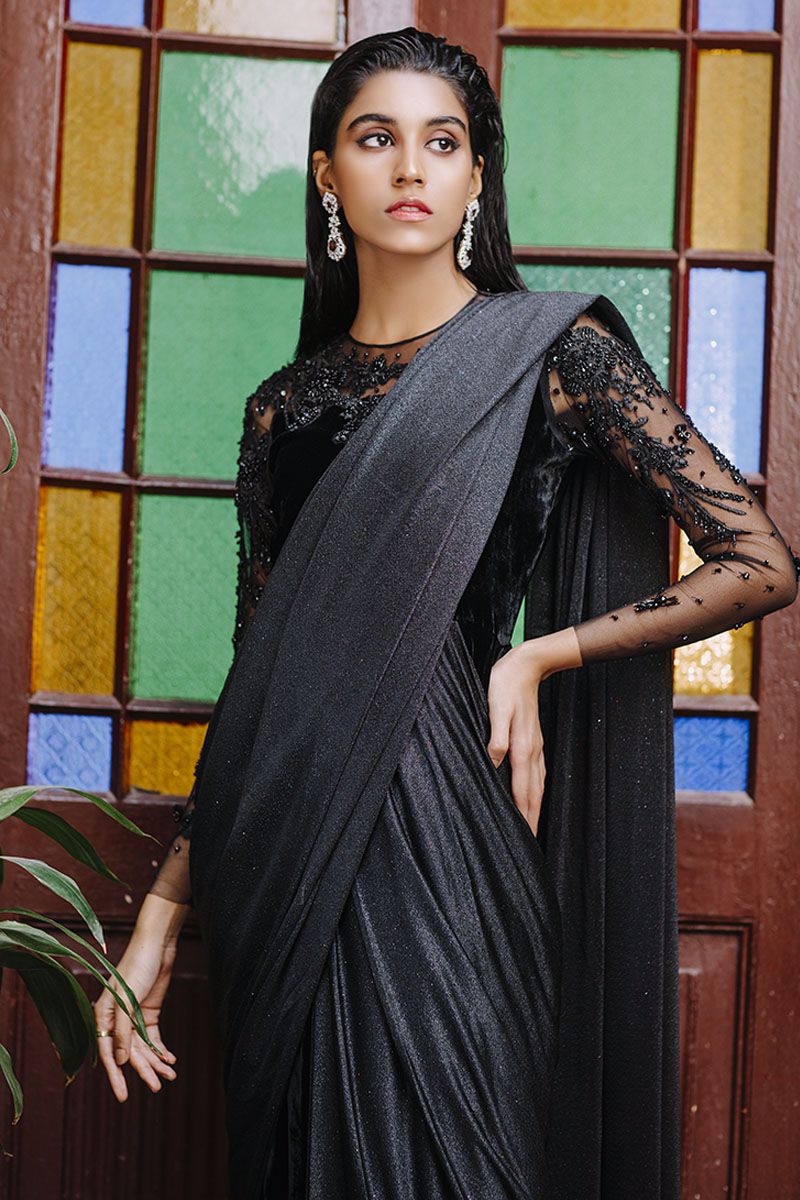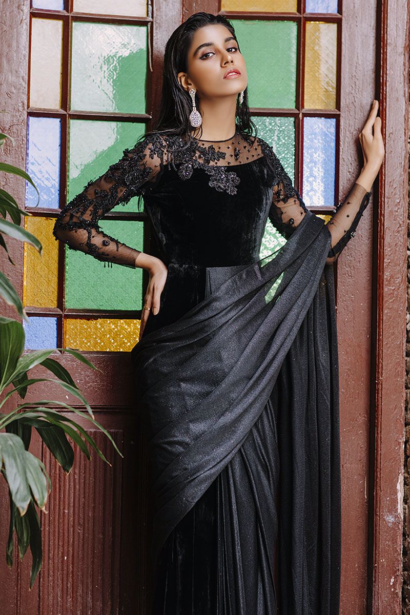 A sophisticated Black color comprising of pure georgette and moonlight fabric. The bodice is incorporated with sheer net in yoke and sleeves with adornments of pearls, stones, resham, kora, dabka and crystal hanging .