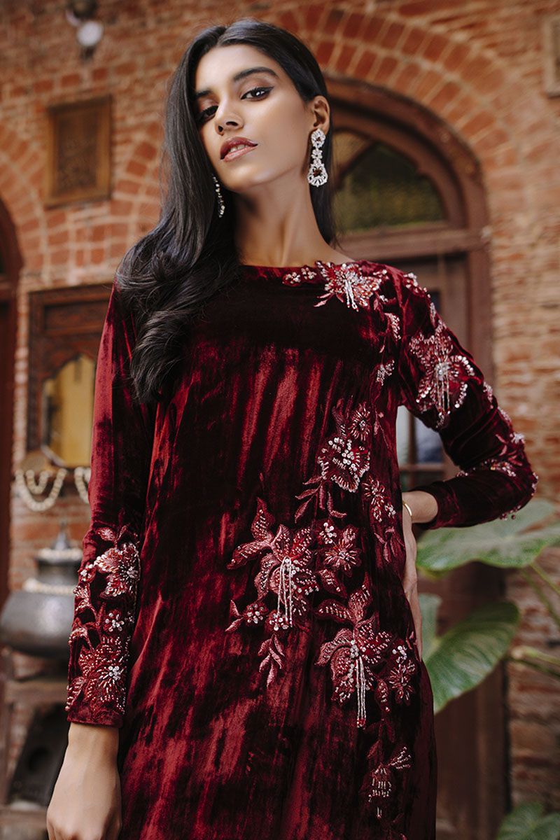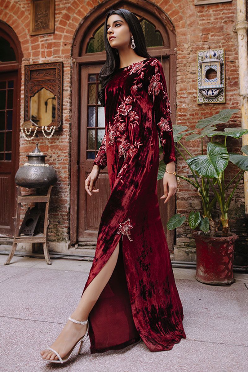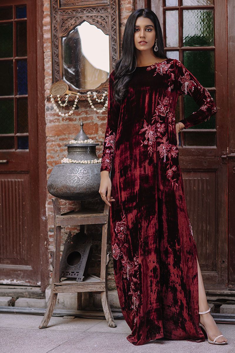 Maroon always being a classic once again stands out in the crowd same as this maroon velvet kaftan is stare worthy. The ivory resham and bead work is placed carefully forming a soothing eye movement on side front and sleeves.