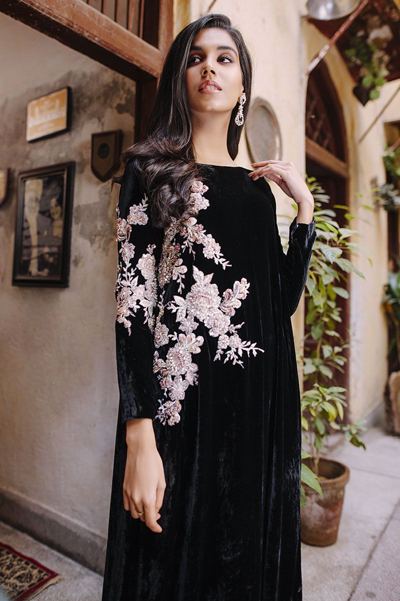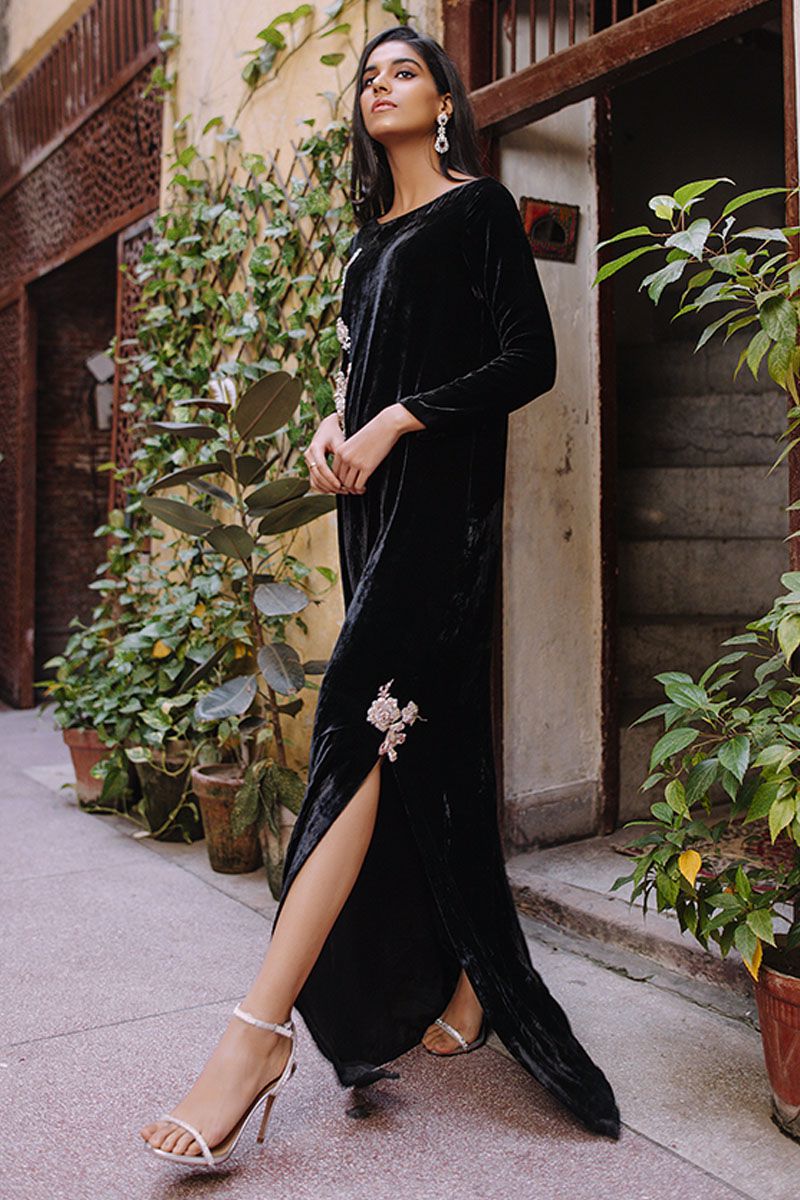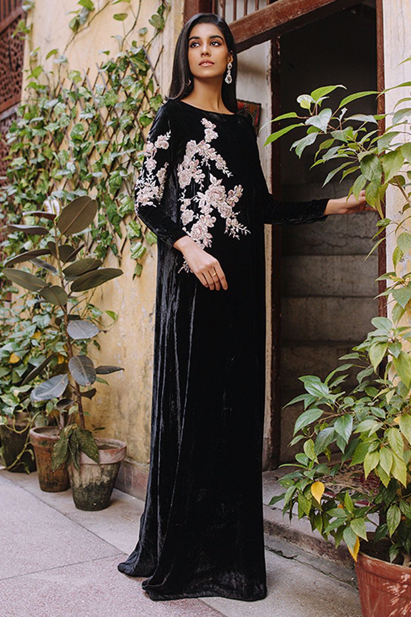 Black always being a classic once again stands out in the crowd same as this black velvet kaftan is stare worthy. The ivory resham and bead work is placed carefully forming a soothing eye movement on side front and sleeves.