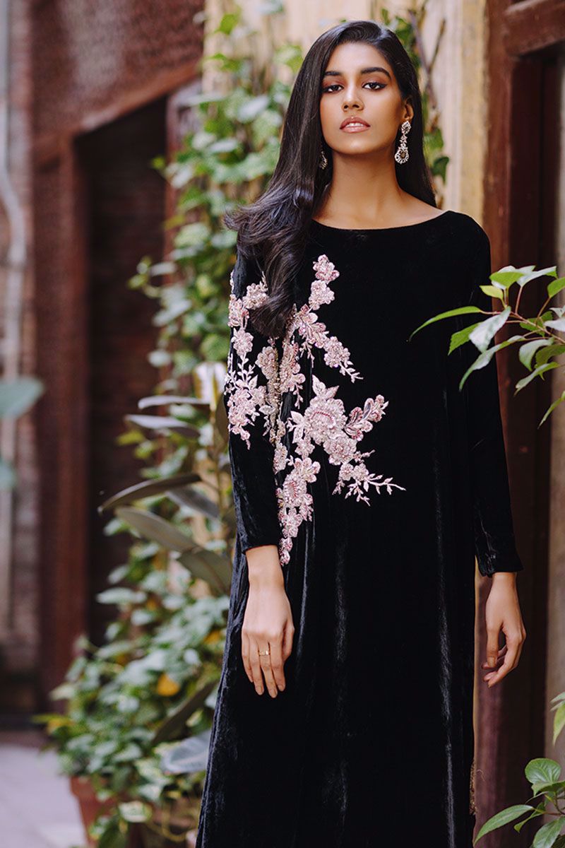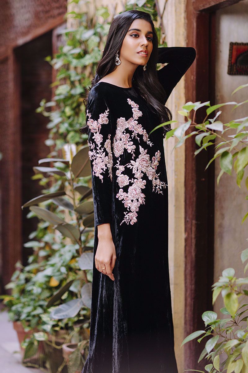 Black always being a classic once again stands out in the crowd same as this black velvet kaftan is stare worthy. The ivory resham and bead work is placed carefully forming a soothing eye movement on side front and sleeves.