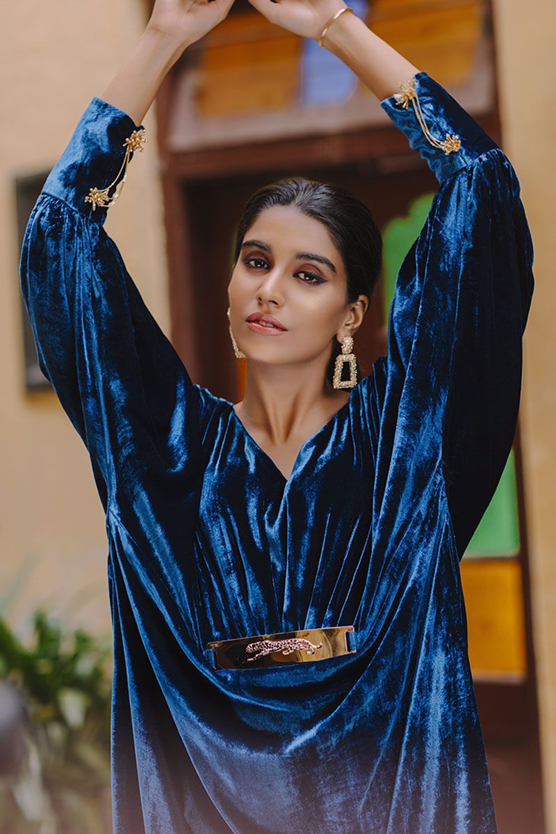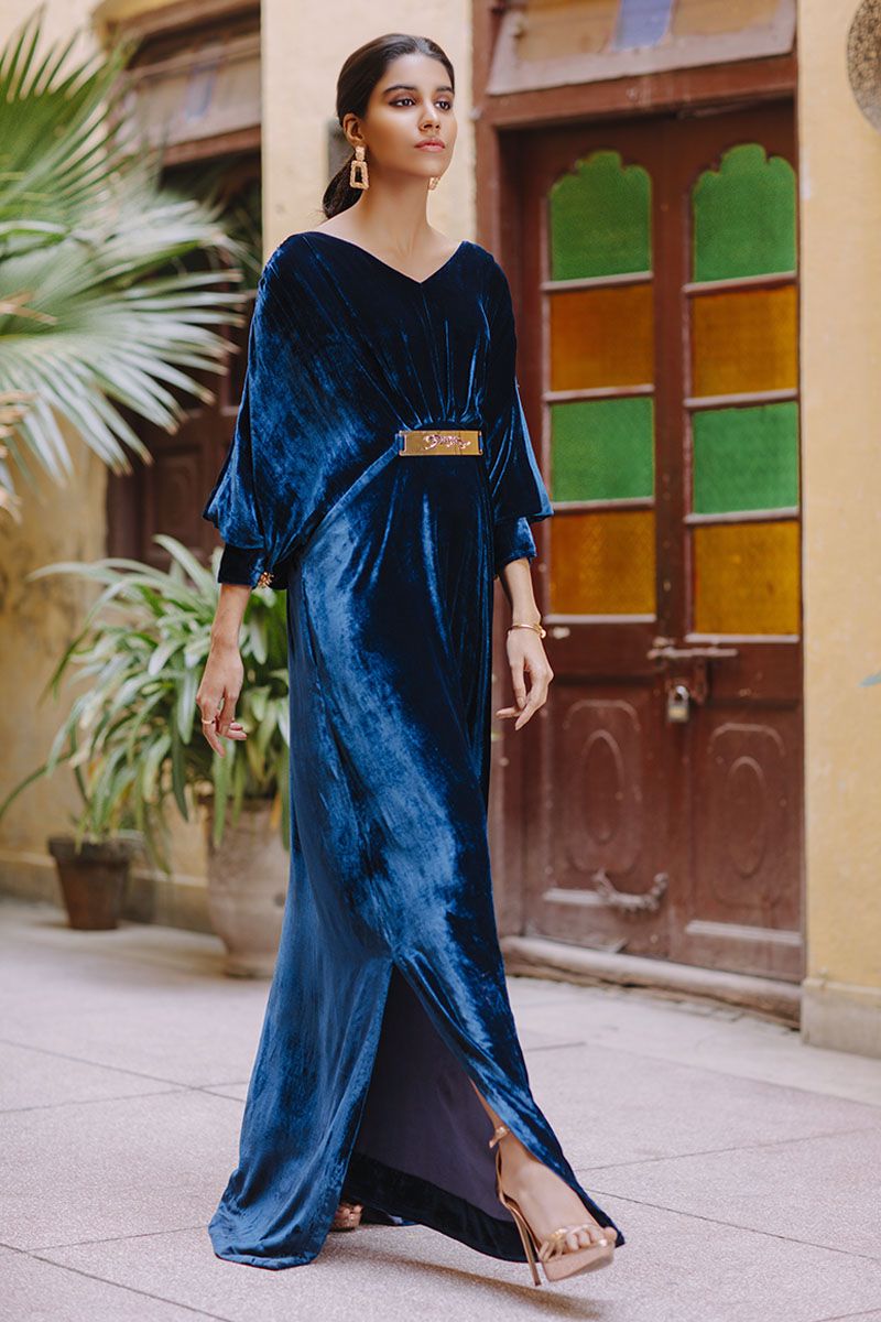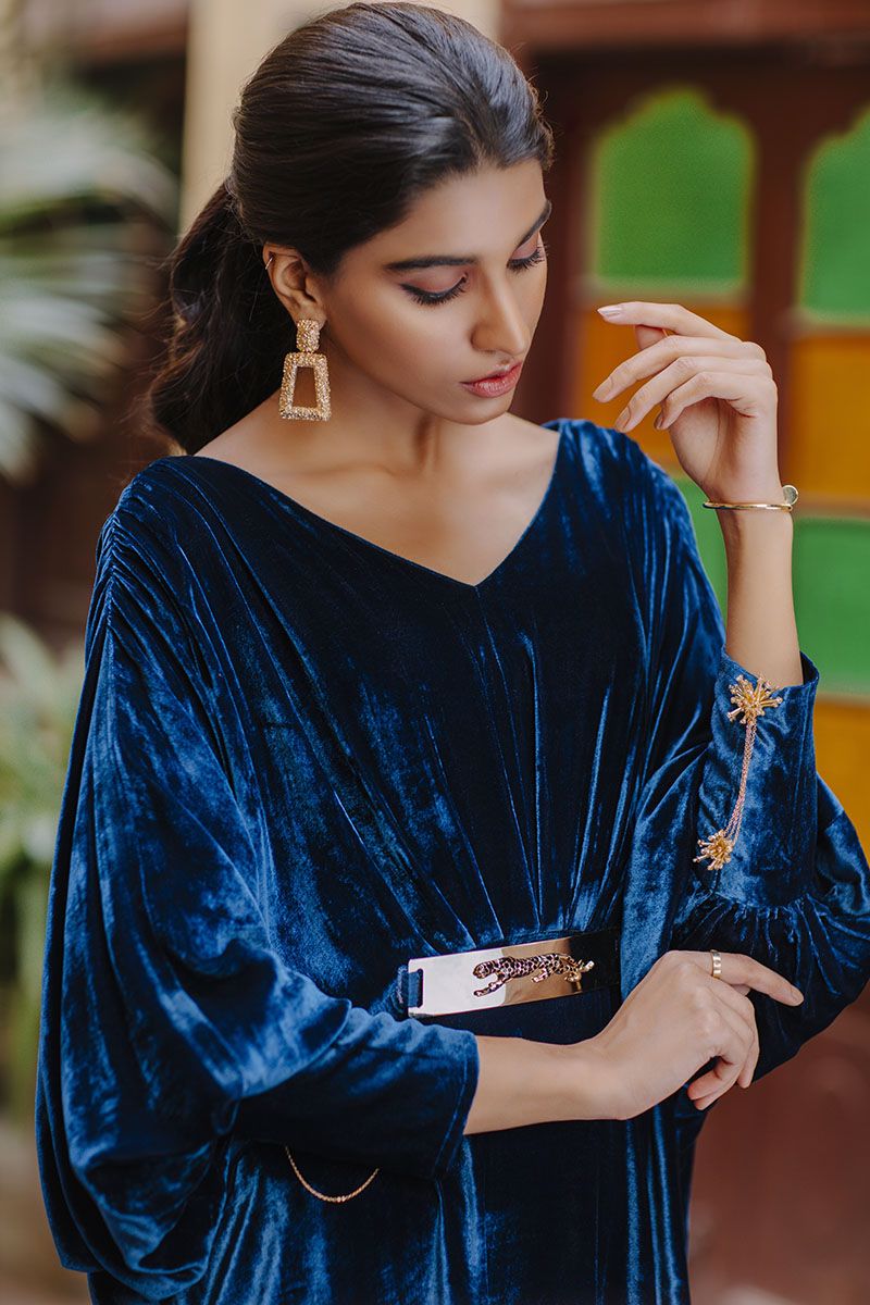 An arabic night glam! This velvet seaport kaftan hold the pleats on front an back with metal adorned leopard belt giving a sleek look to the body.