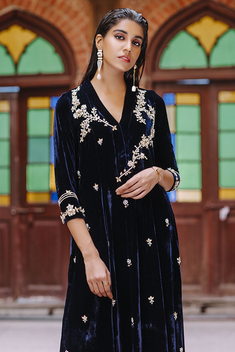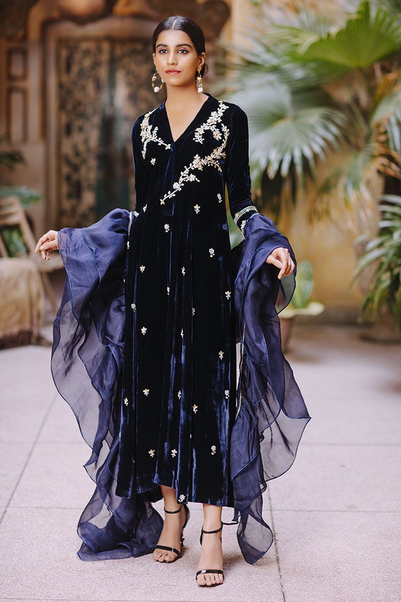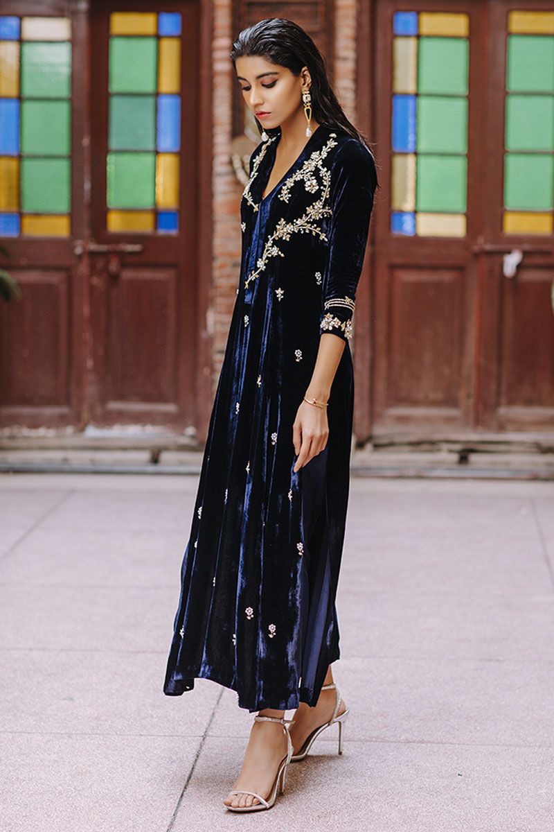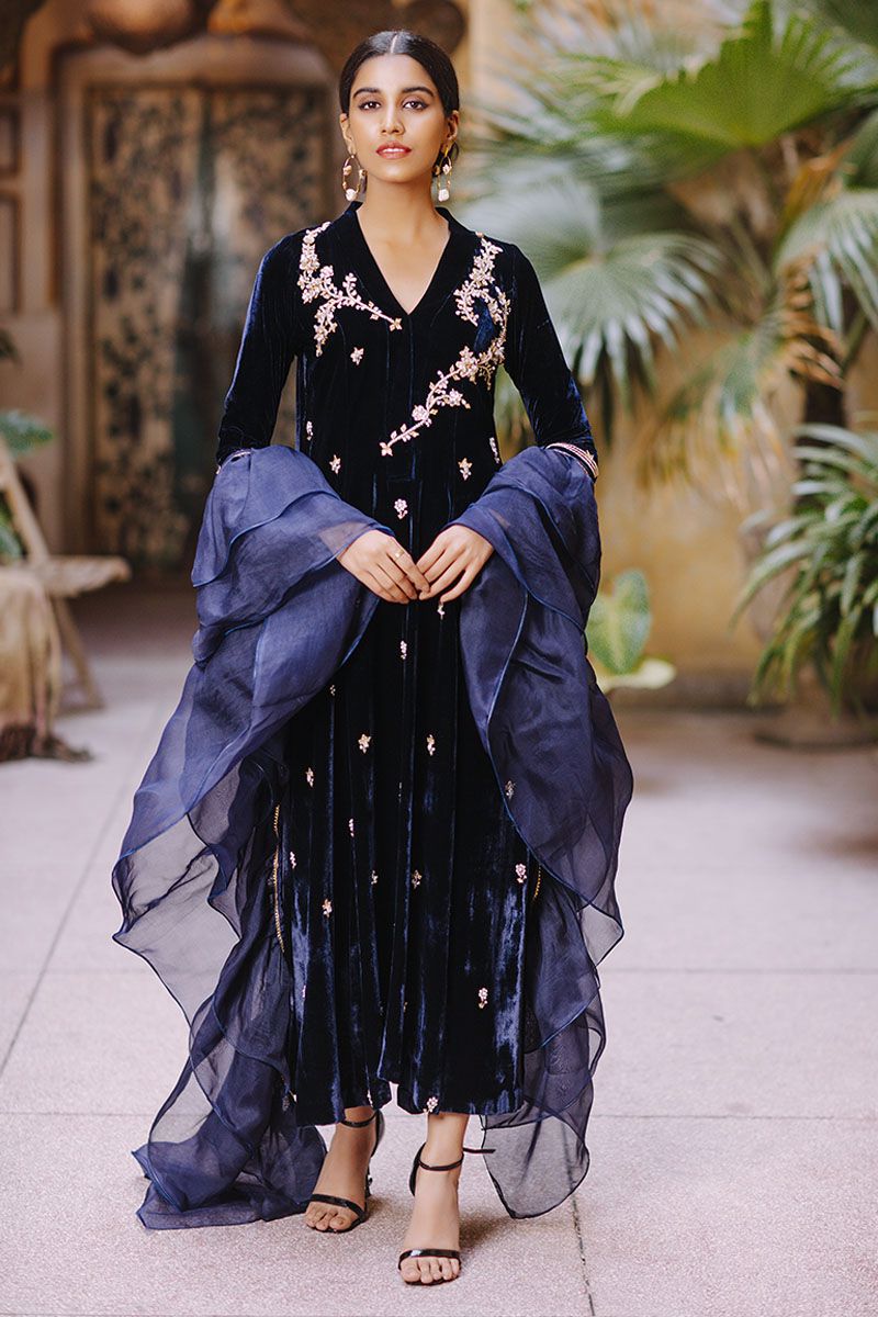 This customary long kurta is uplifted with contemporary embellishments from english gardens each stem and flower is given a 3 dimensional appearance with crystals, goat and pearls. Same method is achieved in scattered motif on front and sleeves. To finish off the look same color pure raw silk pants and organza frill dupatta and can be achieved at additional cost.