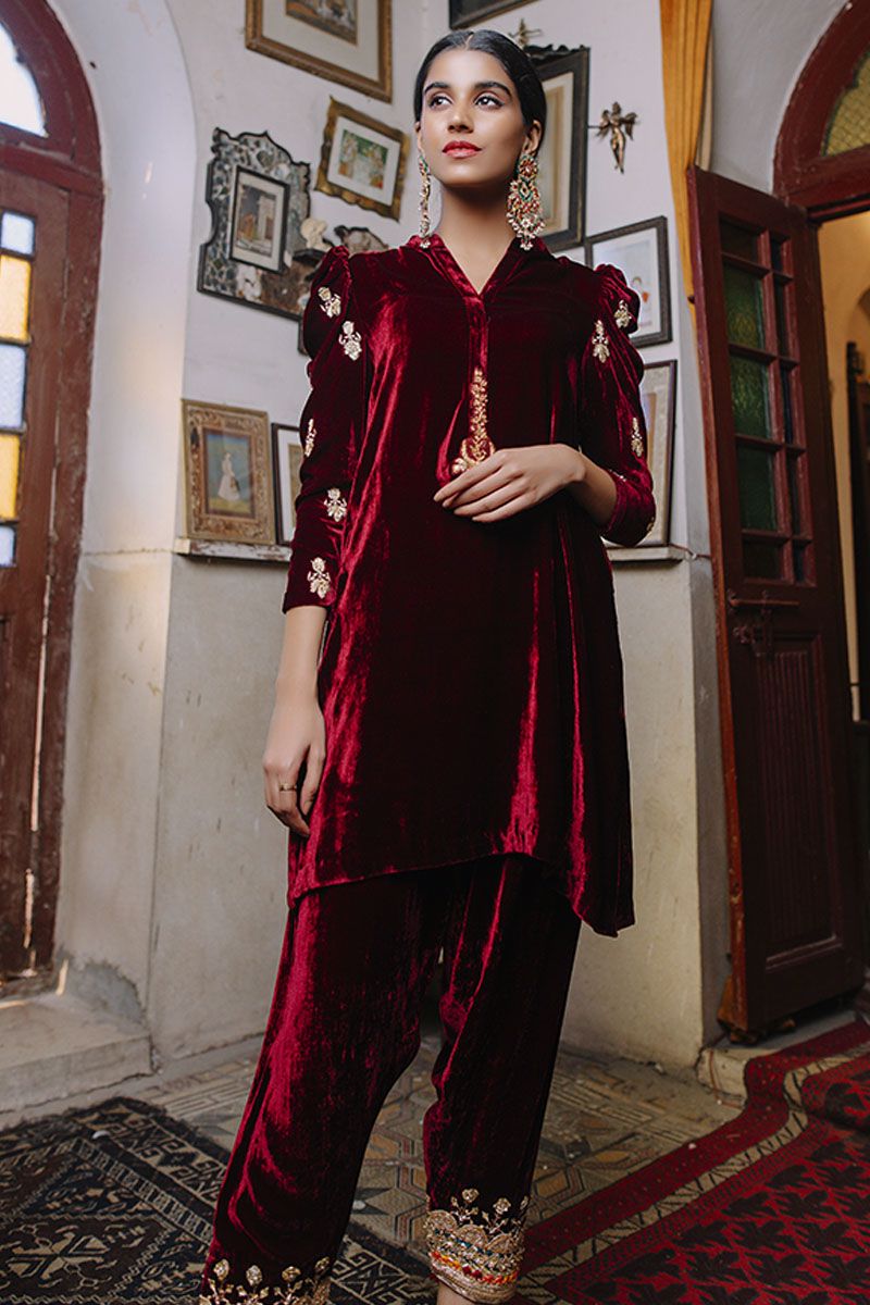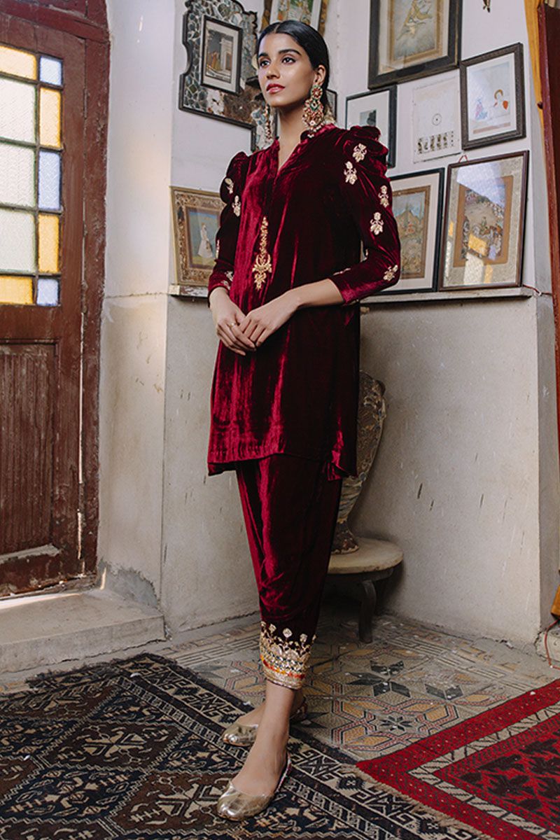 Traditional folks getting ready for winter wedding. This maroon velvet ensemble is perfect! Featuring dainty gold hand work of gota, nakshi, zardozi tar, sequin and pearls on gala patti and puff sleeves. Maintaining the elegance same color velvet shalwar comprising of gold handwork along with hints of green, red and orange, to be bought separately.