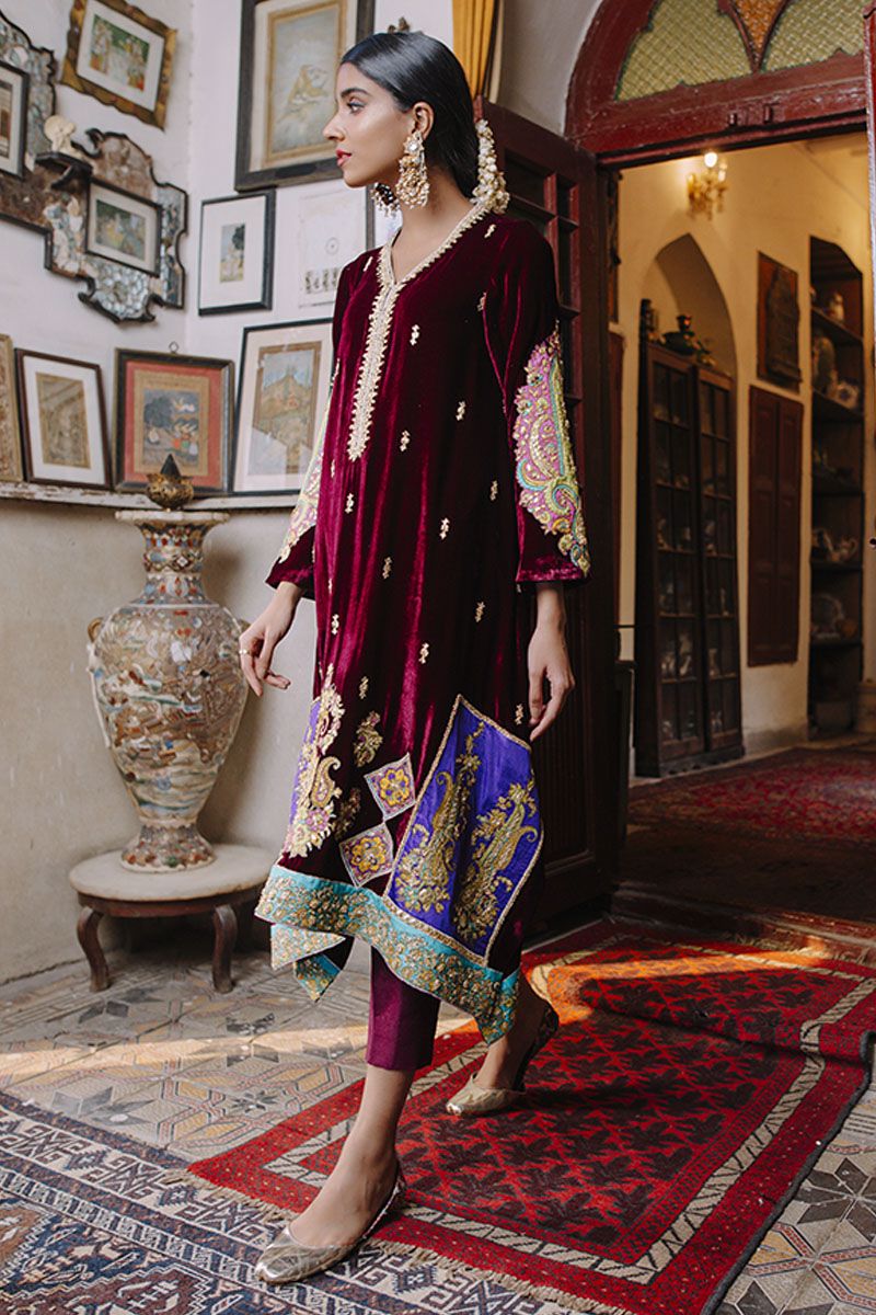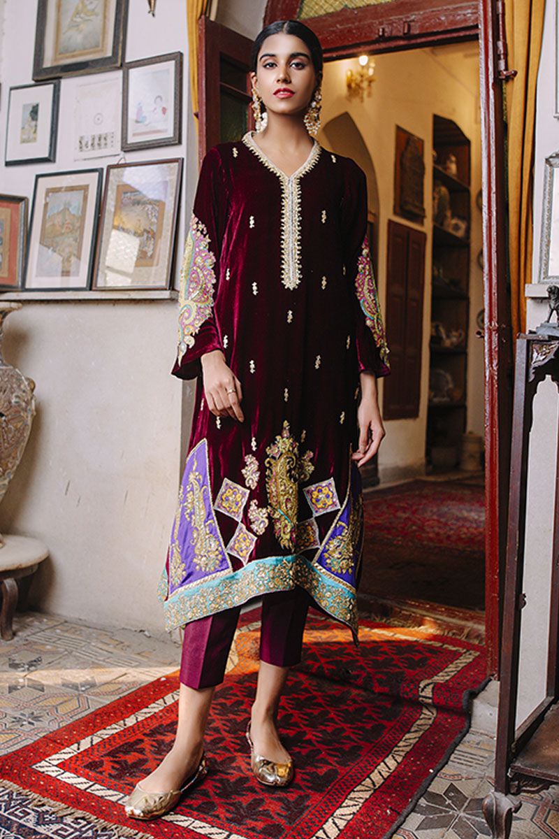A pop of colors in the gloomy nights of winter. This square cut plum velvet kurta defines true work of an artesian, blending fine handwork and bold flamboyant print together with zari, gota, nakshi and zardozi. To balance the look same color pure raw silk pants is paired and can be purchased at additional cost.