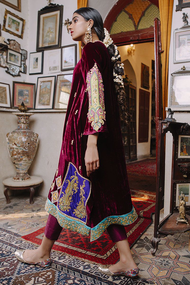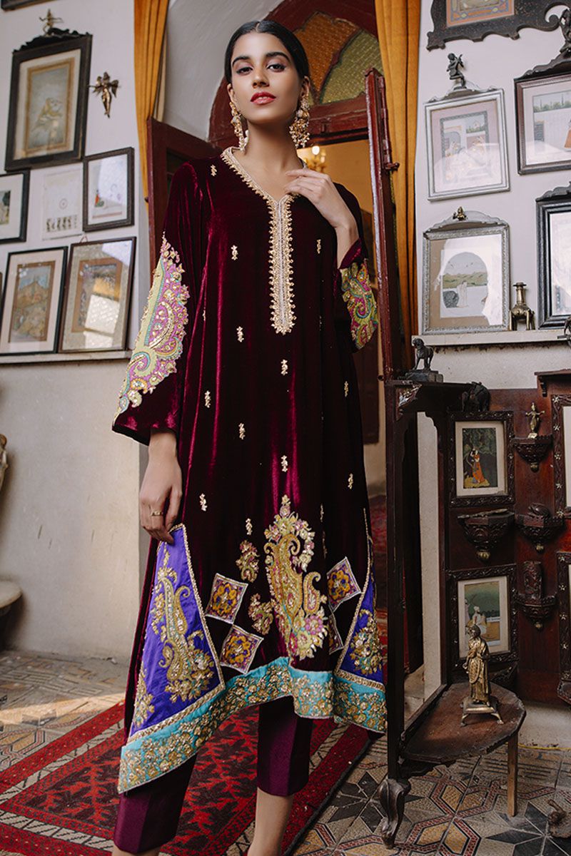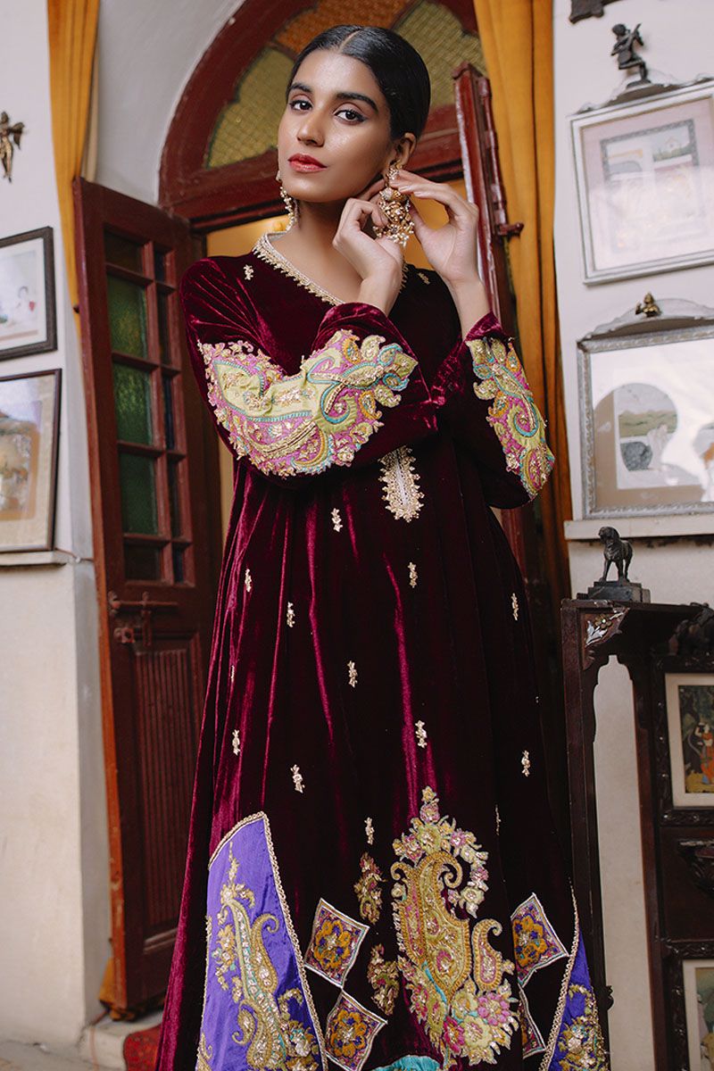 Color: Plum and can be customised in any color Fabric: Velvet Work Details: Embroidered